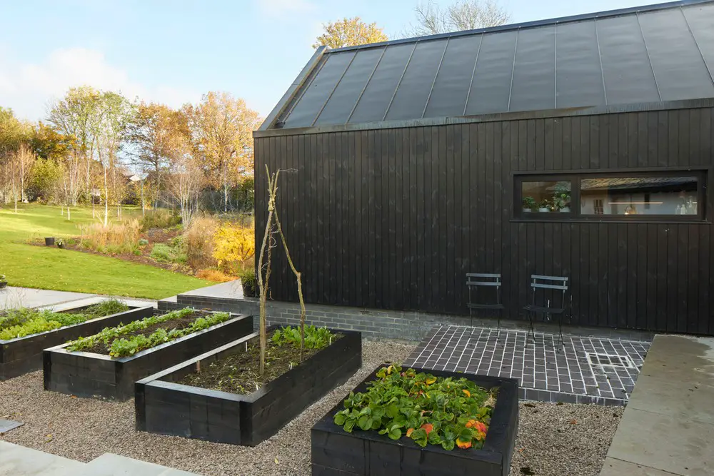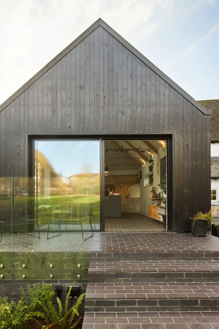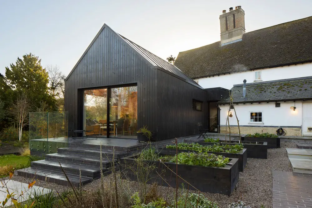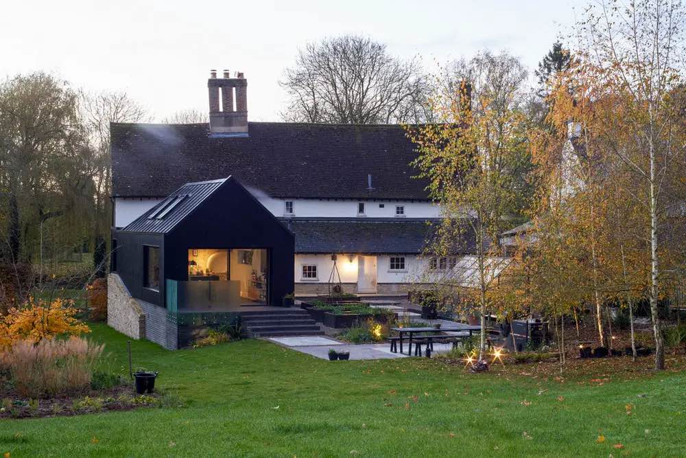 Nowa część domu została zaprojektowana w sposób, który nie konkuruje z oryginalną bryłą. Architekci z CDC Studio posadowili ją wzdłuż diagonalnej linii historycznego muru oporowego, co pozwoliło subtelnie połączyć stare z nowym i zachować równowagę w krajobrazie wsi. Tak powstała forma z dachem naczółkowym i szczytowym, obłożona pionowym czarnym drewnem i przykryta dachem z ciemnego cynku. Kontrast między nowoczesną estetyką a historyczną tkanką jest wyraźny, ale zarazem pełen szacunku dla kontekstu.