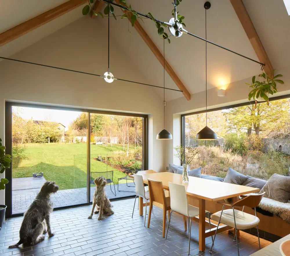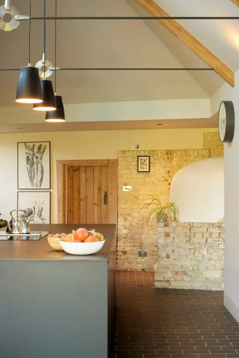 Nowe wnętrza łączą inspiracje stylem skandynawskim z nowoczesną prostotą. W kuchni pojawia się dębowa zabudowa wykończona matową czernią z nanolakierem i smukły blat z Dektonu. Podłoga wykonana z cegły Ketley, inspirowana londyńskim Barbicanem, płynnie przechodzi z wnętrza na podniesiony taras i dalej do ogrodu.