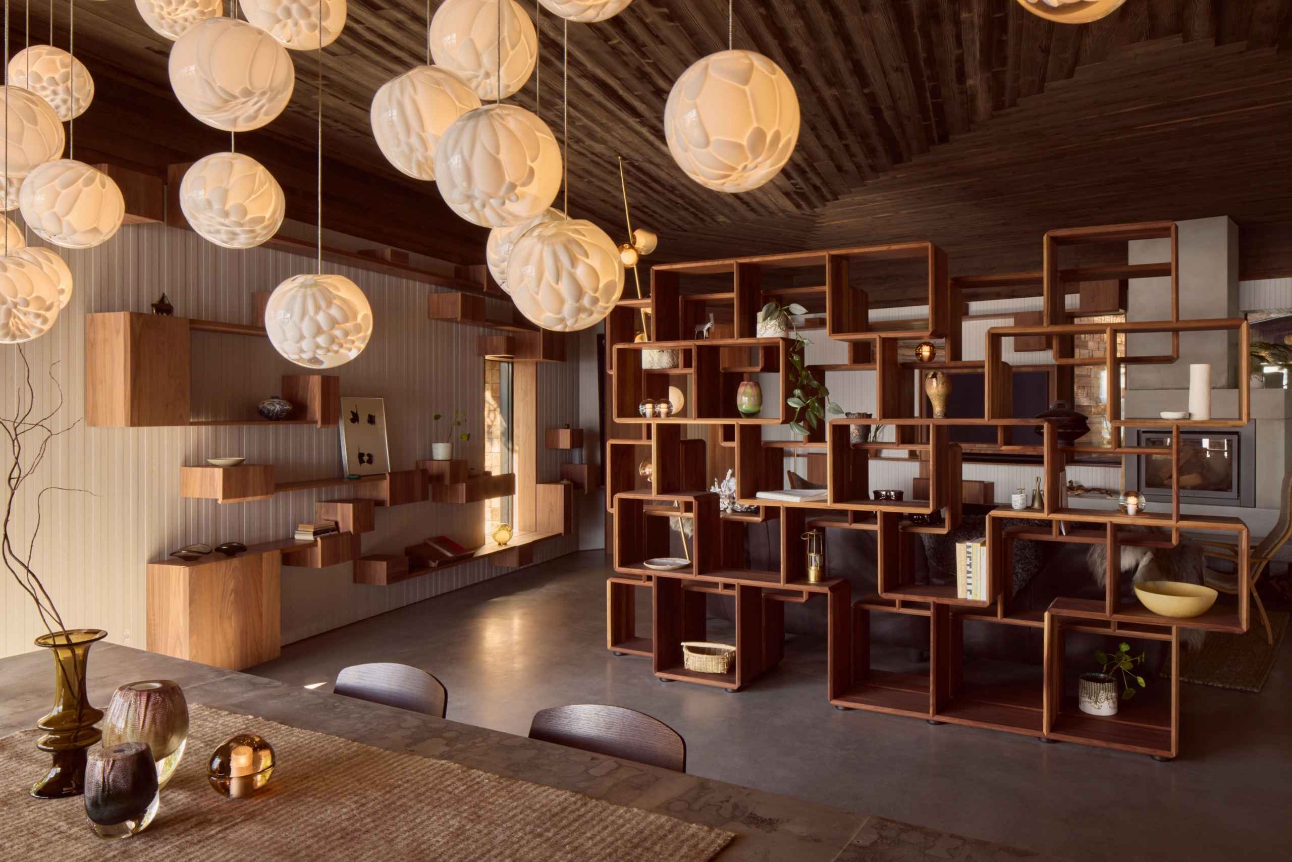 Układ funkcjonalny został zaprojektowany tak, by był elastyczny i wielowymiarowy. Główne skrzydło mieści salon, kuchnię i zawieszoną nad wąwozem sypialnię główną, z której rozciąga się widok na linię brzegową. Drugie skrzydło, bardziej kameralne, kryje łóżka w zabudowie i wysuwane miejsca do spania dla gości. Każda z tych przestrzeni posiada własną zewnętrzną „strefę pokoju”, tworząc harmonię pomiędzy wnętrzem a krajobrazem.