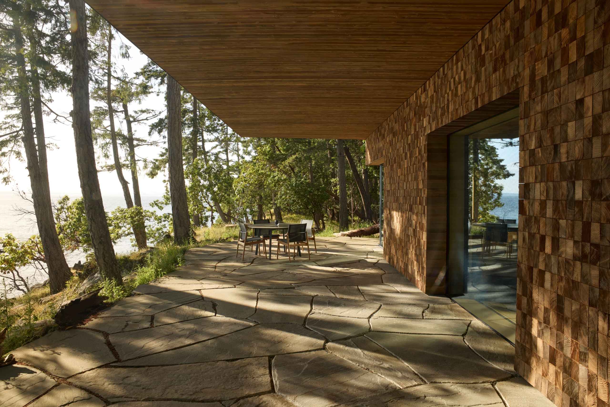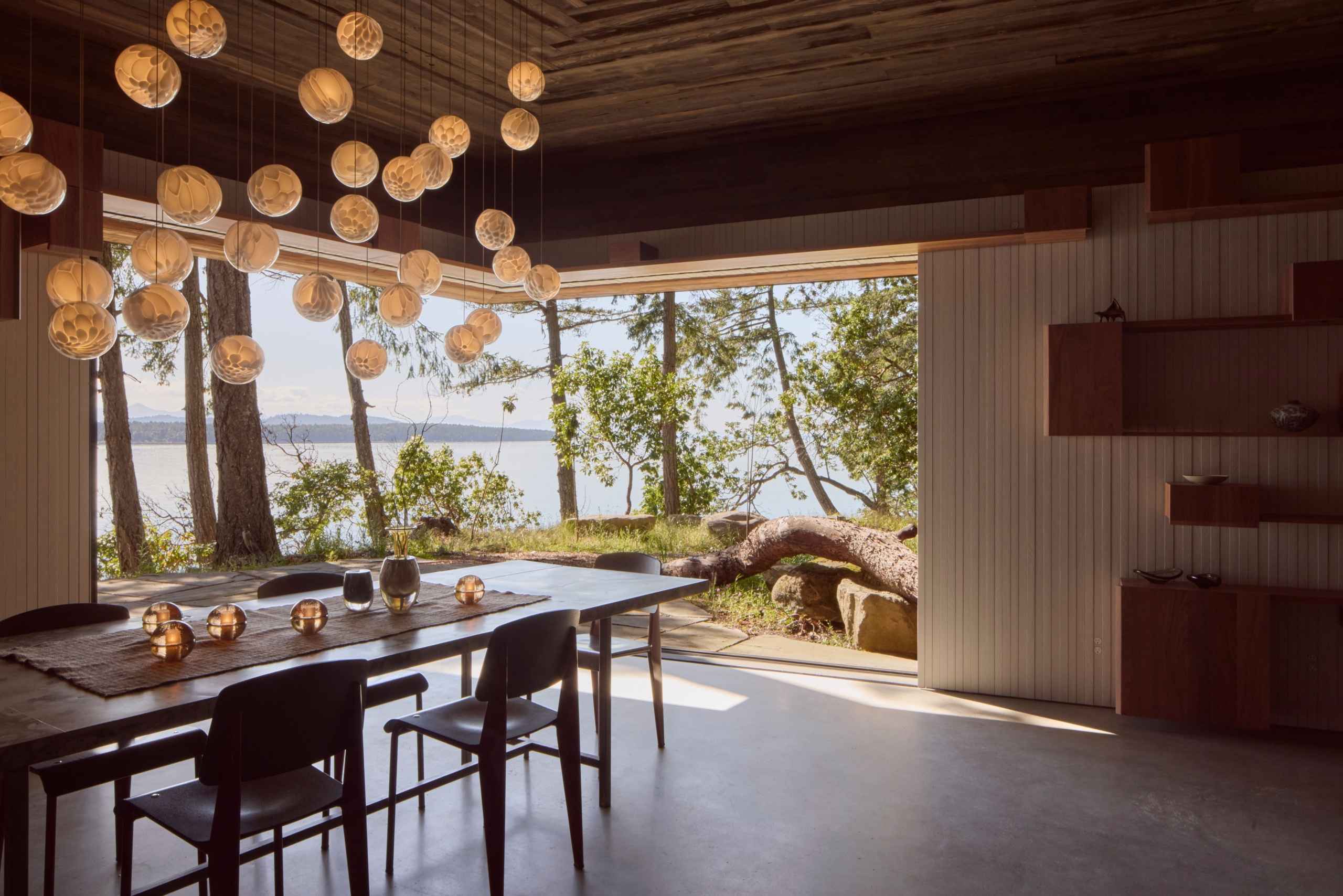 Światło, wnikające przez ukryte listwy i półki, ożywia piaskowaną powierzchnię cedrowego sufitu, podkreślając jego teksturę i naturalne odcienie. Z zewnątrz dom pokryto materiałami, które z biegiem lat pięknie patynują, przybierając srebrzyste tonacje dopasowane do mgieł Pacyfiku.