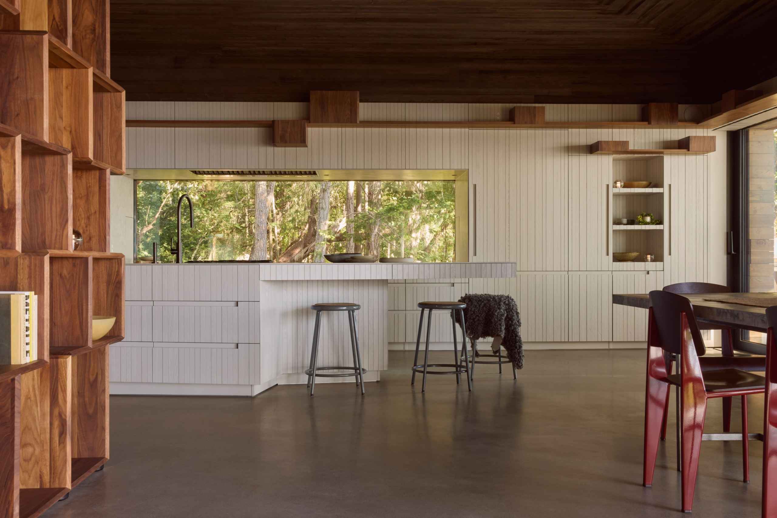 Wnętrza Bridge House 91.0 są warstwowe niczym las. Dominują tu naturalne materiały – malowane pionowe listwy drewniane, reinterpretujące archetyp północnoamerykańskiej chaty w lesie. Zostały one zintegrowane z przeszkleniami, schowkami, roletami i moskitierami. Na tym tle pojawia się poziomy system z orzecha włoskiego, który łączy funkcję półek, zabudów i wnęk mieszkalnych – od łóżek piętrowych, przez nisze śniadaniowe, aż po strefę prania.