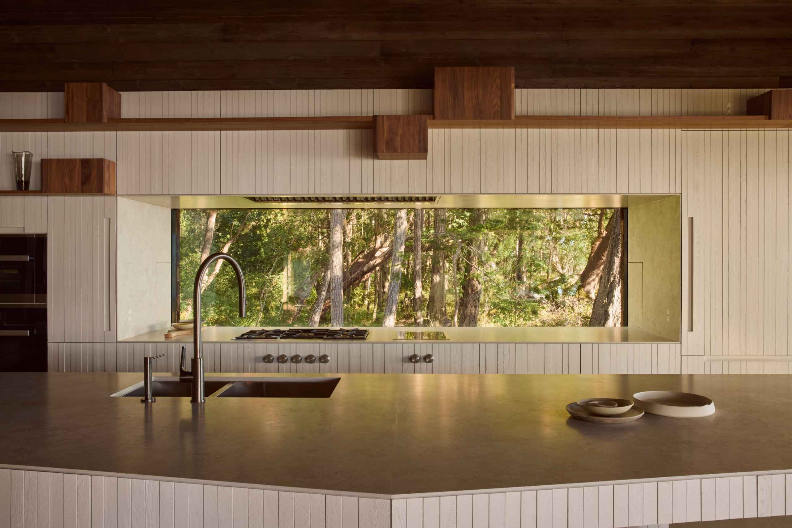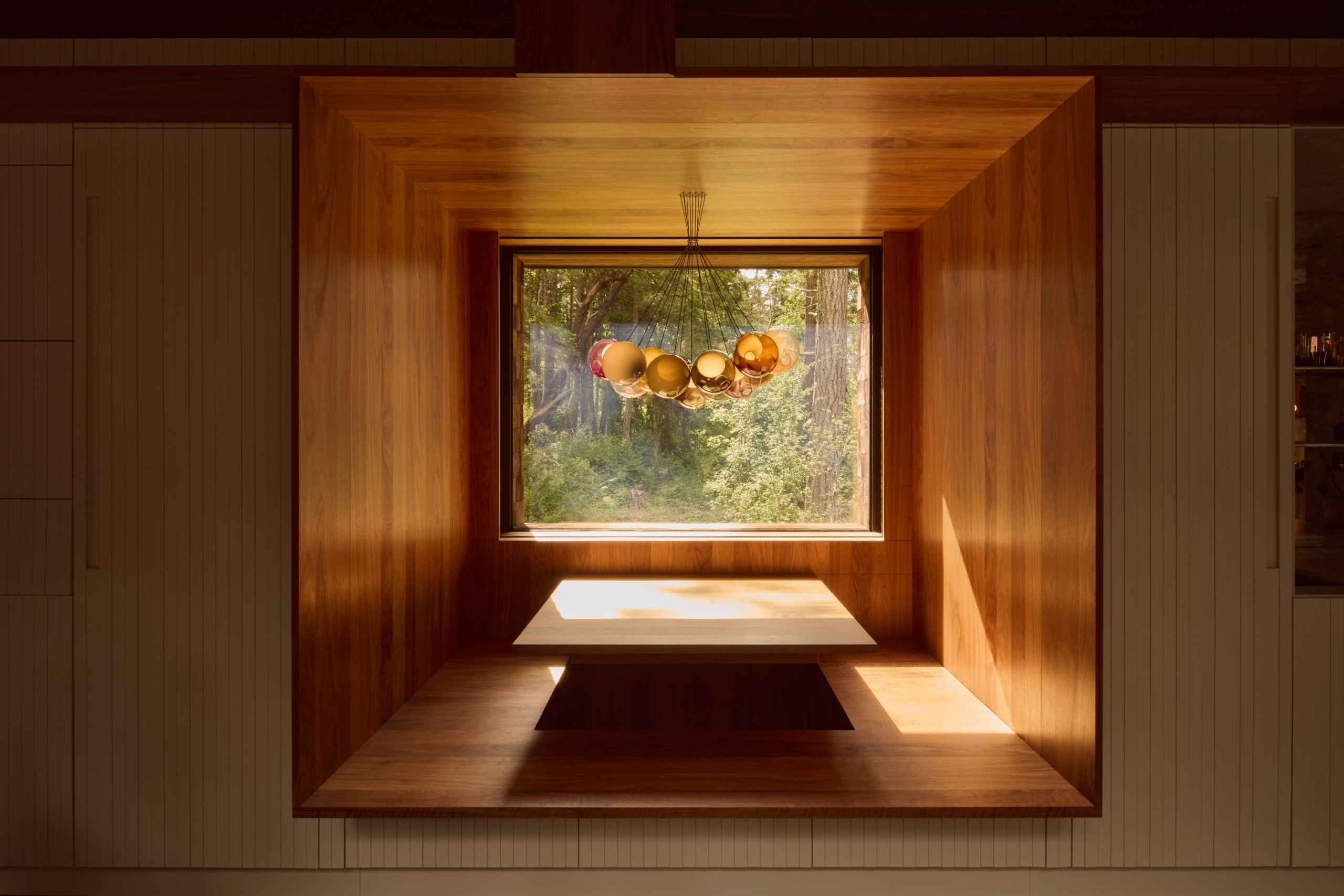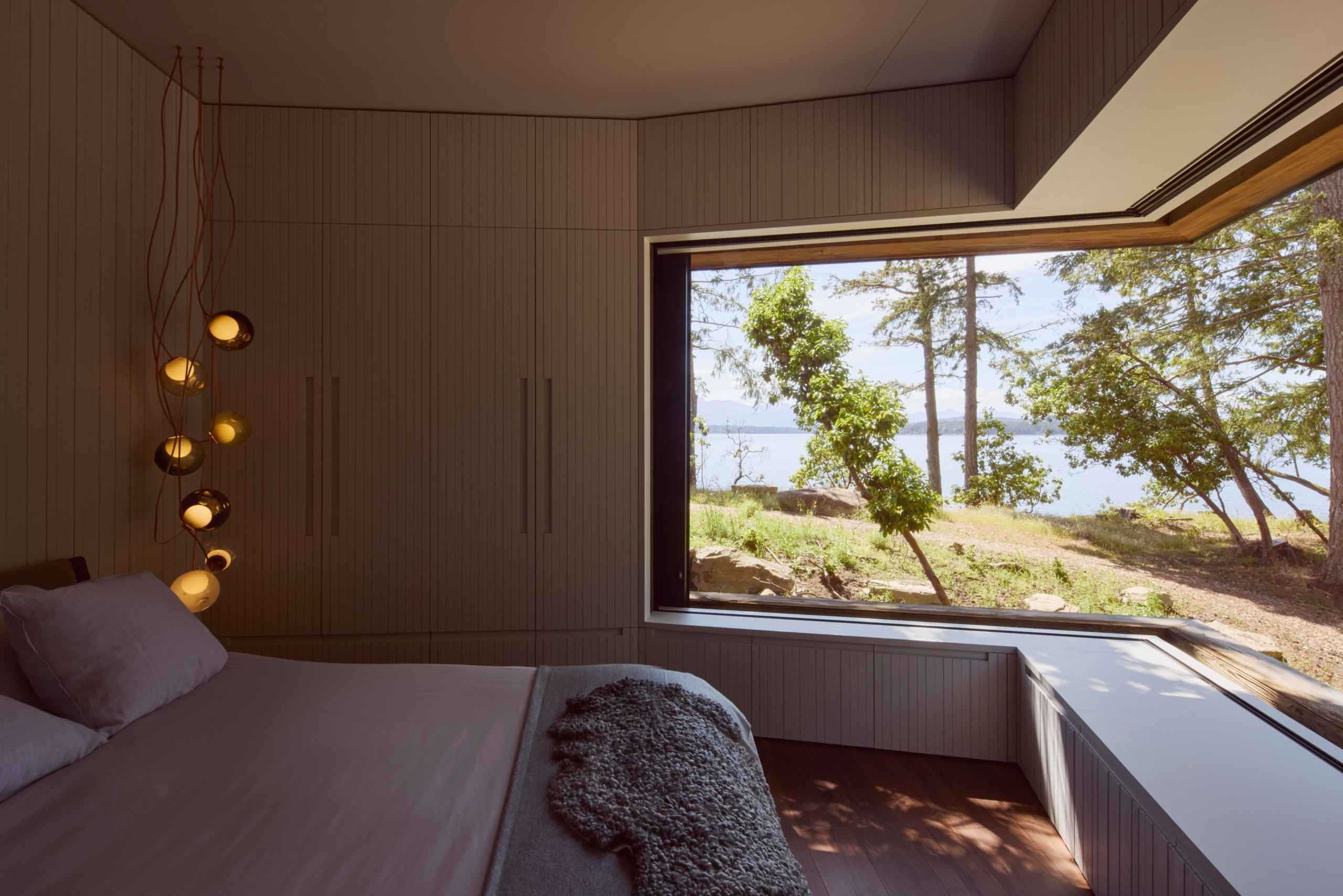 W sypialni głównej, za przesuwnymi panelami, ukryto panoramiczne okno z siedziskiem, z którego można obserwować przejście lasu w linię brzegu. To miejsce zawieszone między ziemią a niebem – swoista leśna kapsuła spokoju.