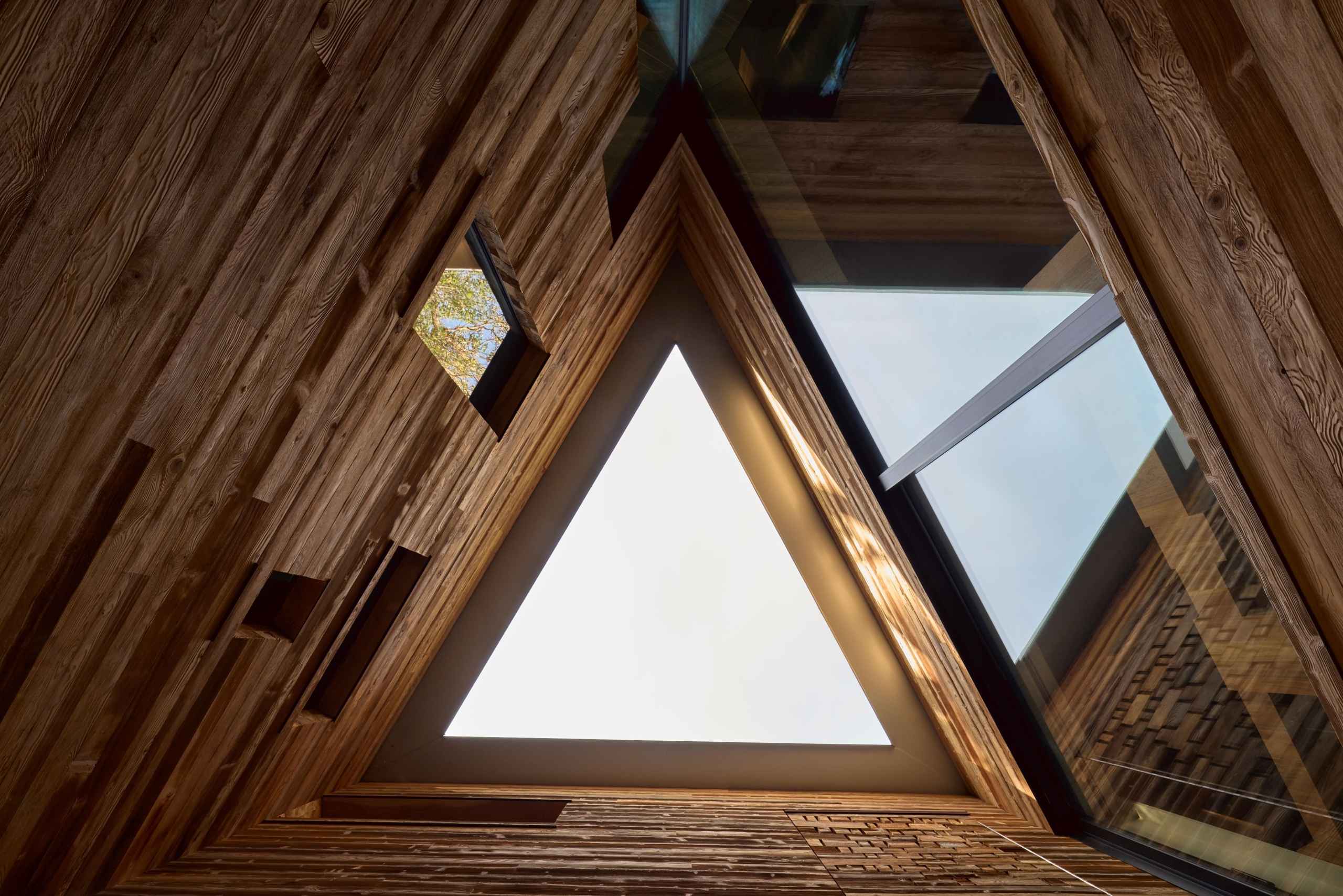 Kulminacją tej wędrówki jest główna strefa dzienna, otwarta na zachód i zalewana wieczornym światłem, które wnika głęboko w strukturę budynku. Pośrodku znajduje się trójkątny dziedziniec, otwarty ku niebu – w słoneczne dni wypełniony światłem, a podczas deszczu zamieniający się w naturalny kanał wodny, pozwalający doświadczać żywiołu w jego pierwotnej formie.