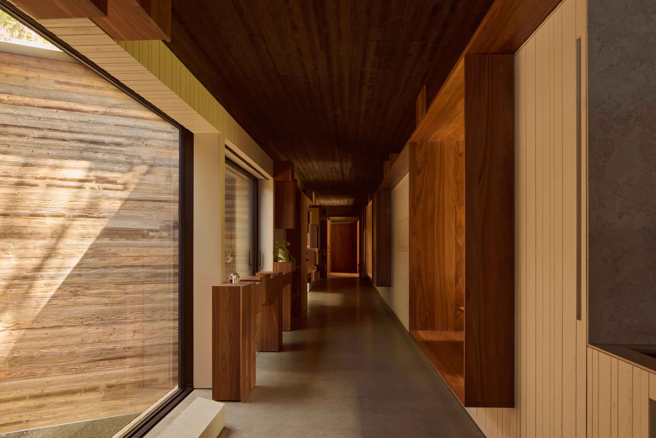 Każde pomieszczenie w Bridge House 91.0 ma swój odpowiednik na zewnątrz – tarasy i półotwarte przestrzenie, które pozwalają mieszkańcom pozostawać w ciągłym kontakcie z naturą. Wejście do domu prowadzi przez ukrytą w ziemi bryłę do długiego, liniowego korytarza, który – jak mówi Arbel – jest „kręgosłupem łączącym las, niebo i morze”. Przestrzeń ta prowadzi mieszkańca przez kolejne strefy: od mszystych skał i leśnych połaci, po koronę drzew i linię brzegową.