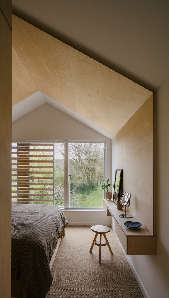 Nowa bryła wystaje poza pierwotny budynek, oferując widoki na malowniczą okolicę. Na piętrze powstał apartament główny z dużym panoramicznym oknem i sklepieniem w kształcie stodoły, wykończony brzozową sklejką. Przesuwane drewniane okiennice gwarantują prywatność. Przestrzeń połączono lekkimi schodami w przeszklonej szczelinie, która wpuszcza światło dzienne. Na parterze urządzono nowoczesną kuchnię i jadalnię, gdzie odsłonięta czerwona cegła dodaje ciepła i charakteru.