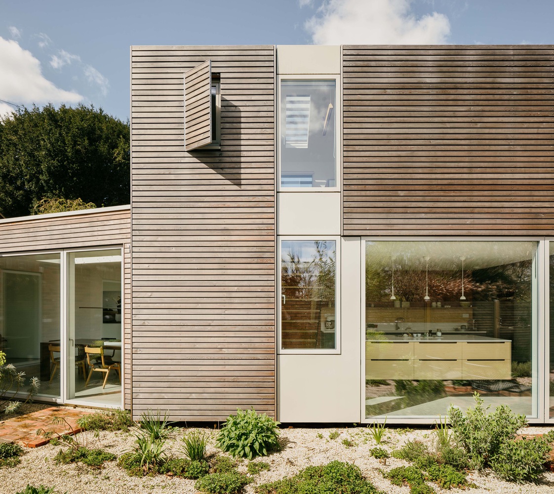 Drewniana elewacja z poziomych listew modrzewia syberyjskiego otula zarówno ściany, jak i dach, zachowując minimalistyczny styl. Projekt podkreśla wiejski kontekst otoczenia, jednocześnie wnosząc nowoczesny akcent architektoniczny. Całość nowoczesnej stodoły ukończono za mniej niż 350 000 funtów, tworząc funkcjonalną, pełną światła przestrzeń mieszkalną.