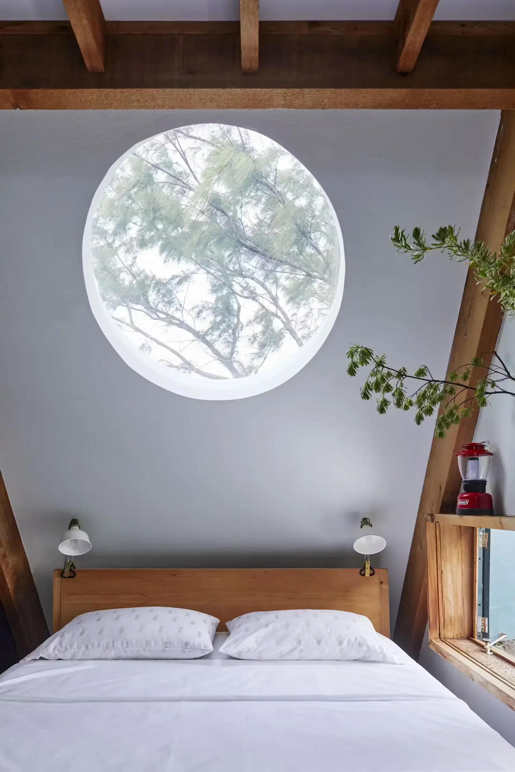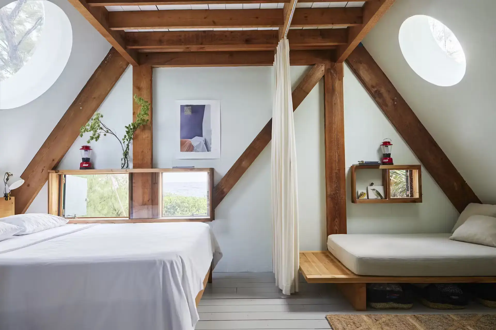 Całkowicie szklana konstrukcja na dole zawiera przesuwane szklane drzwi i sprawia, że otaczający krajobraz jest centralnym punktem. Dwie sypialnie na piętrze wyposażono w dwa świetliki, które kierują widok na nocne niebo, a także okna, które otwierają się, aby zapewnić wentylację krzyżową.