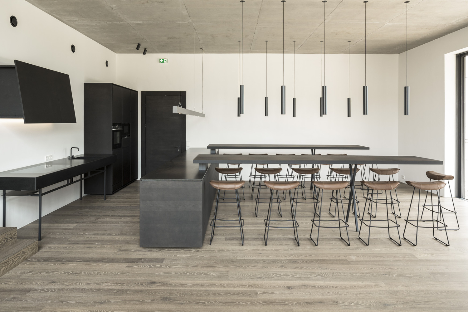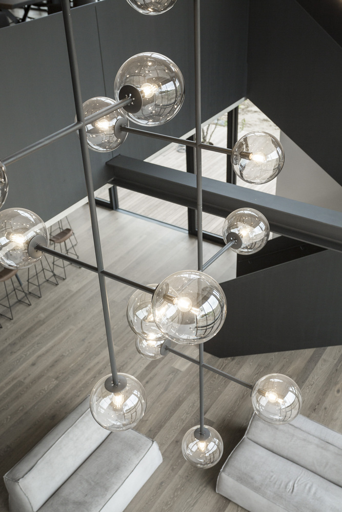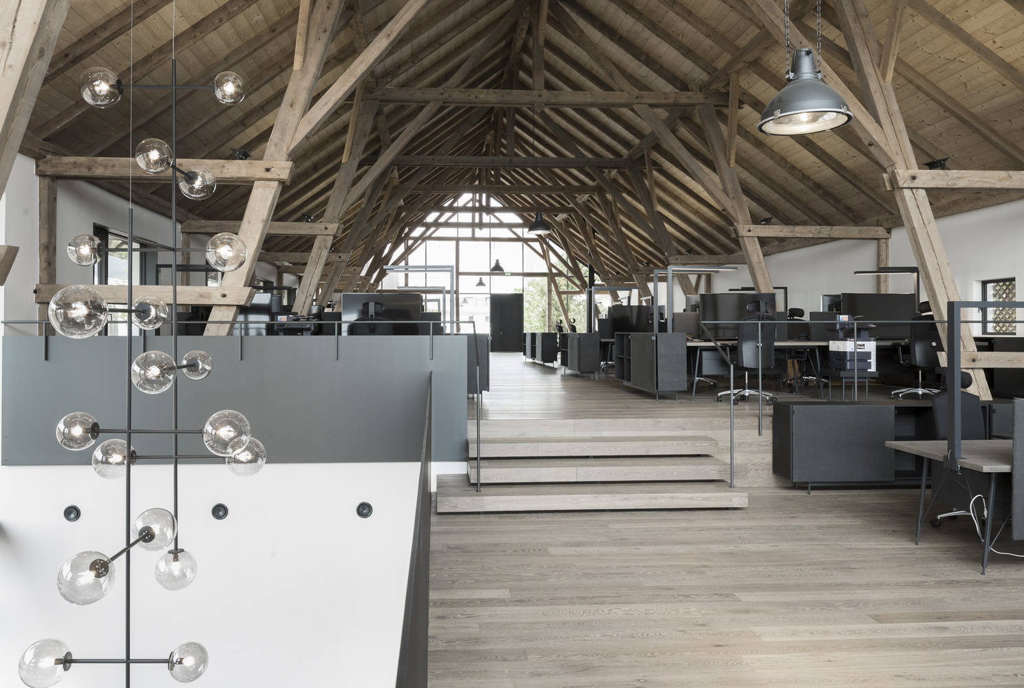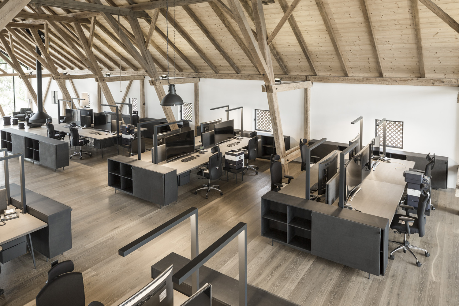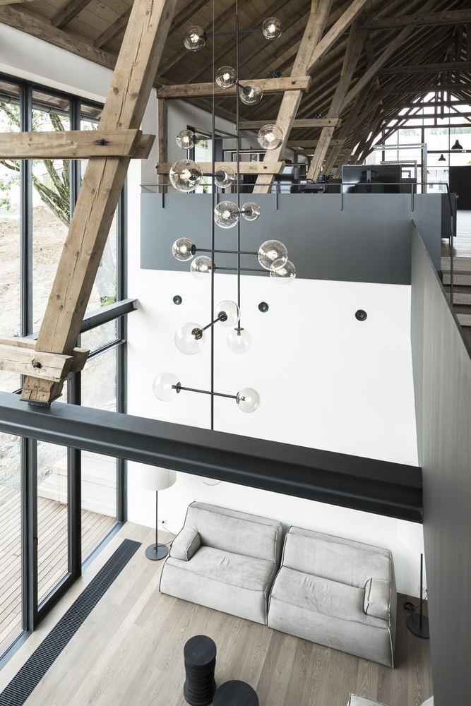 Projekt objął nie tylko modernizację i zachowanie tradycyjnej konstrukcji budynków, ale także kompleksową aranżację wnętrz i organizację przestrzeni zewnętrznych. Istniejąca więźba dachowa została starannie zdemontowana, odrestaurowana i przywrócona na swoje pierwotne miejsce, nadając wnętrzu charakteru i autentyczności. Centralny dziedziniec, który dawniej pełnił funkcję gospodarczą, został zrekonstruowany jako spójna część nowej kompozycji architektonicznej. Większość mebli wykonano ręcznie – z naturalnego dębu i sklejki bejcowanej na ciemno, uzupełnionej o metalowe okucia rzemieślnicze. Efektem jest elegancka, funkcjonalna i zrównoważona przestrzeń, która łączy przeszłość z teraźniejszością, wpisując się w trend nowoczesnych stodół przekształcanych w kreatywne przestrzenie biurowe.