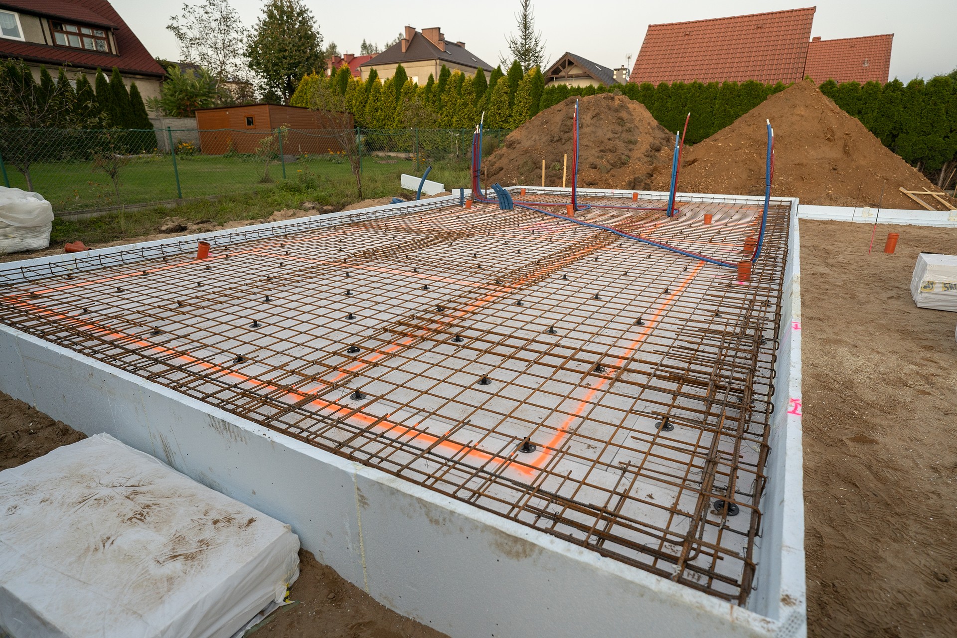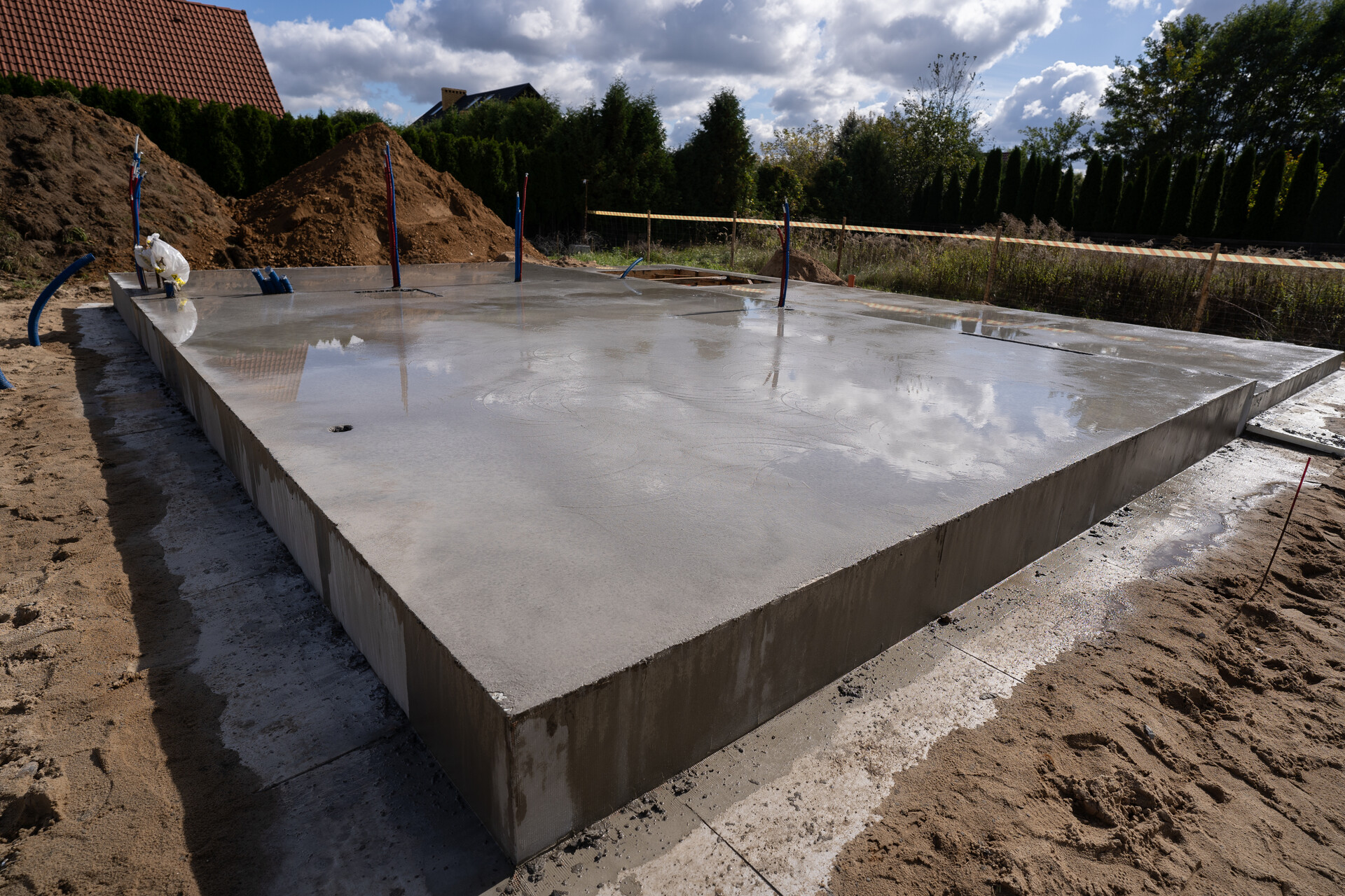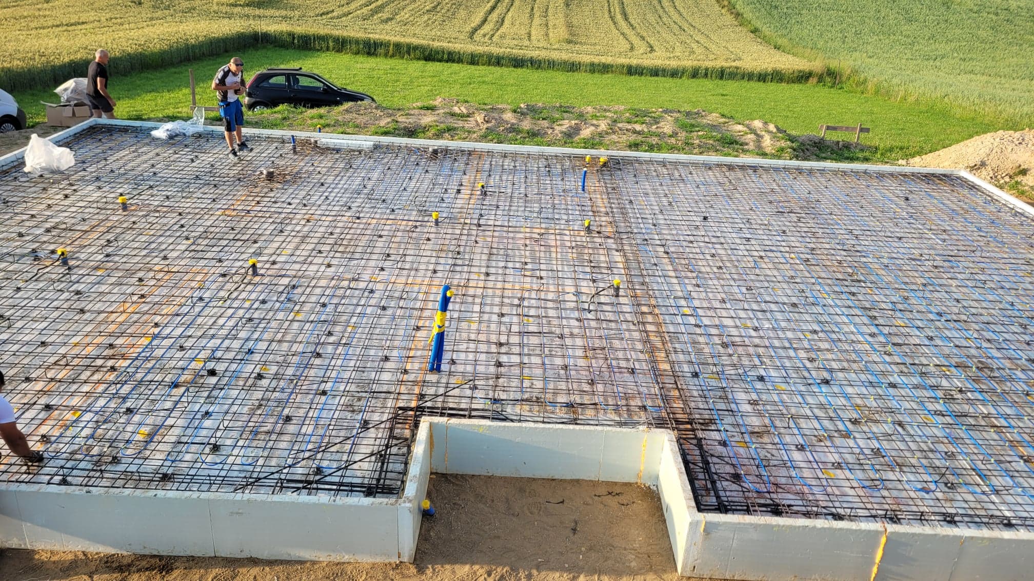 Budowę domu rozpoczynamy oczywiście od wykonania fundamentów. Naszym zdaniem najlepszym rozwiązaniem dla budownictwa szkieletowego jest płyta grzewcza. Posadowiona jest na odpowiednio grubej warstwie termoizolacji – najczęściej 20-30 cm. Warstwa konstrukcyjna jest jednocześnie ostateczną warstwą pod wykończenie – nie wykonuje się na niej wylewek. W elemencie żelbetowym zatopione są rury ogrzewania podłogowego, kable grzewcze lub kanały transportujące ciepłe powietrze. Szalunkiem bocznym również jest materiał termoizolacyjny, o grubości zależnej od zastosowanego przekroju ścian domu.