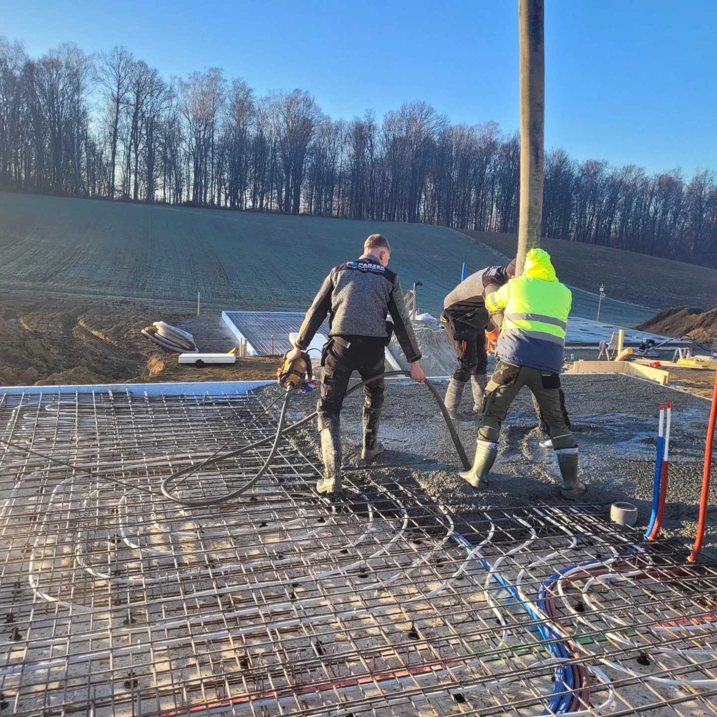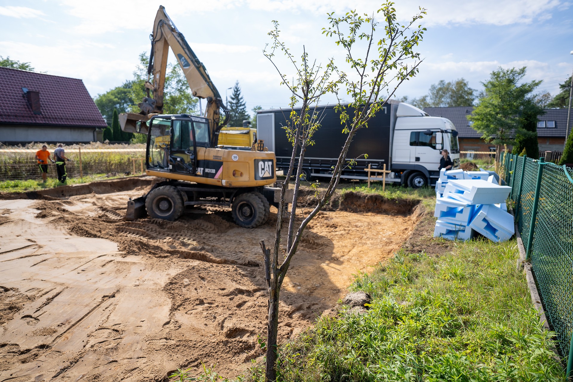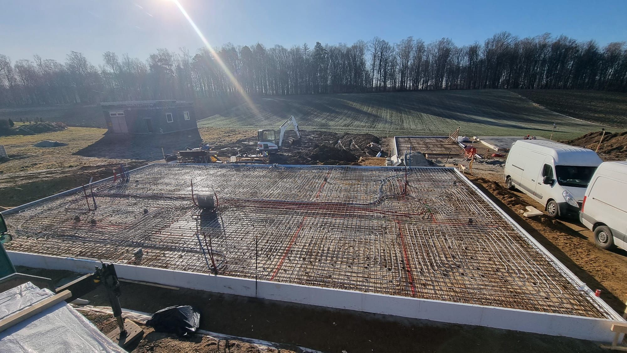 Budowę domu rozpoczynamy oczywiście od wykonania fundamentów. Naszym zdaniem najlepszym rozwiązaniem dla budownictwa szkieletowego jest płyta grzewcza. Posadowiona jest na odpowiednio grubej warstwie termoizolacji – najczęściej 20-30 cm. Warstwa konstrukcyjna jest jednocześnie ostateczną warstwą pod wykończenie – nie wykonuje się na niej wylewek. W elemencie żelbetowym zatopione są rury ogrzewania podłogowego, kable grzewcze lub kanały transportujące ciepłe powietrze. Szalunkiem bocznym również jest materiał termoizolacyjny, o grubości zależnej od zastosowanego przekroju ścian domu.