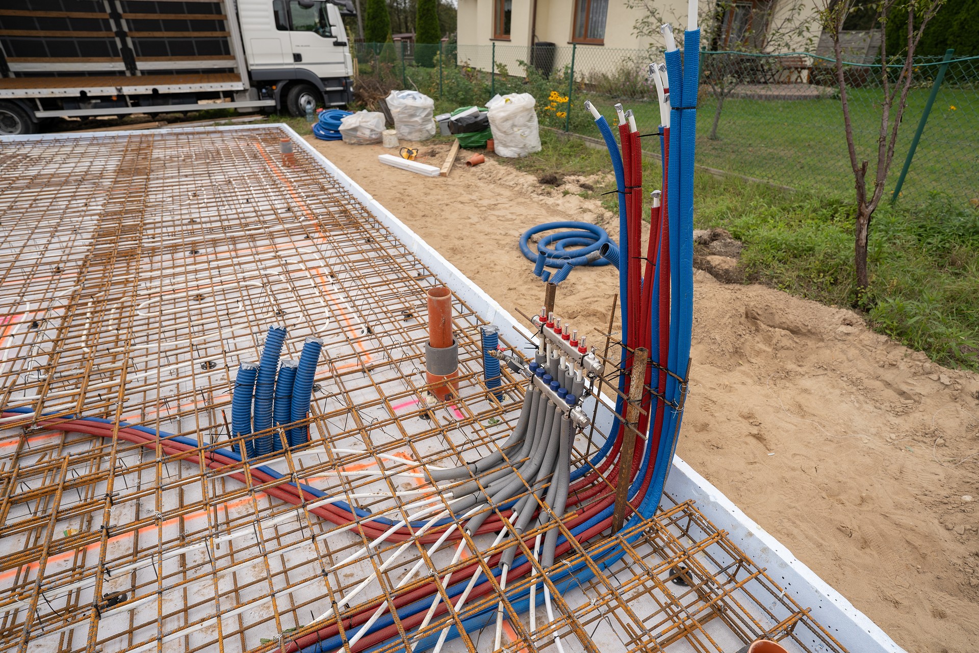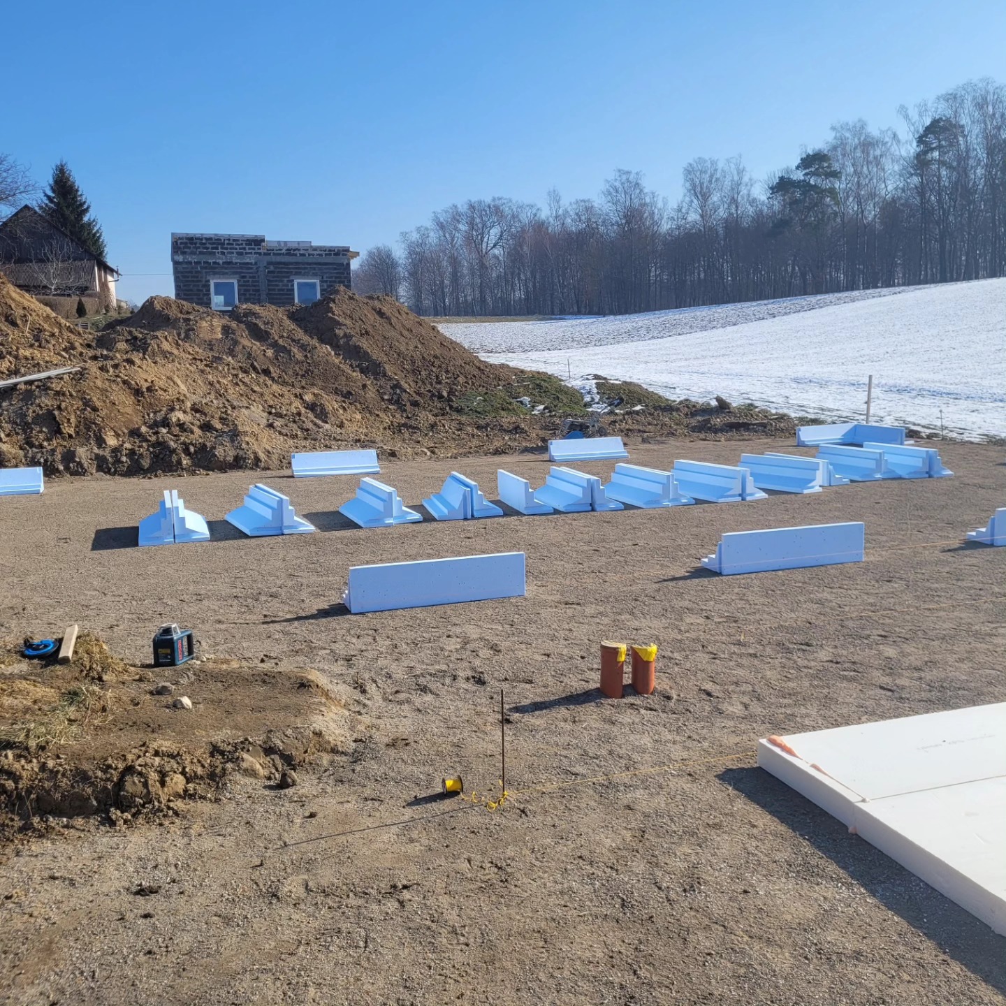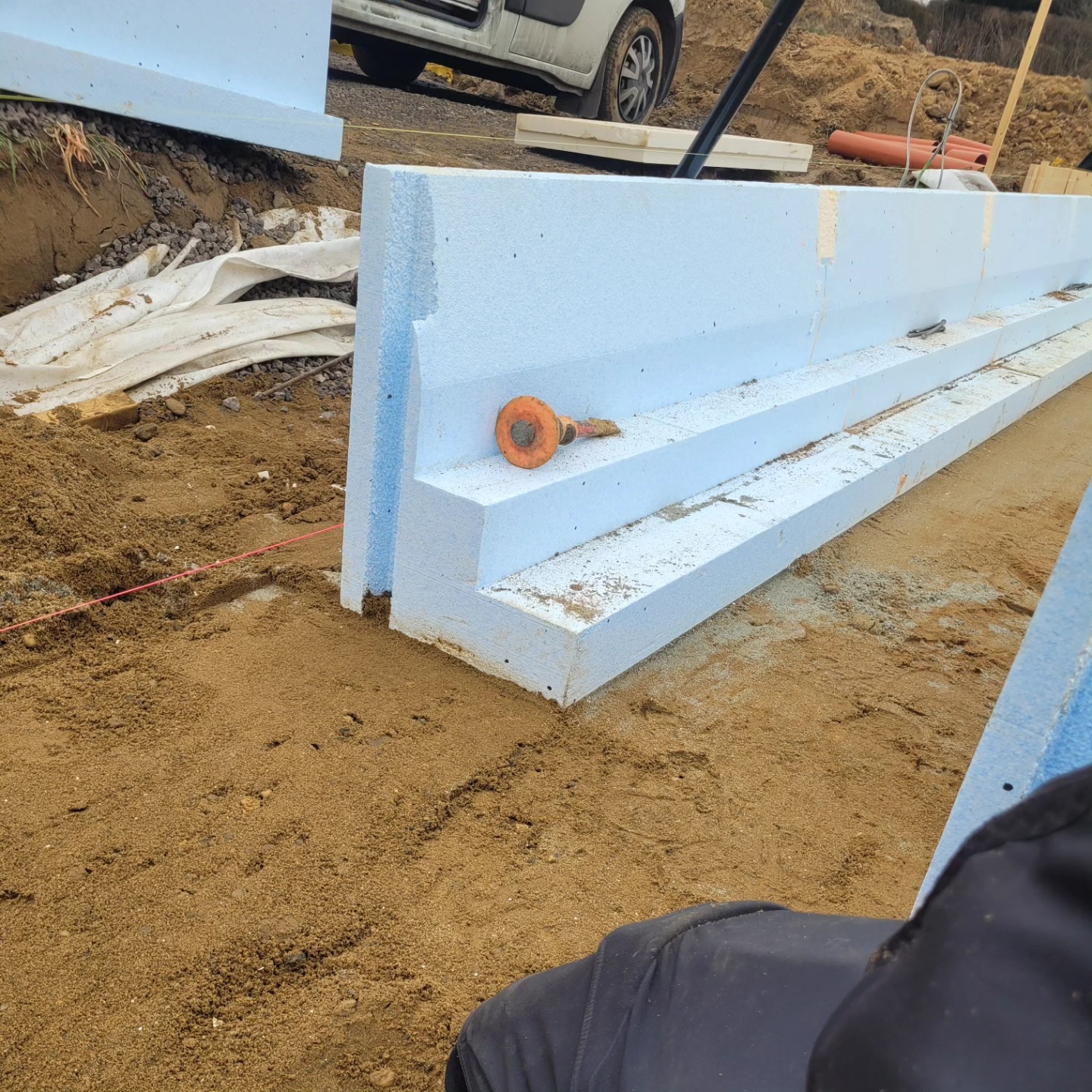 Następnie układa się elementy brzegowe będące jednocześnie szalunkiem traconym, wkopuje mierzone od powstałych punktów odniesienia rury osłonowe/przepusty przyłączy oraz instalację kanalizacyjną. Kolejnymi krokami są: ułożenie właściwej warstwy termoizolacji – najczęściej 20-30 cm, ułożenie elementów instalacji wodnej, zbrojenia, ogrzewania podłogowego oraz betonowanie.