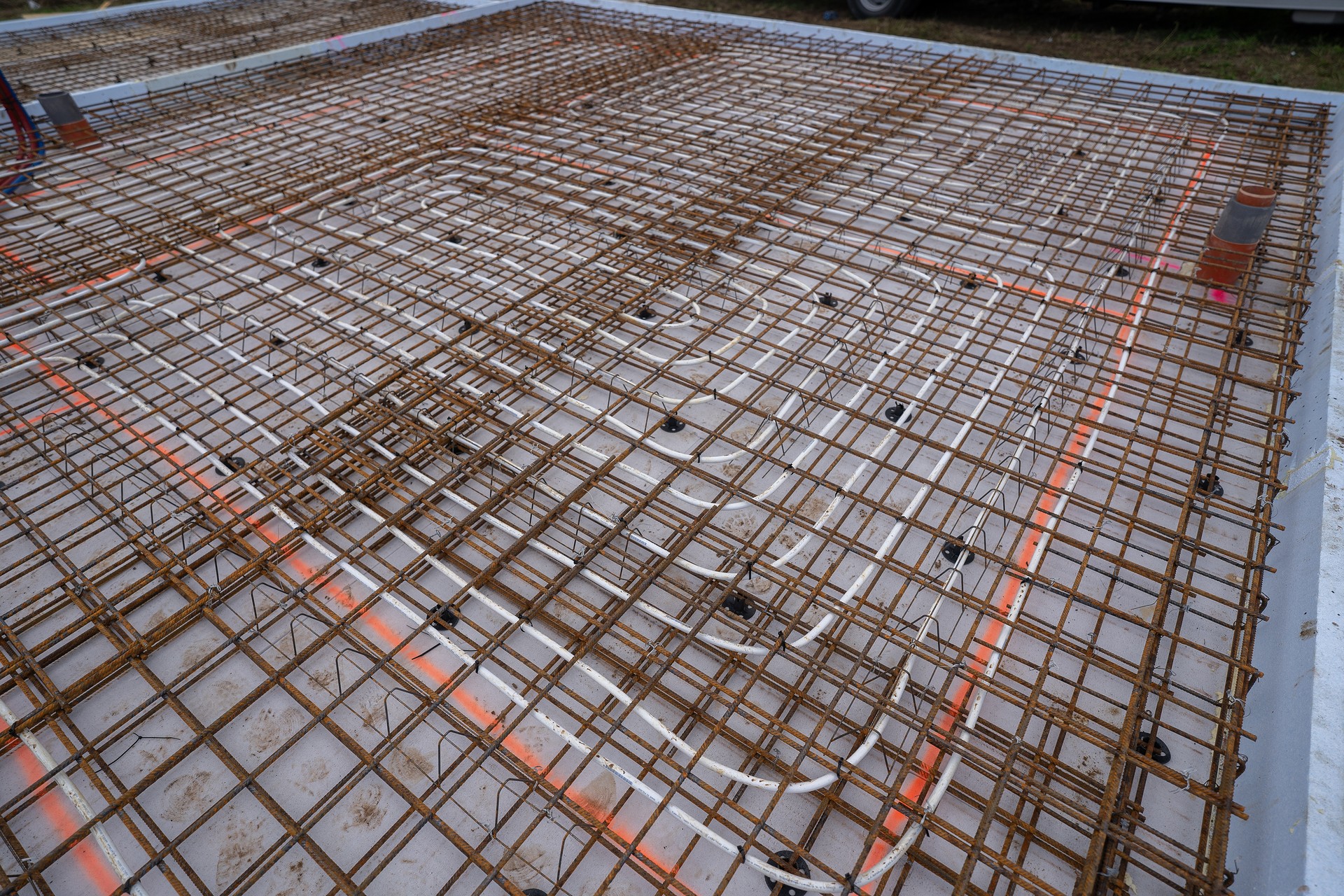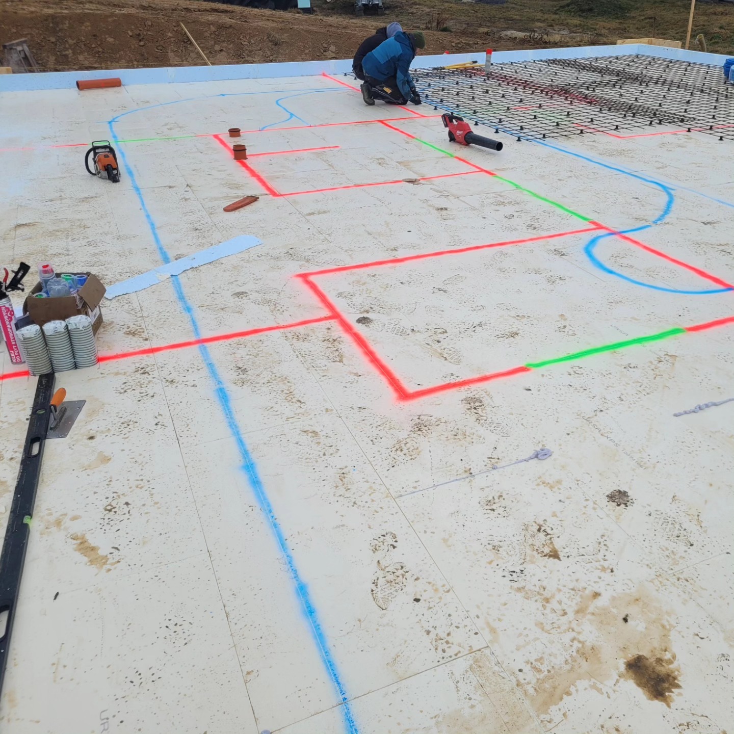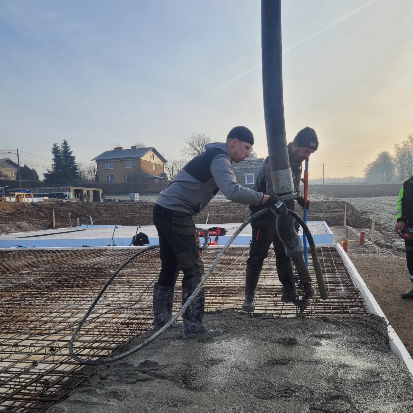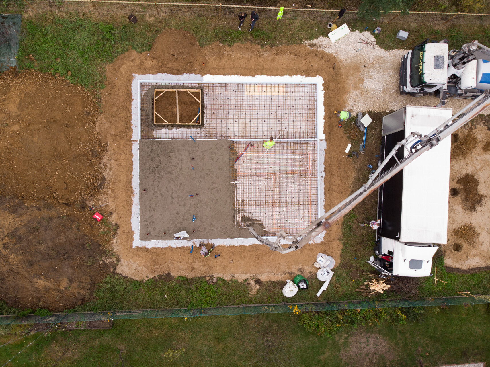 Następnie układa się elementy brzegowe będące jednocześnie szalunkiem traconym, wkopuje mierzone od powstałych punktów odniesienia rury osłonowe/przepusty przyłączy oraz instalację kanalizacyjną. Kolejnymi krokami są: ułożenie właściwej warstwy termoizolacji – najczęściej 20-30 cm, ułożenie elementów instalacji wodnej, zbrojenia, ogrzewania podłogowego oraz betonowanie.