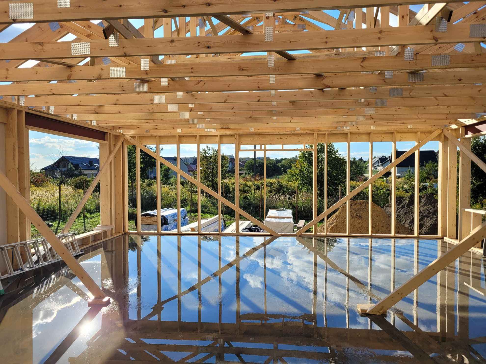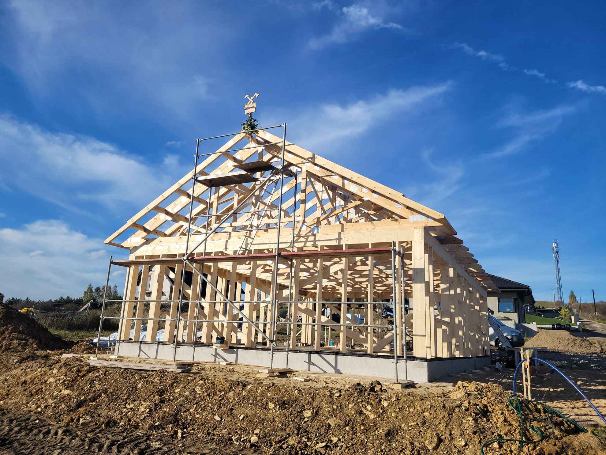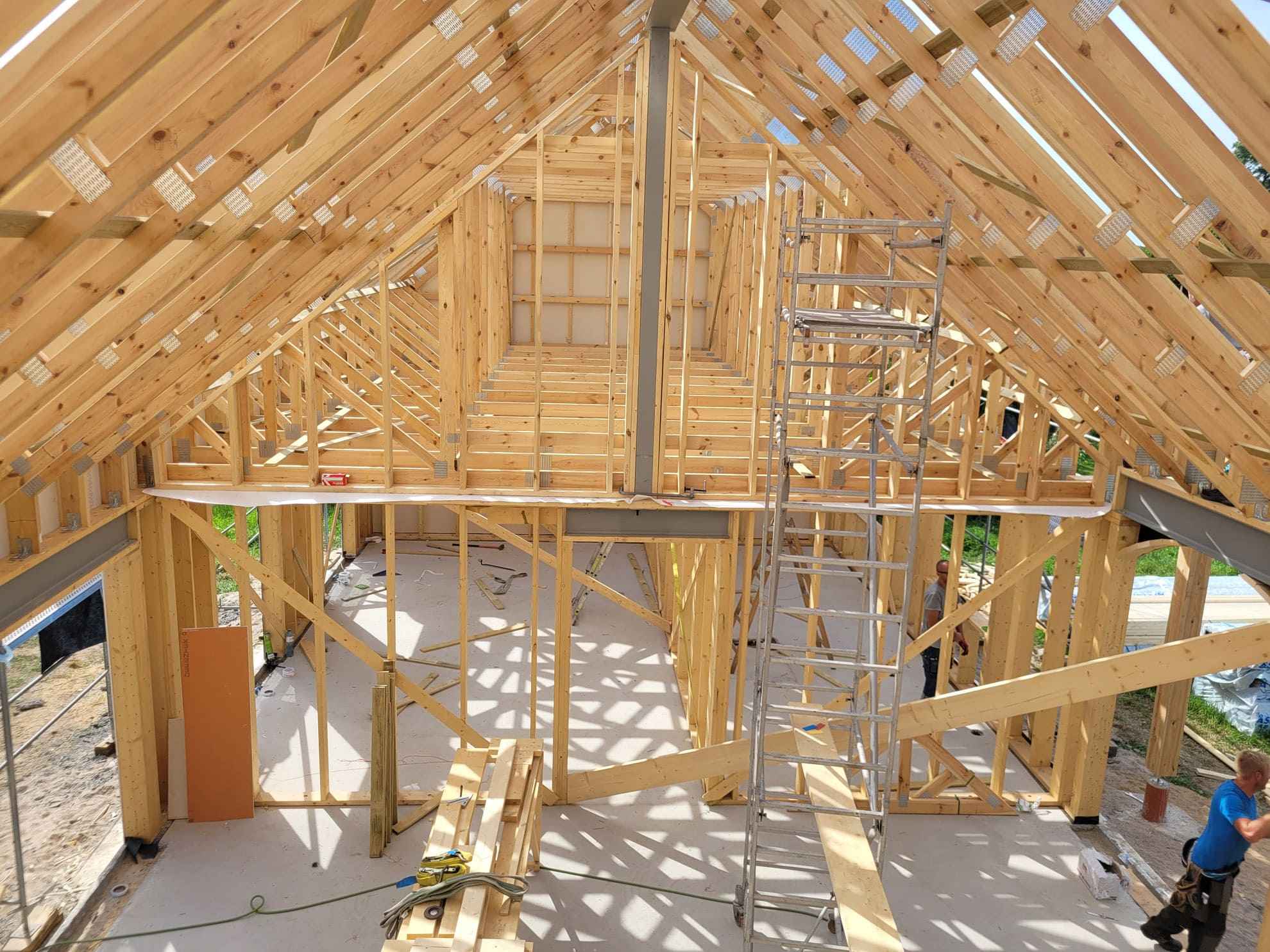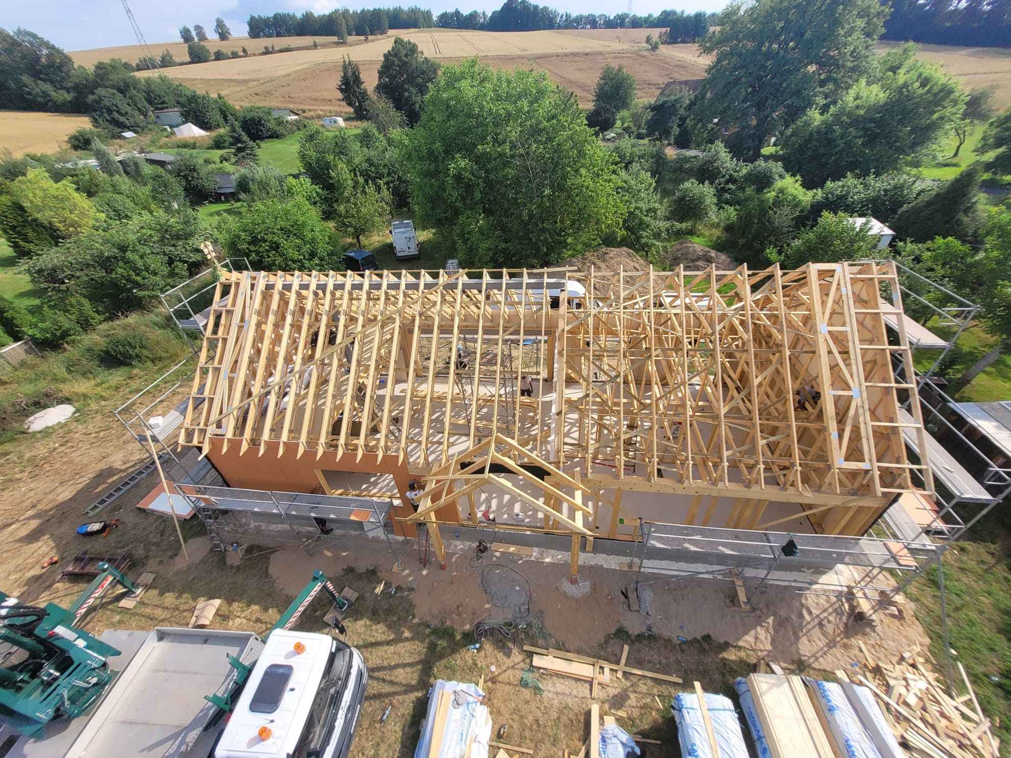 Ściany stoją, są wstępnie ustawione oraz stężone poszyciem. Nadszedł czas na wykonanie więźby dachowej i symboliczną „wiechę”. Na tym etapie budowy jesteśmy przeważnie w drugim tygodniu prac, przy najprostszych realizacjach – pod koniec pierwszego.
