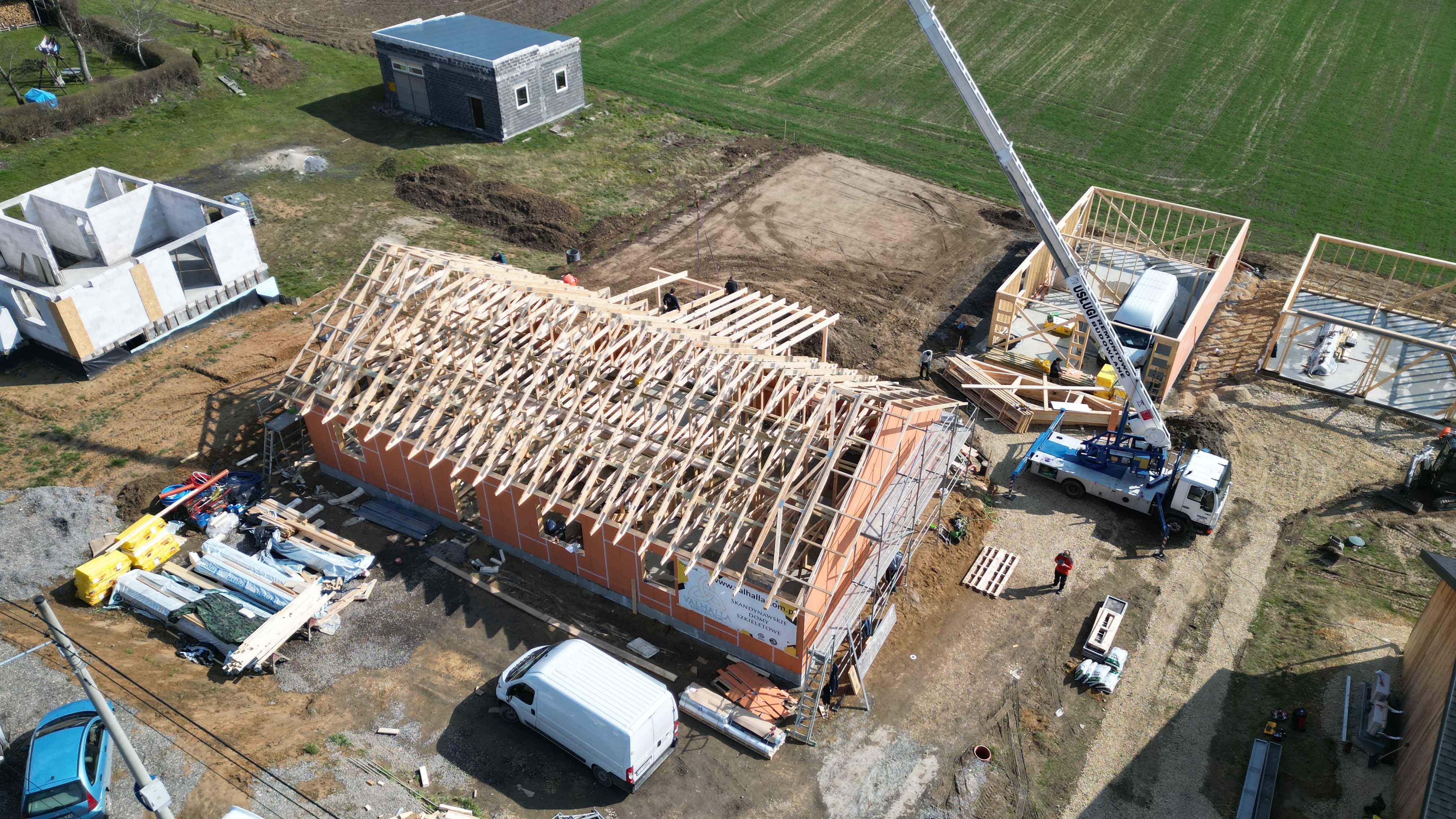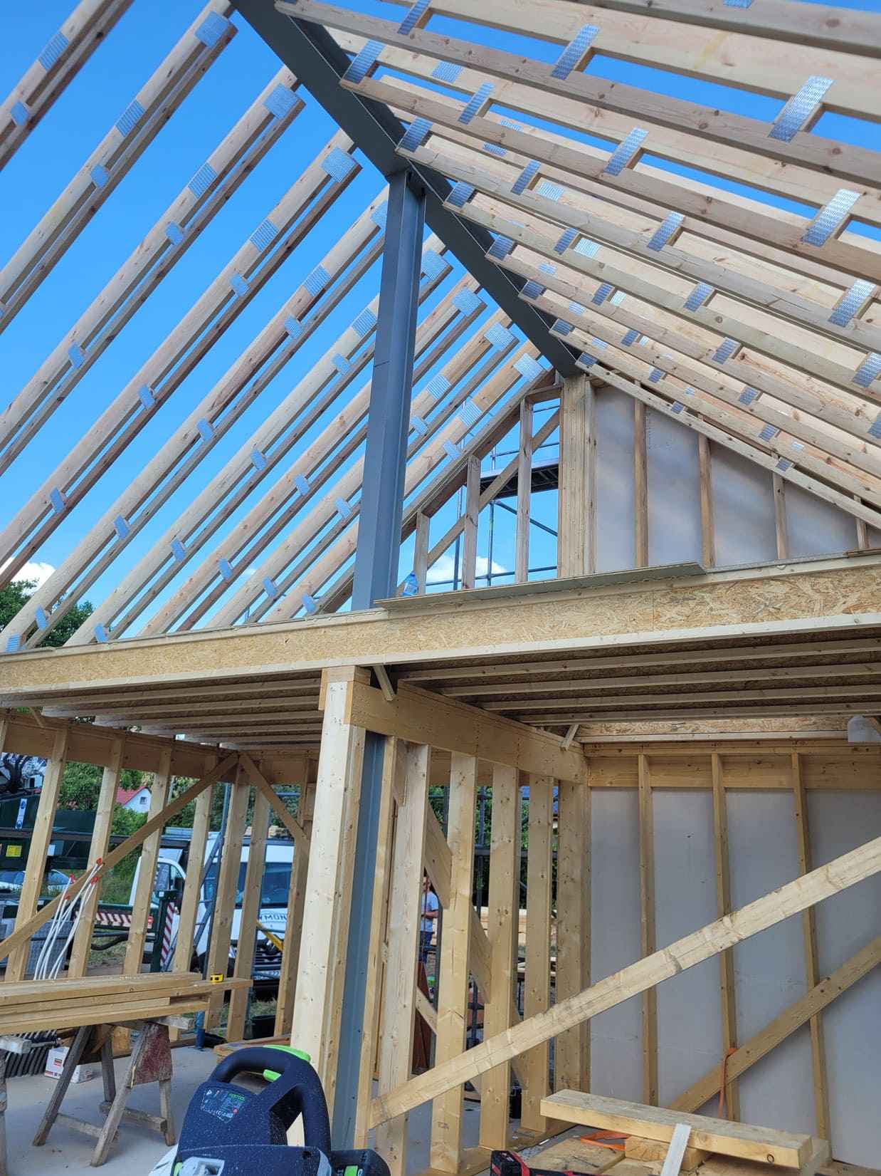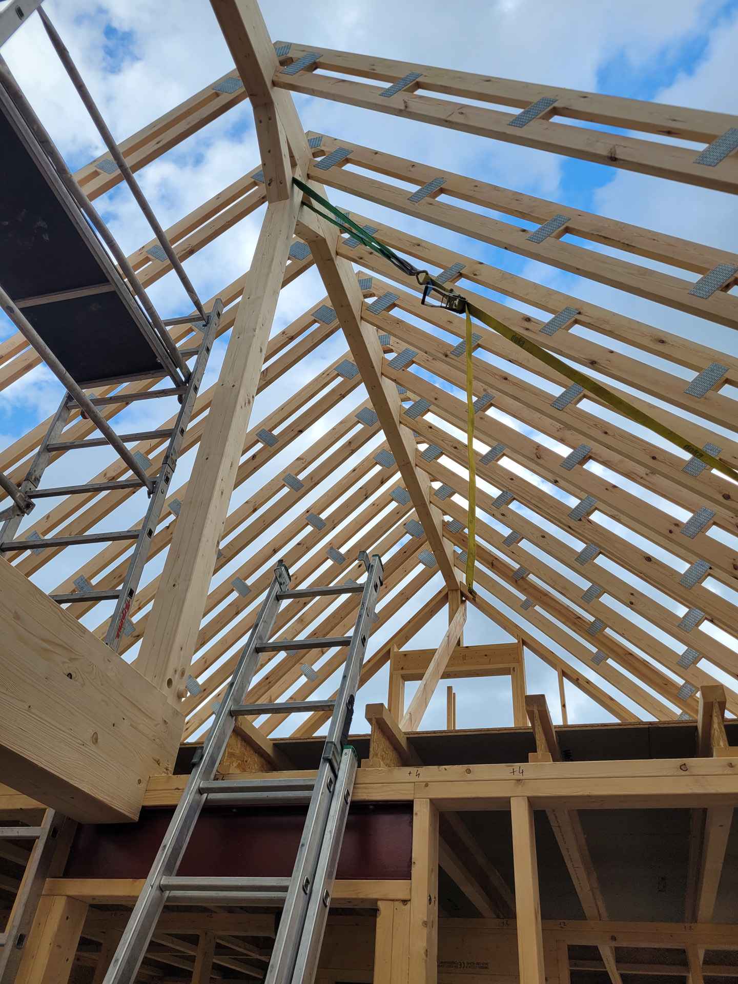 Ściany stoją, są wstępnie ustawione oraz stężone poszyciem. Nadszedł czas na wykonanie więźby dachowej i symboliczną „wiechę”. Na tym etapie budowy jesteśmy przeważnie w drugim tygodniu prac, przy najprostszych realizacjach – pod koniec pierwszego.