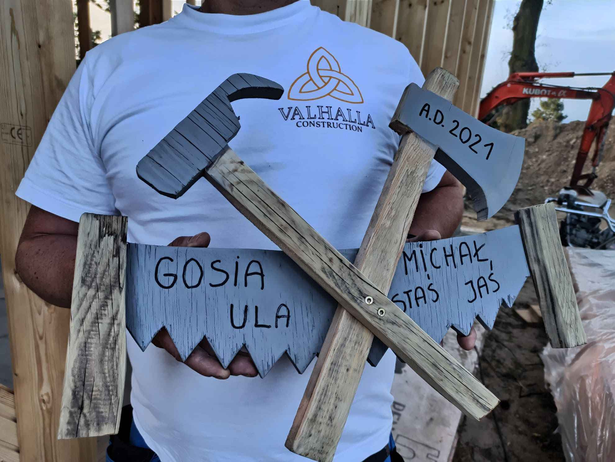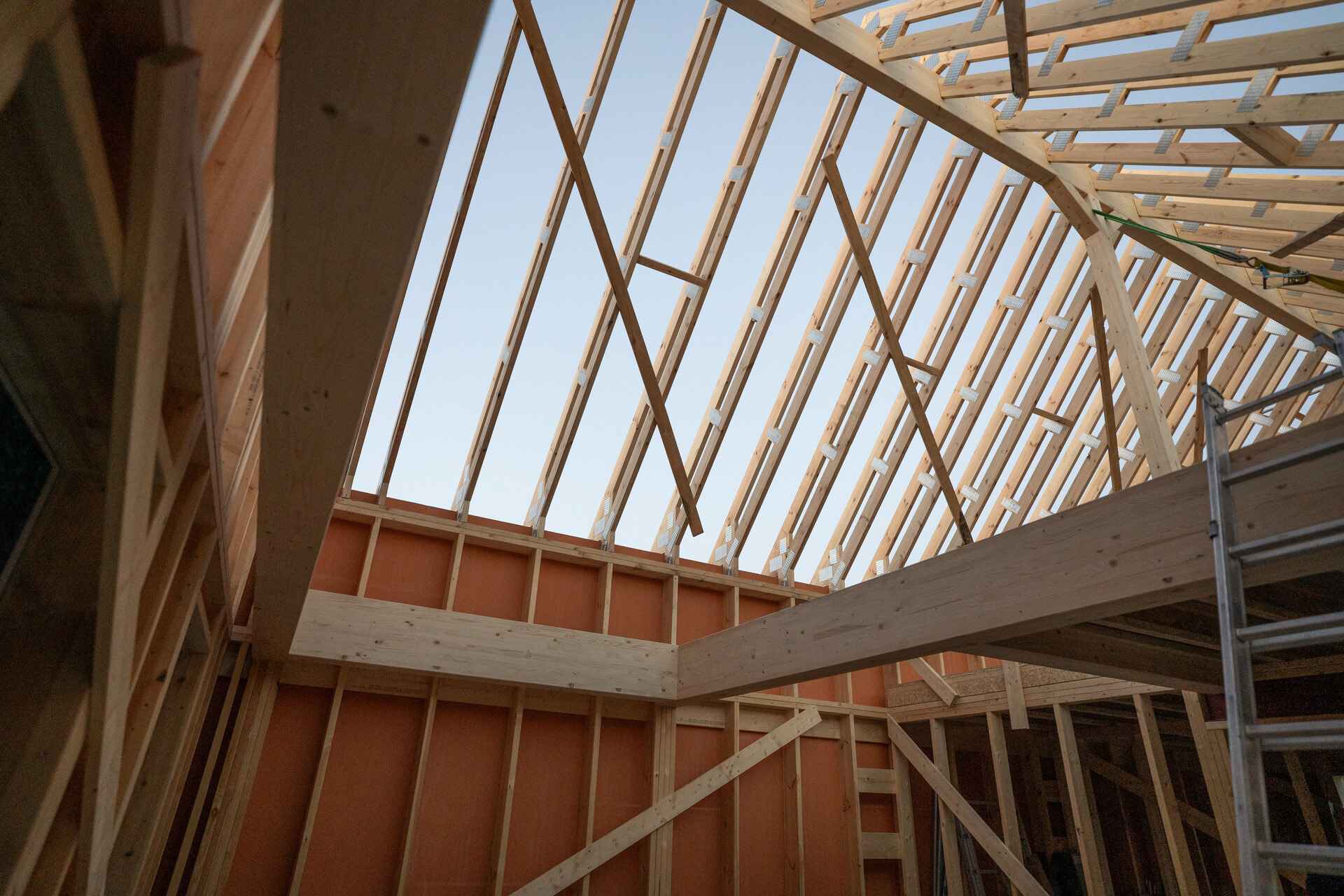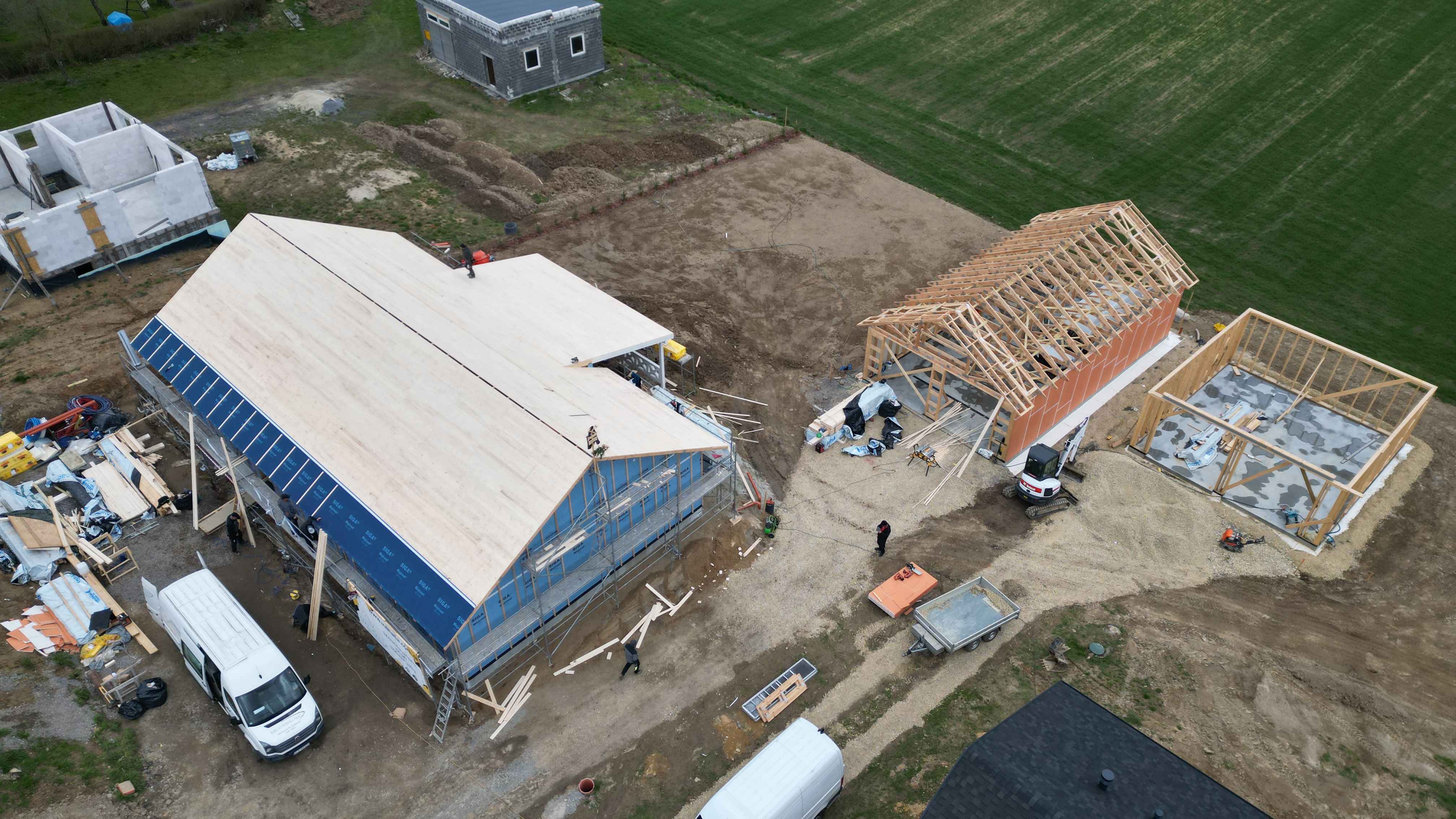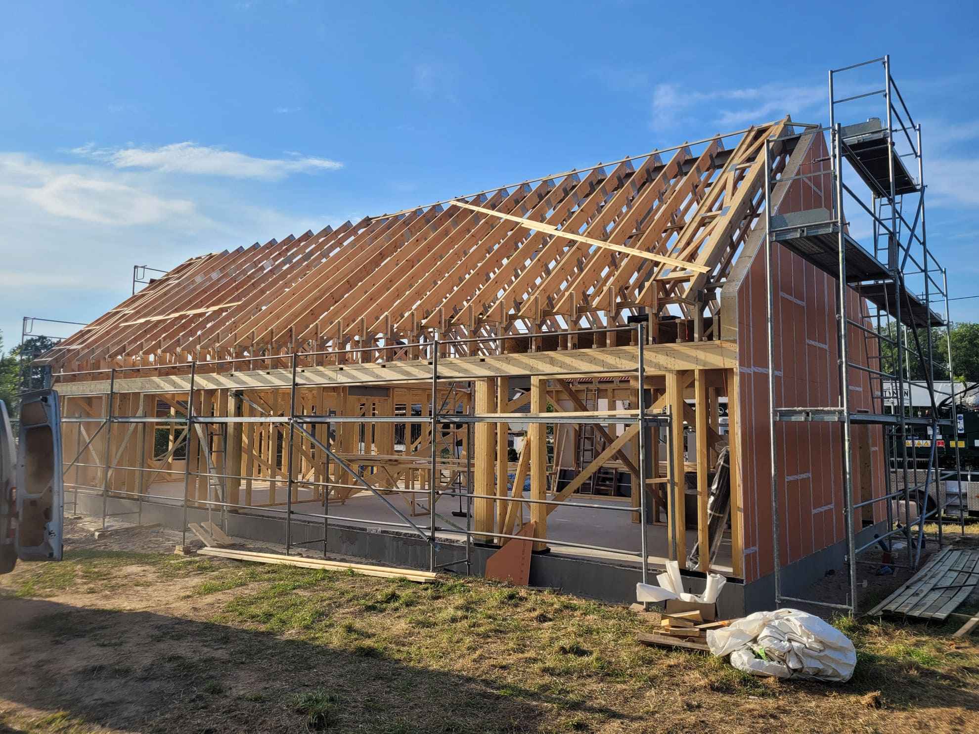 Ściany stoją, są wstępnie ustawione oraz stężone poszyciem. Nadszedł czas na wykonanie więźby dachowej i symboliczną „wiechę”. Na tym etapie budowy jesteśmy przeważnie w drugim tygodniu prac, przy najprostszych realizacjach – pod koniec pierwszego.