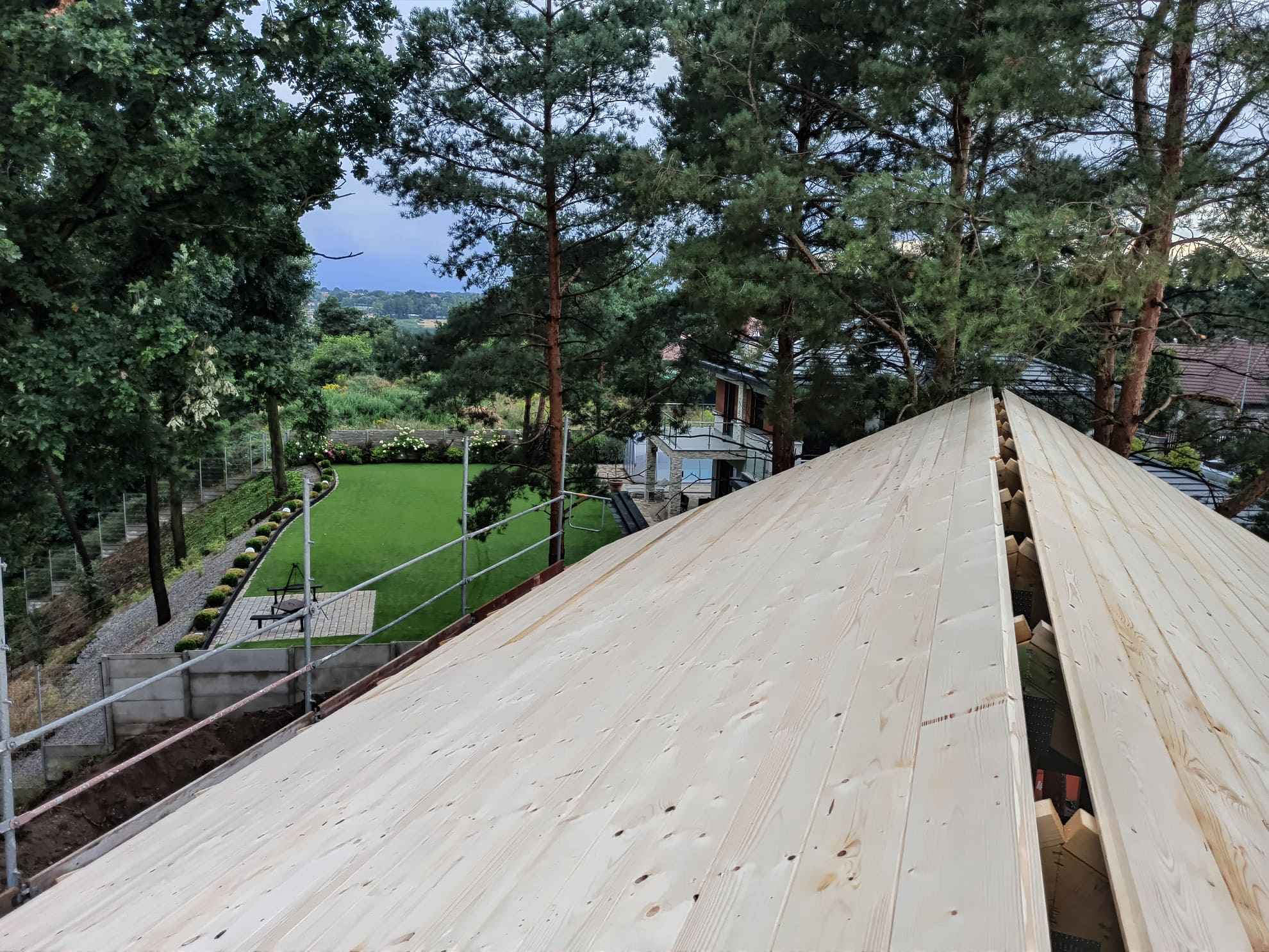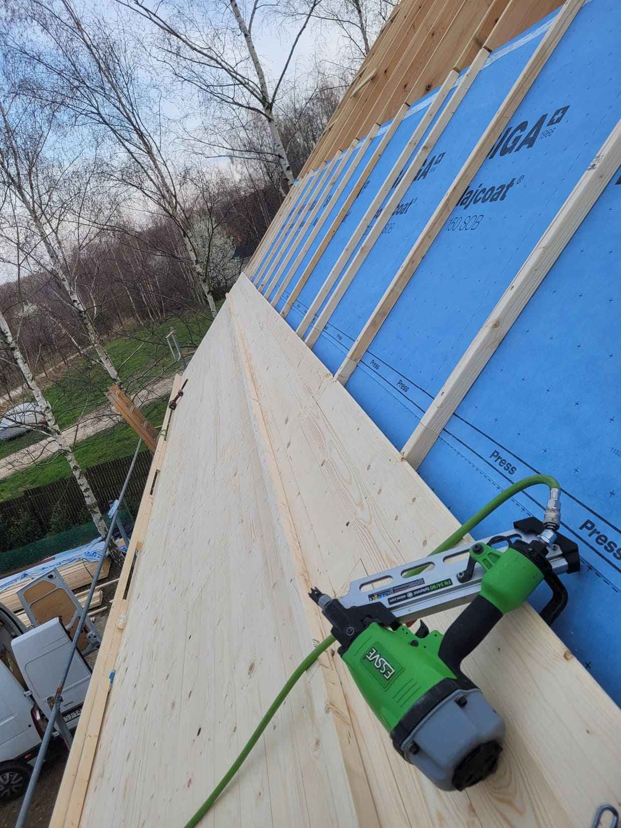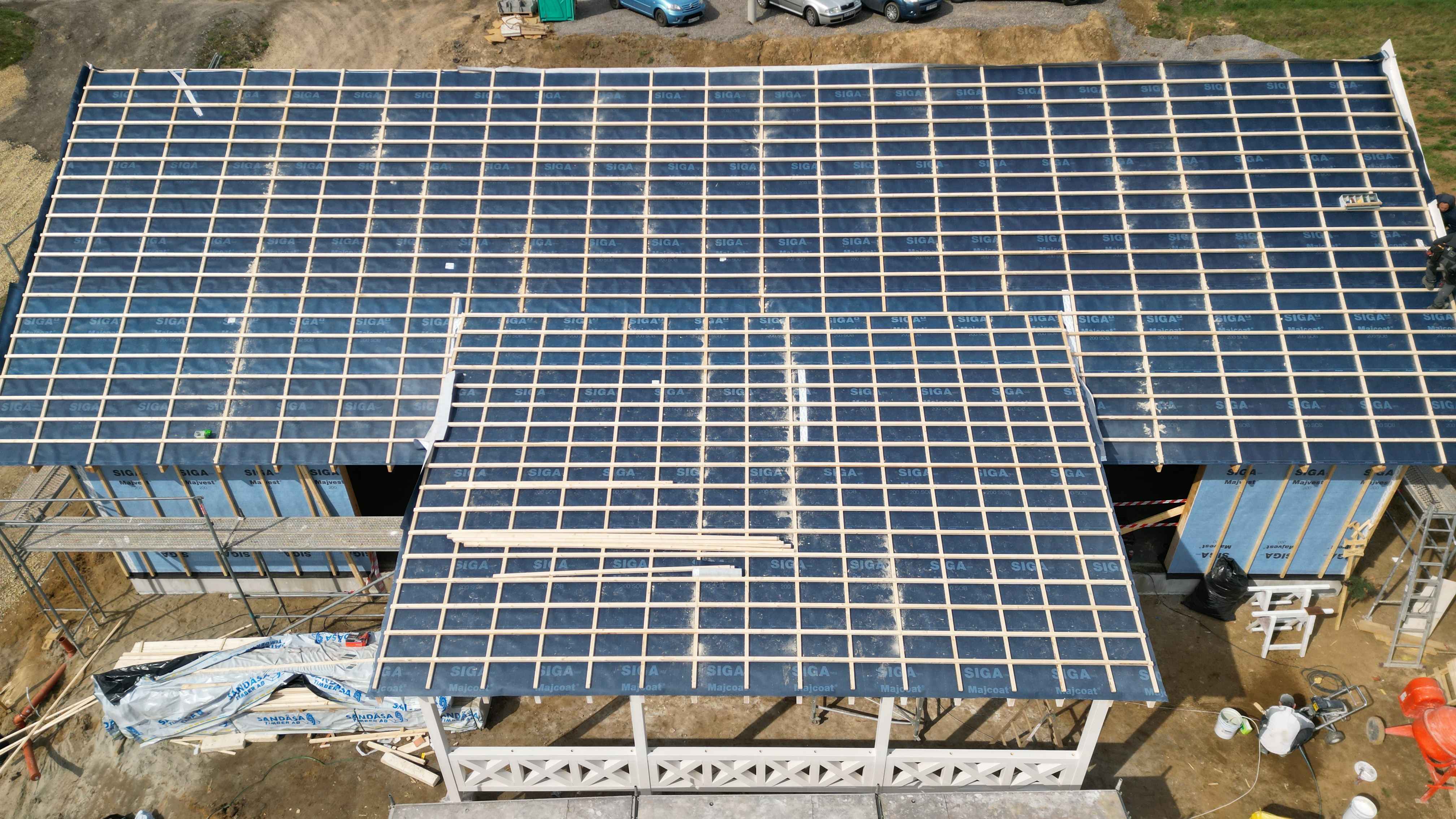 Po montażu więźby, kolejnym krokiem jest wykonanie szczeliny wentylacyjnej, o której wspominałem wcześniej, również pod deskowaniem połaci dachowej. Następnie wykonujemy pełne deskowanie znacząco zwiększające sztywność połaci oraz montaż wstępnego krycia – membrany, której rola jest jeszcze ważniejsza niż w wypadku ścian. Zawsze zakładamy, że docelowe pokrycie nie jest w pełni szczelne (np. możliwość podwiania śniegu pod dachówkę), i to właśnie membrana wstępnego krycia musi zapewnić stuprocentową szczelność pokrycia dachowego. Zasady obowiązują te same, co w wypadku membrany na ścianach. Zero „partyzantki”, uszczelnienie wszystkich newralgicznych punktów w tym łączenia poszczególnych pasów membrany i wszystkich przejść elementów instalacyjnych czy punktów zmiany geometrii połaci dachowej. I oczywiście nie możemy oszczędzać na jakości samej membrany i taśm – to kluczowe materiały dla trwałości budynku.