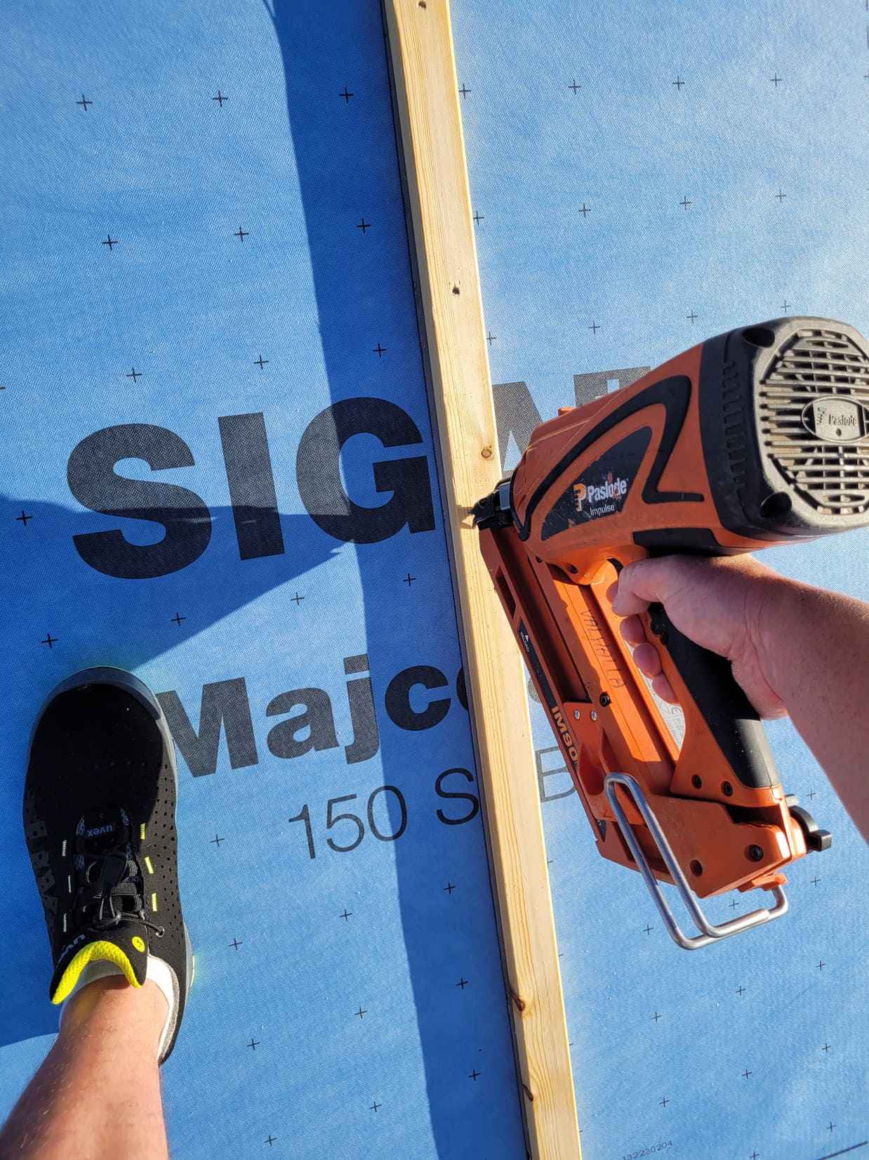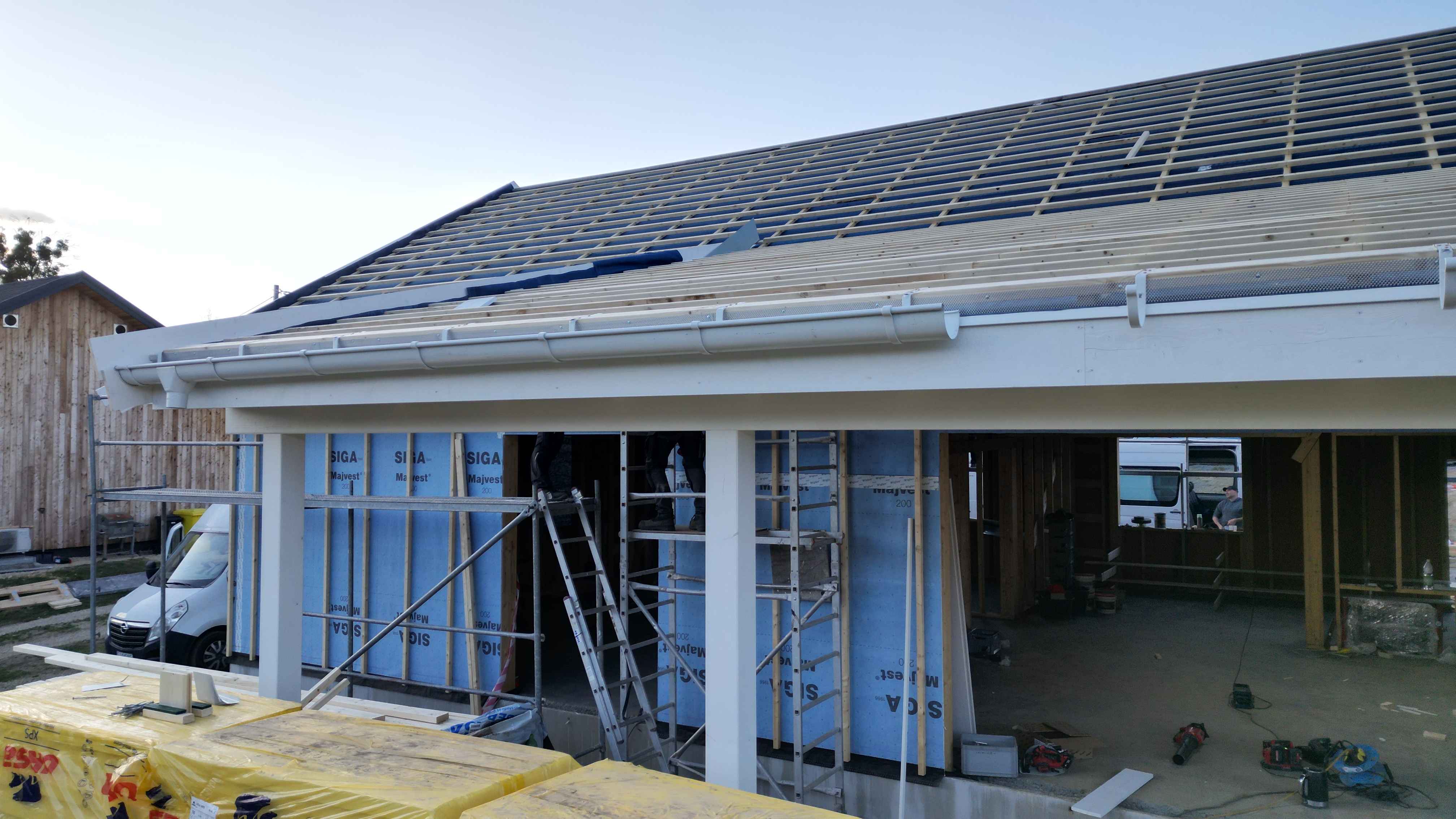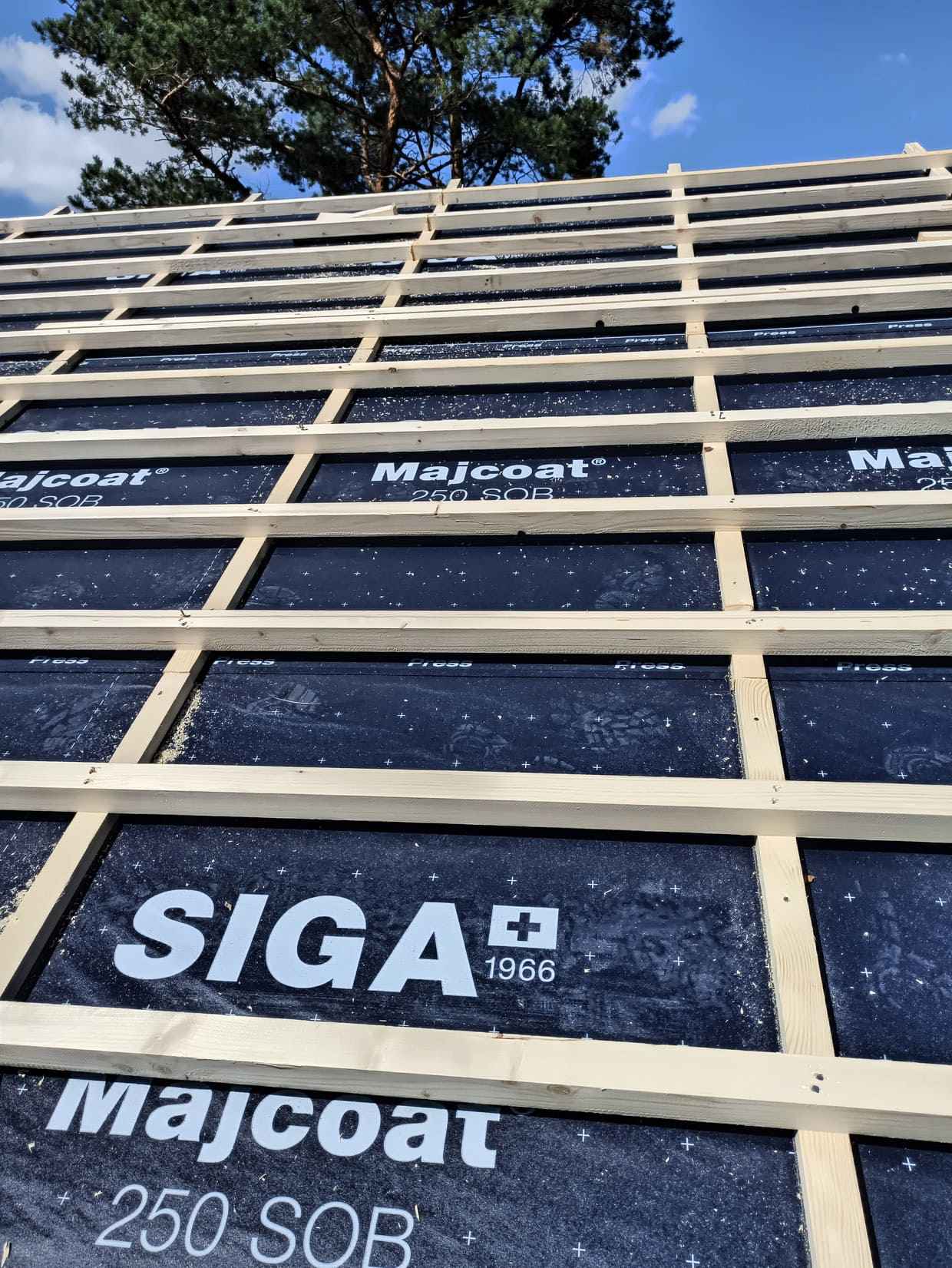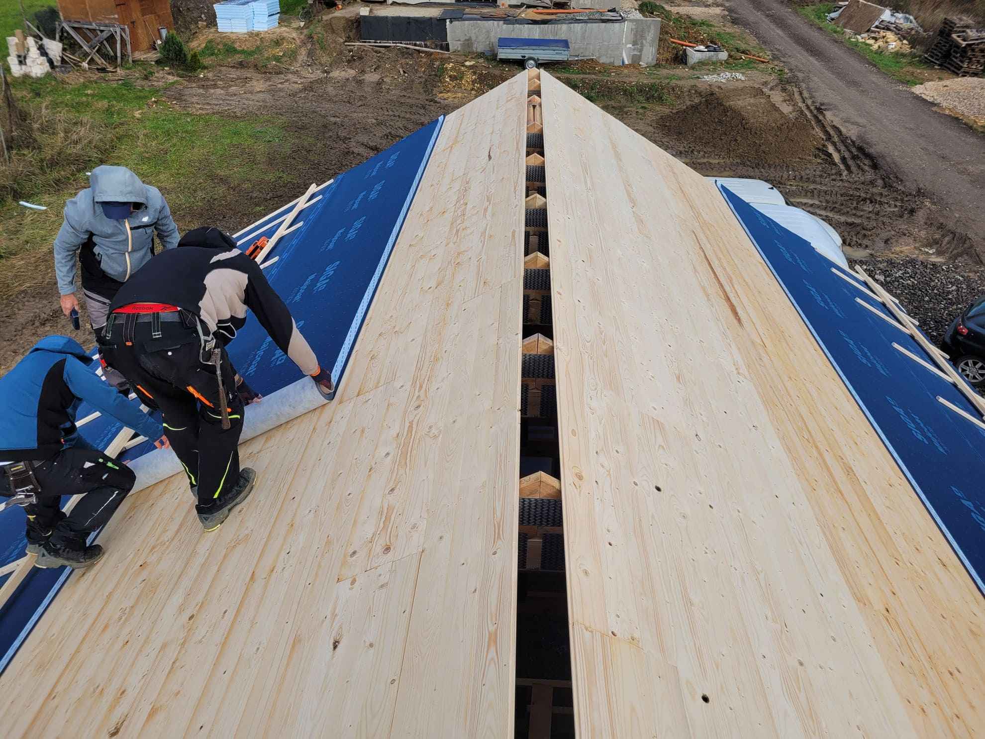 Po montażu więźby, kolejnym krokiem jest wykonanie szczeliny wentylacyjnej, o której wspominałem wcześniej, również pod deskowaniem połaci dachowej. Następnie wykonujemy pełne deskowanie znacząco zwiększające sztywność połaci oraz montaż wstępnego krycia – membrany, której rola jest jeszcze ważniejsza niż w wypadku ścian. Zawsze zakładamy, że docelowe pokrycie nie jest w pełni szczelne (np. możliwość podwiania śniegu pod dachówkę), i to właśnie membrana wstępnego krycia musi zapewnić stuprocentową szczelność pokrycia dachowego. Zasady obowiązują te same, co w wypadku membrany na ścianach. Zero „partyzantki”, uszczelnienie wszystkich newralgicznych punktów w tym łączenia poszczególnych pasów membrany i wszystkich przejść elementów instalacyjnych czy punktów zmiany geometrii połaci dachowej. I oczywiście nie możemy oszczędzać na jakości samej membrany i taśm – to kluczowe materiały dla trwałości budynku.