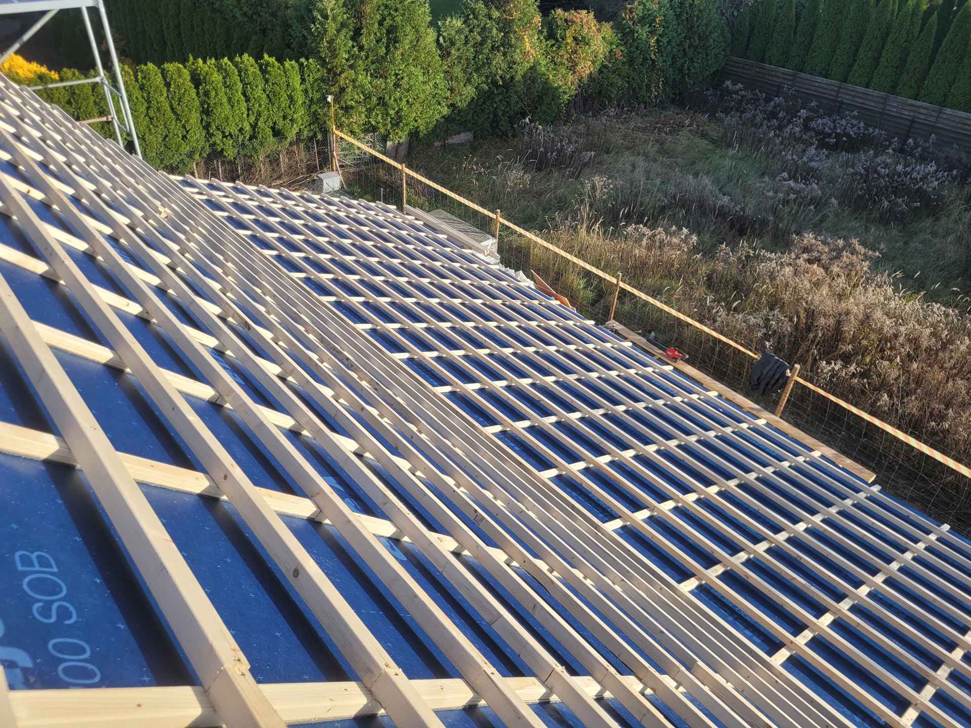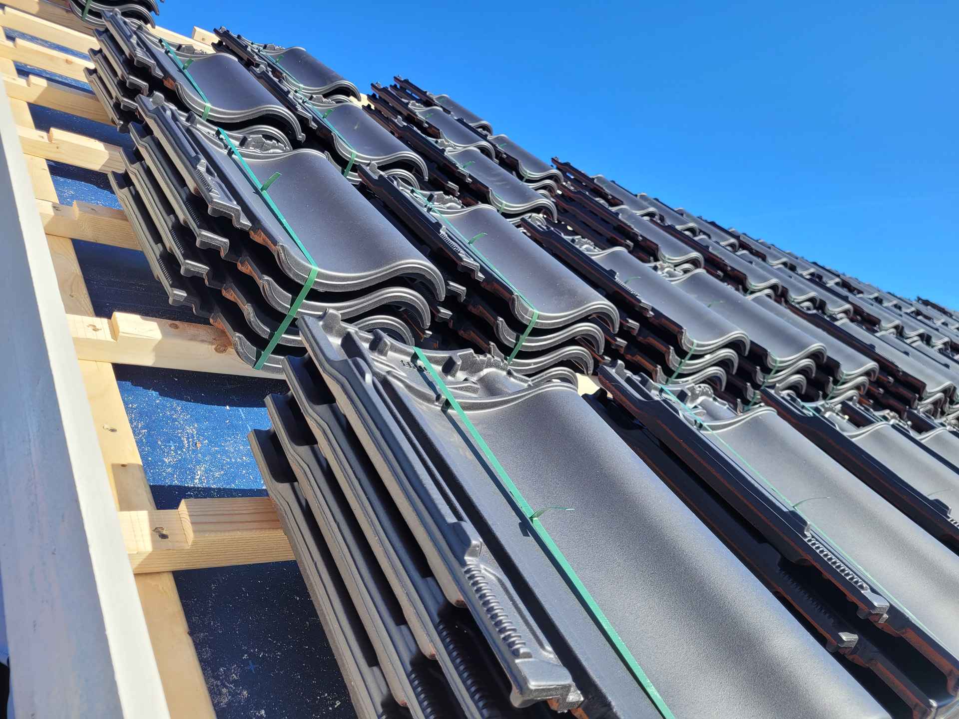 Następnie przechodzimy do etapu montażu docelowego pokrycia dachowego. Mój faworyt: dachówka ceramiczna. Kładziemy raz, zapominamy praktycznie dożywotnio, a jeśli chodzi o kolorystykę i wzornictwo, w zasadzie zawsze znajdziemy coś, co będzie pasowało do charakteru danego projektu. Oczywiście mamy pełną dowolność odnośnie wyboru materiału, obciążenia nawet najcięższymi materiałami są niestraszne budynkom szkieletowym.