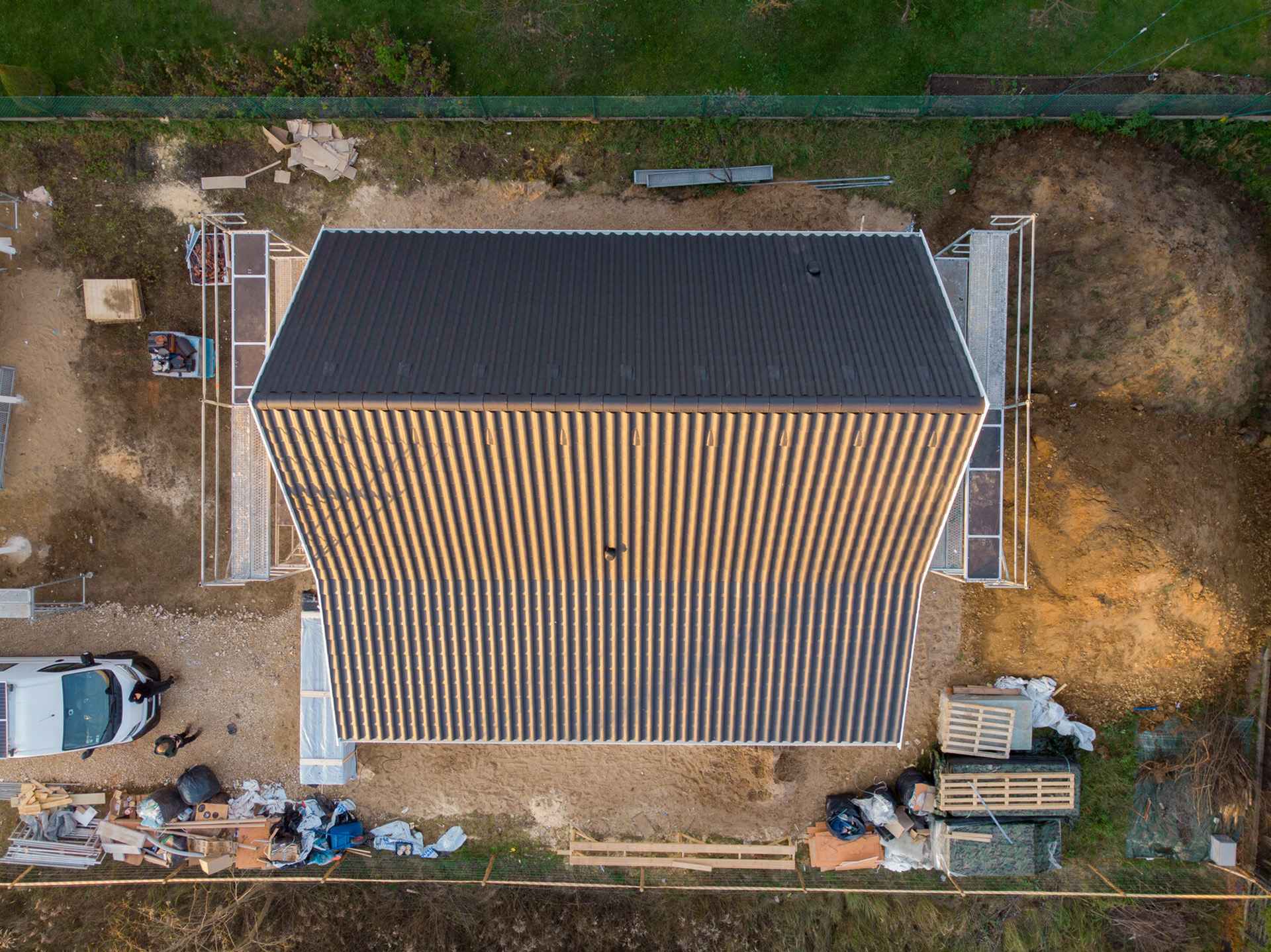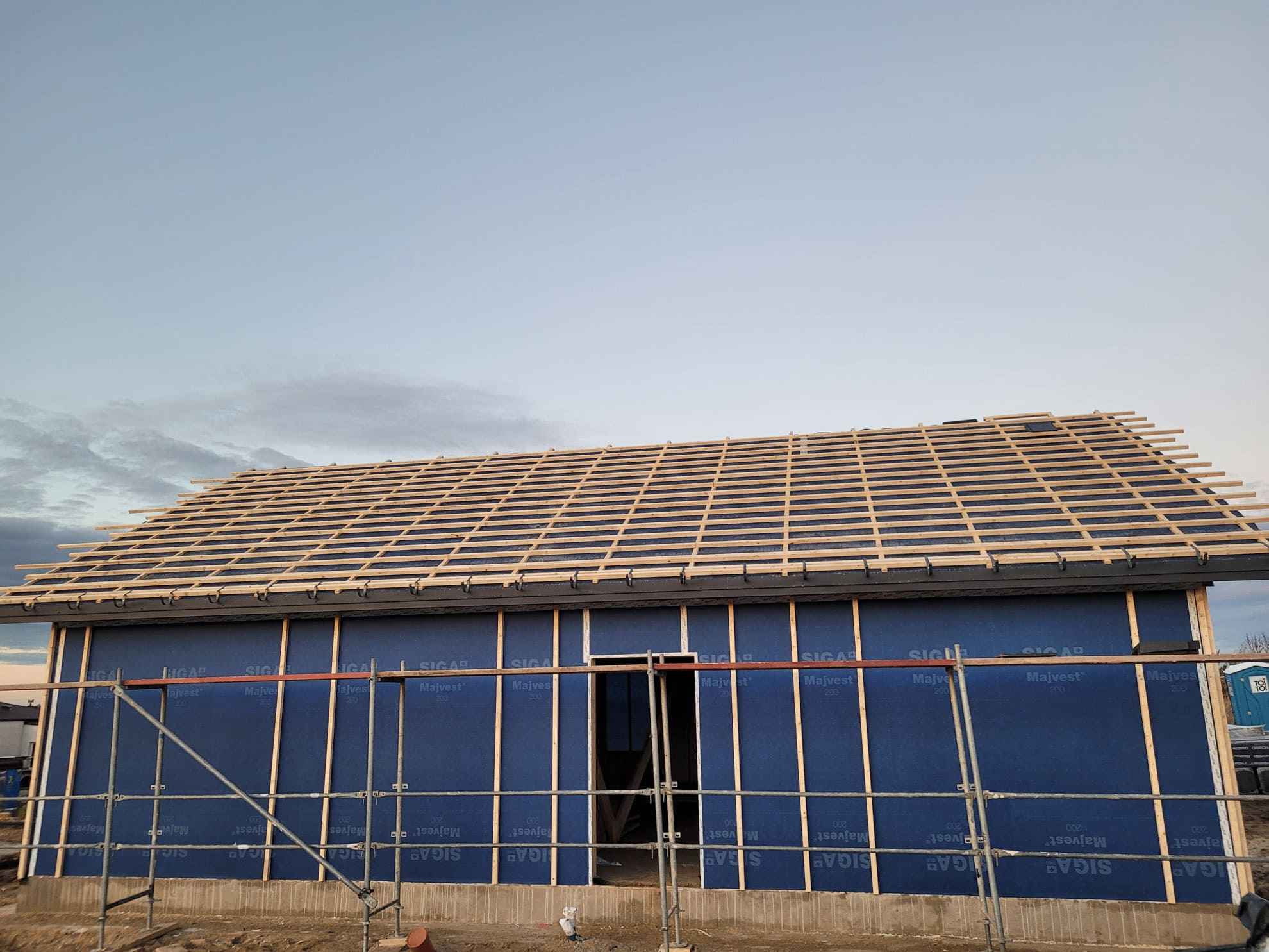 Po wykonaniu pokrycia dachowego budynek mamy wstępnie zabezpieczony przed wpływem warunków atmosferycznych, więc przechodzimy do dalszych etapów prac nie zerkając już co chwilę na prognozy. Na tym etapie budowy jesteśmy przeważnie po dwóch – trzech tygodniach prac.
