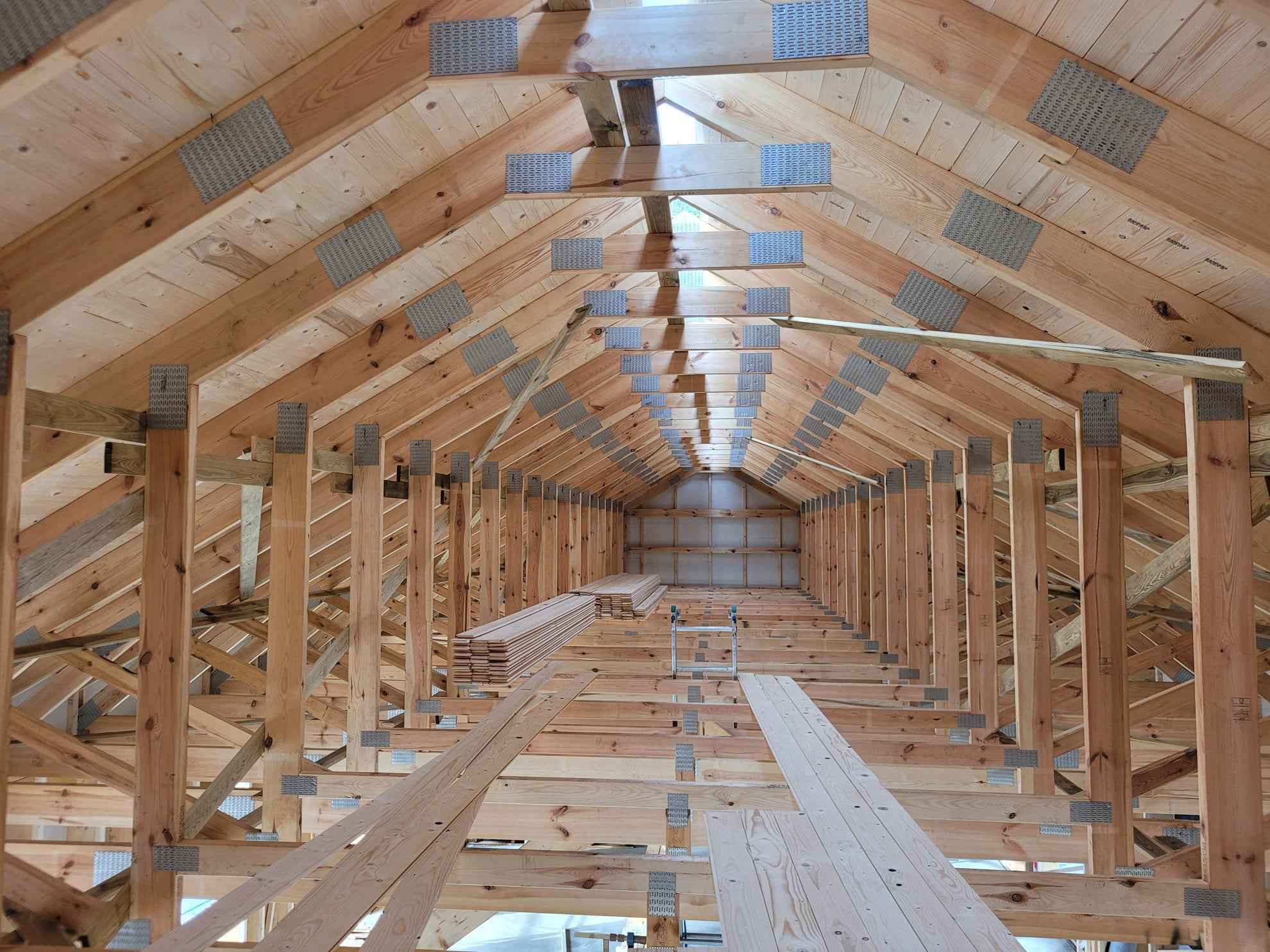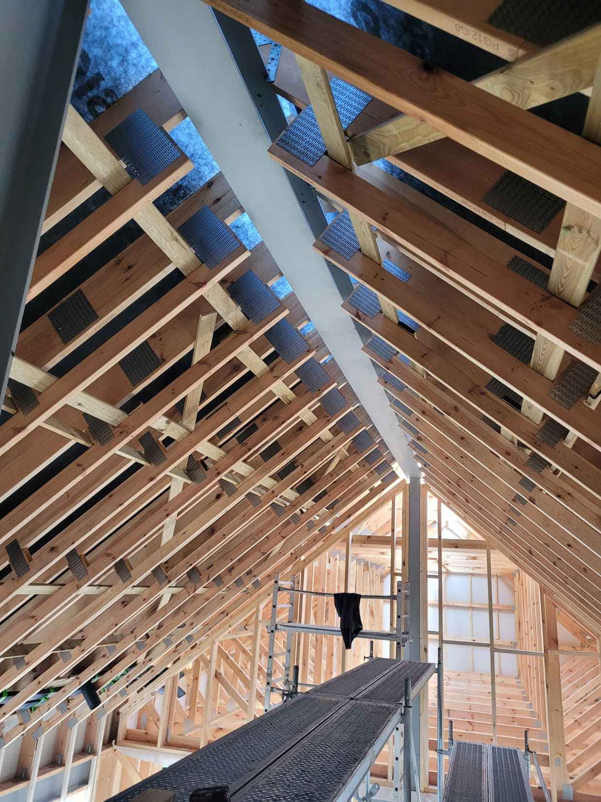 Jeśli chodzi o więźby – stosujemy elementy prefabrykowane, wykonywane przez doświadczonych producentów. Wiązary są elementami o potężnej nośności, pozwalającymi na przeróżne aranżacje budynków zarówno parterowych jak i z poddaszem użytkowym, a wykonane w odpowiedni sposób znacząco przyspieszają również przebieg kolejnych prac (prac instalatorskich, montażu suchej zabudowy). W najprostszych układach – dom parterowy z płaskim sufitem – nie wymagają najczęściej dodatkowych podpór poza ścianami zewnętrznymi, co pozwala na bardzo szerokie możliwości aranżacji wnętrza. W domach z poddaszem użytkowym bądź z sufitami katedralnymi pojawiają się często dodatkowe, najczęściej stalowe, podpory. Montaż takiej więźby jest bardzo szybki, najczęściej zajmuje 1-2 dni robocze. Kluczem jest odpowiednie przygotowanie konstrukcji do jej montażu, aby przebiegł szybko i sprawnie, bez zbędnej „rzeźby” 😊