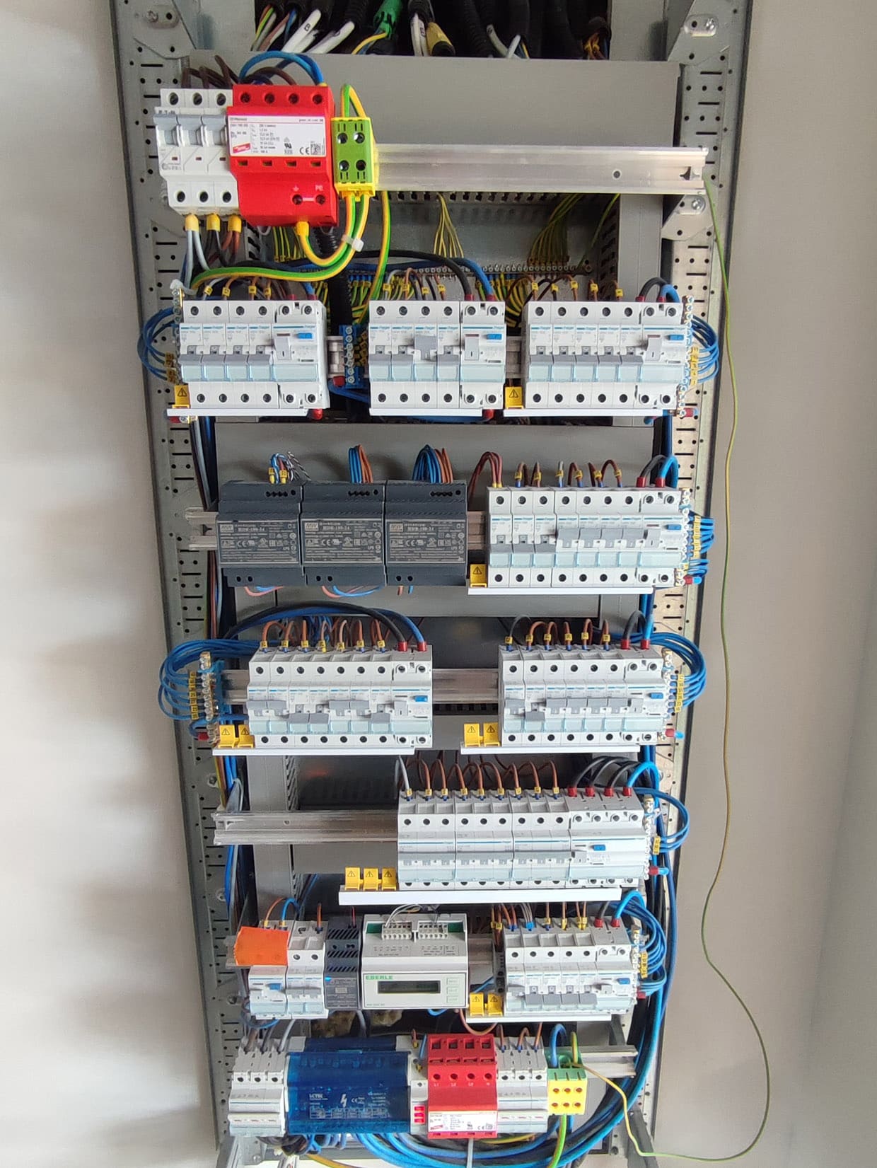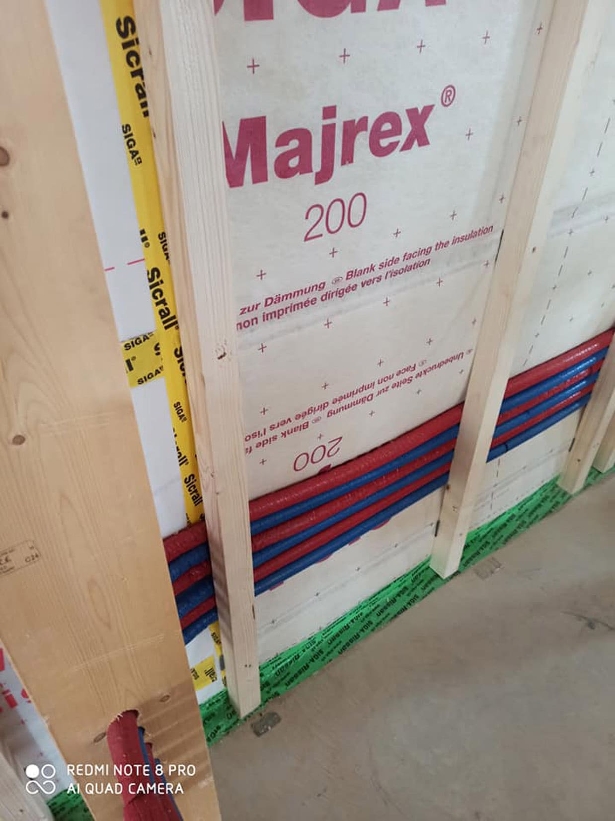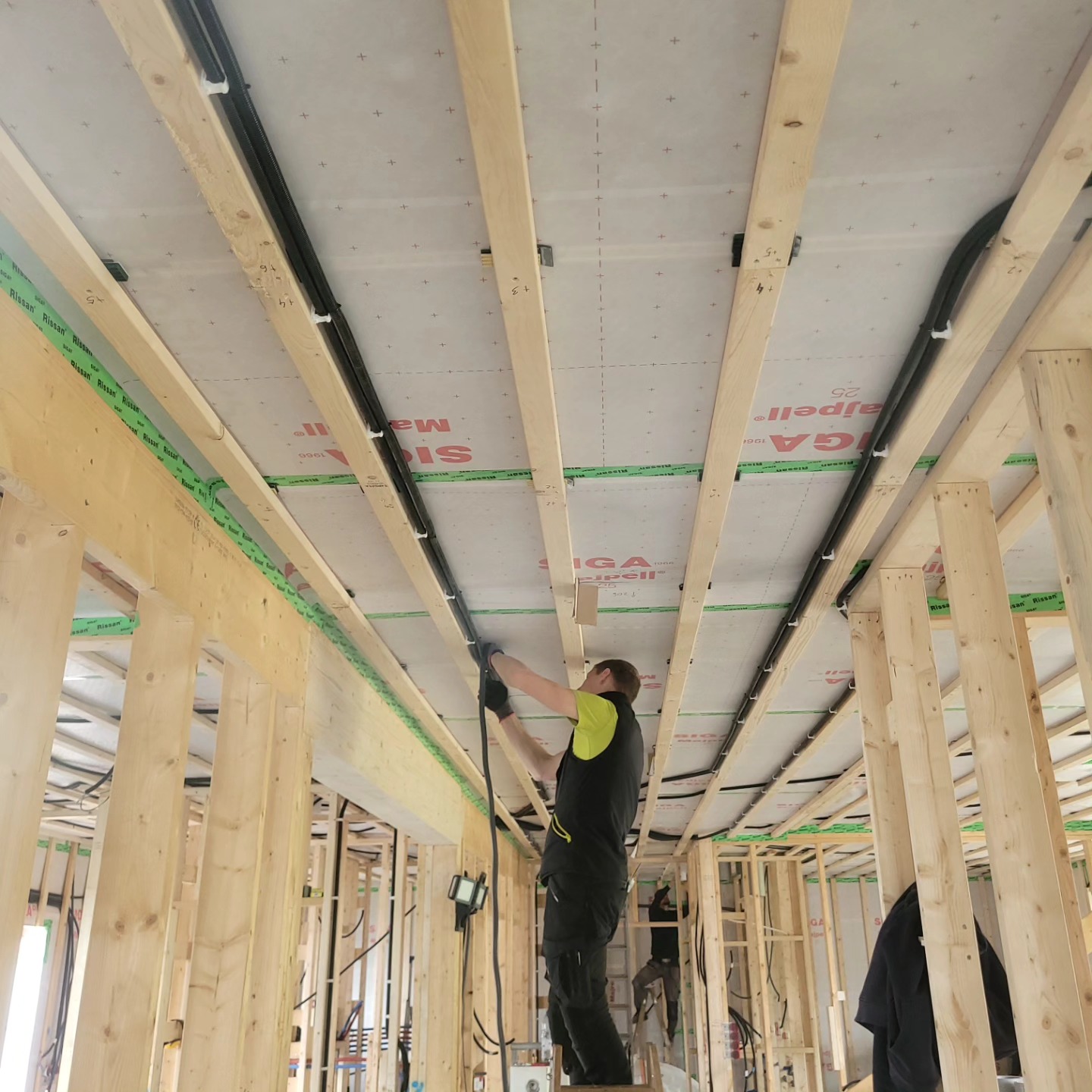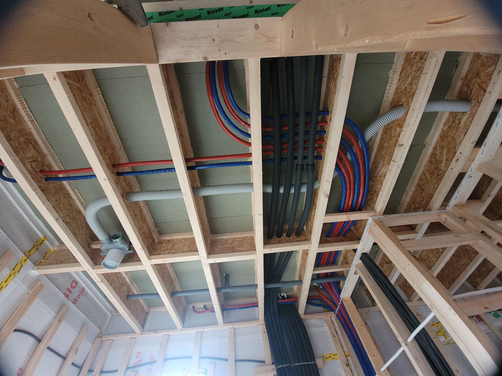 Instalacja rekuperacji: większość kanałów prowadzimy w przewidzianej przestrzeni w wiązarach dachowych, w przypadku domu z poddaszem użytkowym kanały prowadzone są w stropie wykonanym z belek dwuteowych, który umożliwia prowadzenie w nim elementów instalacyjnych o dużej średnicy. Prace instalatorskie, w zależności od stopnia skomplikowania budynku, mogą zająć od dwóch tygodni do miesiąca czasu – to w wypadku domu z bardzo rozbudowaną instalacją elektryczną typu smart home. Zaczynamy jednak od elementów instalacji, które przechodzą przez ściany zewnętrzne – tak, aby jak najszybciej można było zabrać się za prace związane z wykończeniem elewacji budynku. Mamy w tym momencie najczęściej 5-6 tydzień prac na budowie.