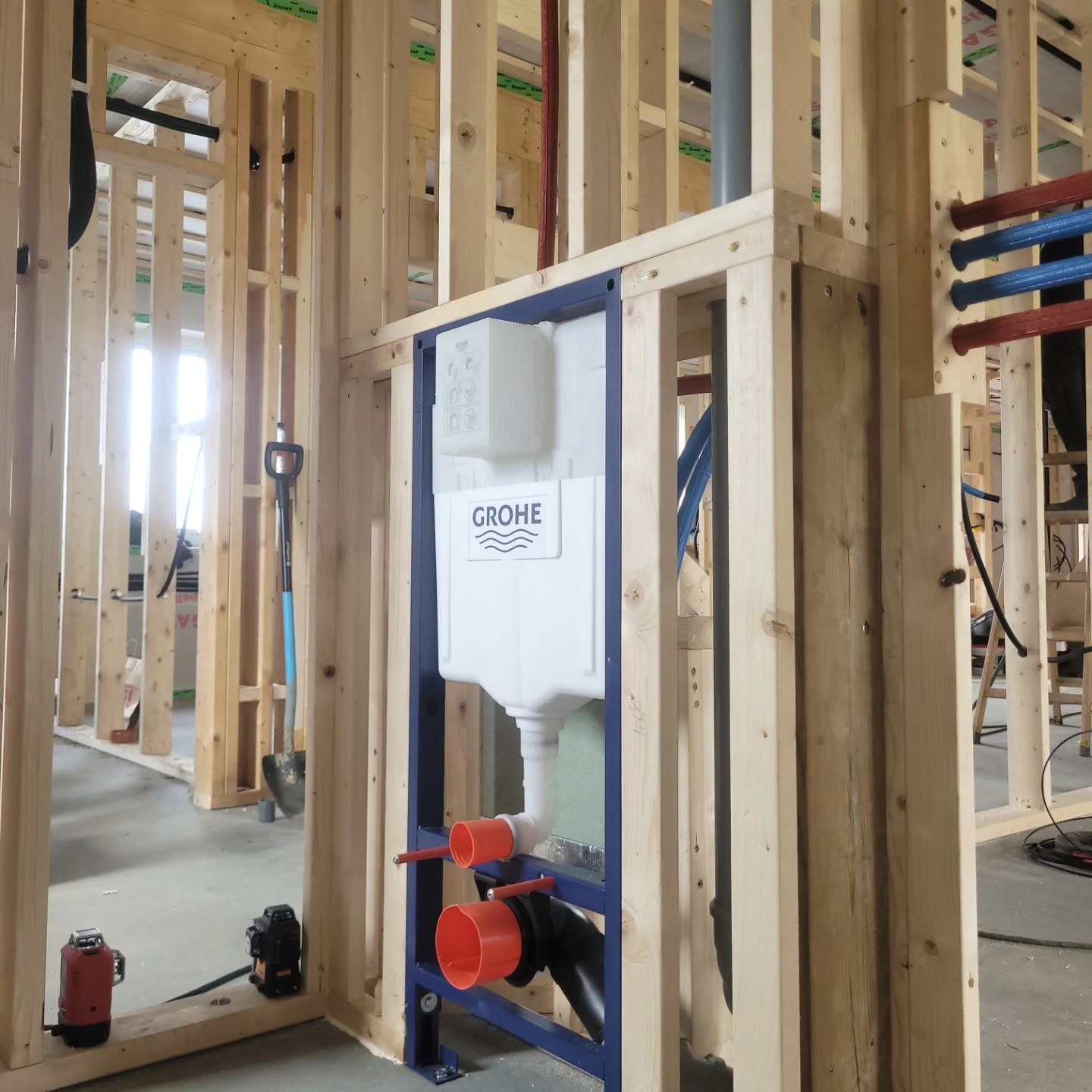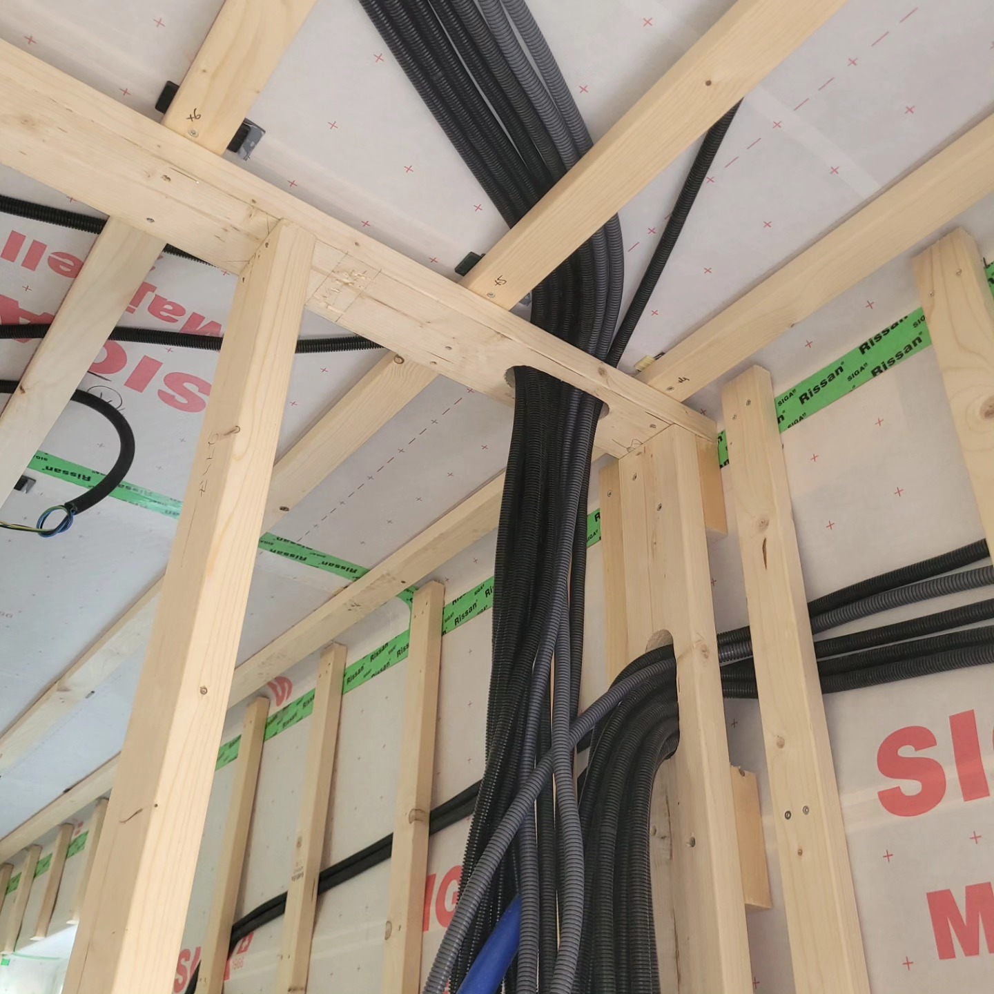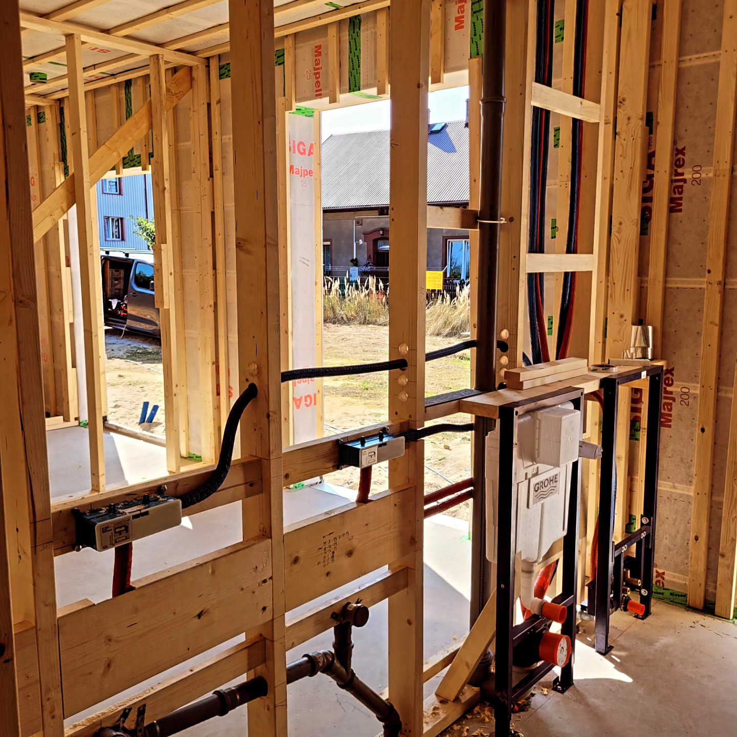 Po montażu ścianek działowych nasza ekipa „ucieka” na elewację budynku, a do akcji wkraczają największe szkodniki – instalatorzy 😊 Wkraczają psuć to, co my zbudowaliśmy – czyli ciąć, wiercić, dziurawić i bałaganić. Sęk w tym, żeby wiedzieli na co mogą sobie pozwolić i mieli doświadczenie przy domach szkieletowych.