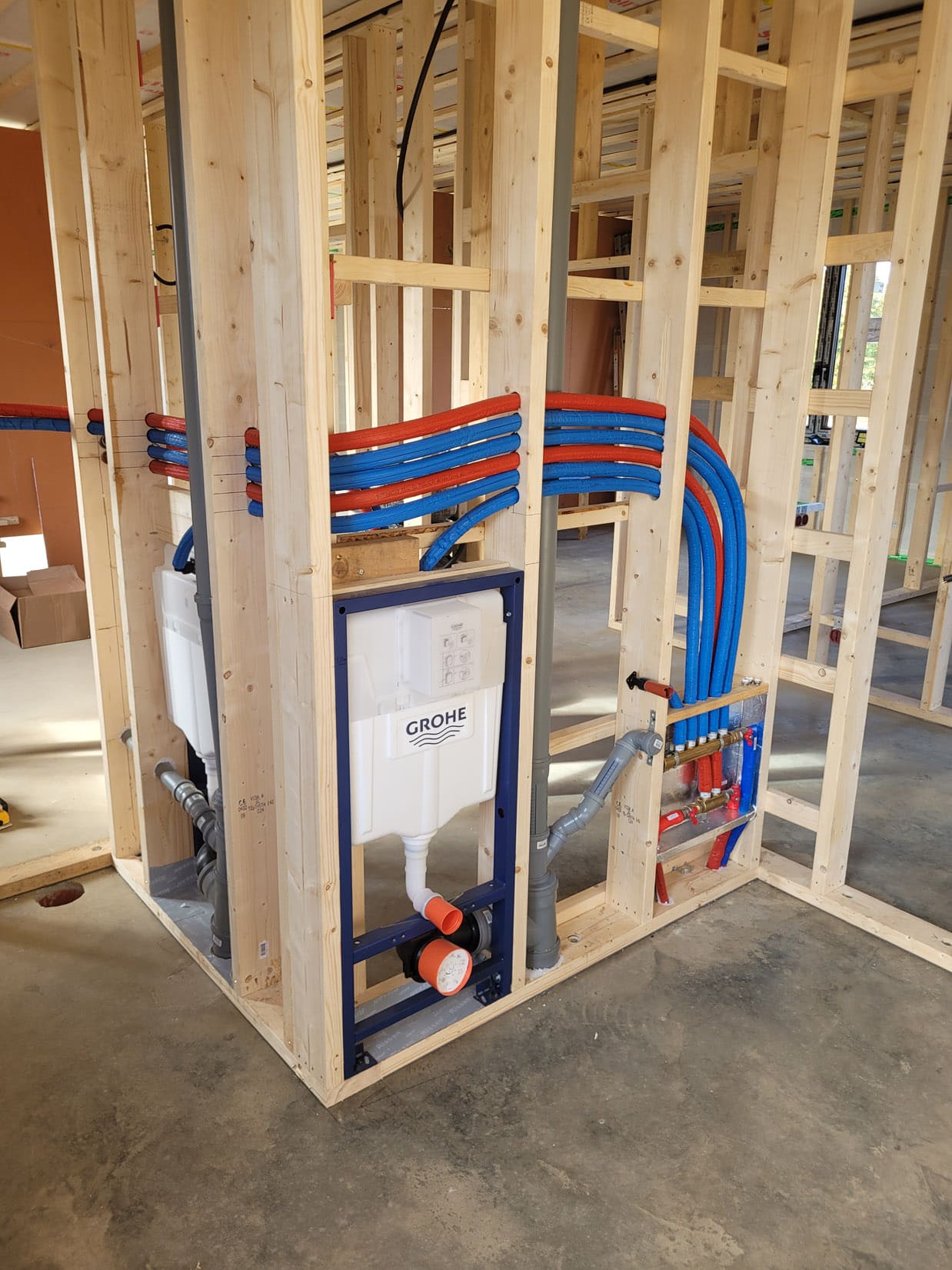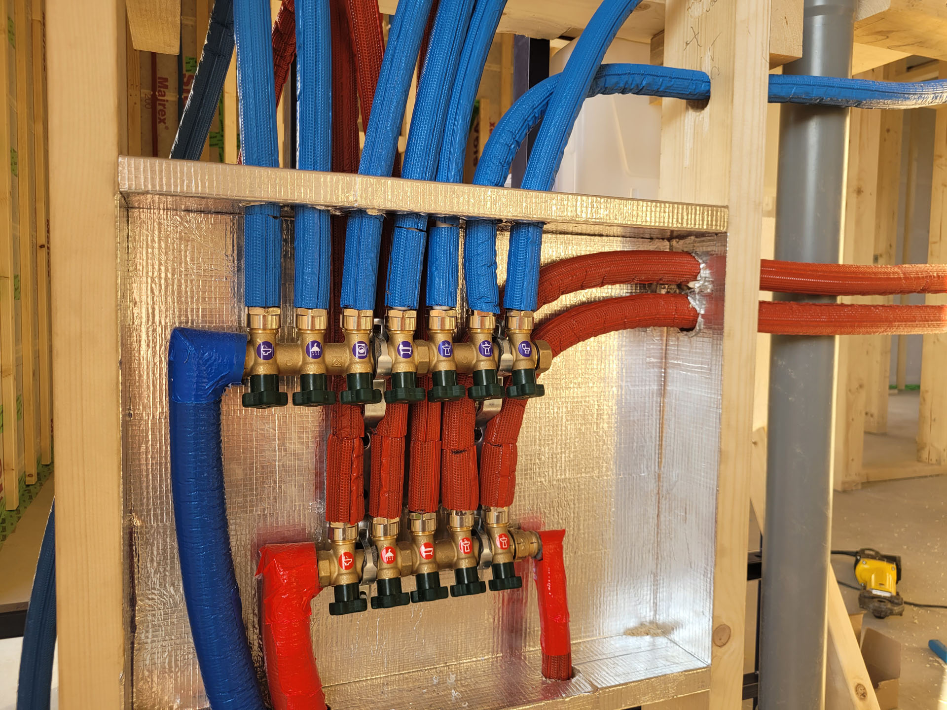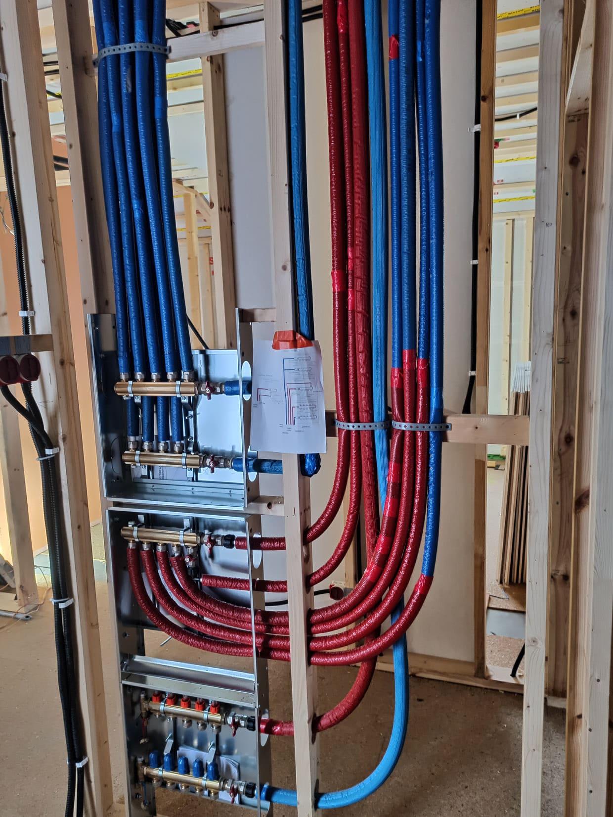 Instalacja wod-kan: Sporo elementów jest już umieszczonych w grzewczej płycie fundamentowej. Instalację wodną wykonujemy z zastosowaniem rozdzielaczy, co eliminuje większość kształtek, łączników rur – czyli potencjalnych punktów awarii instalacji.