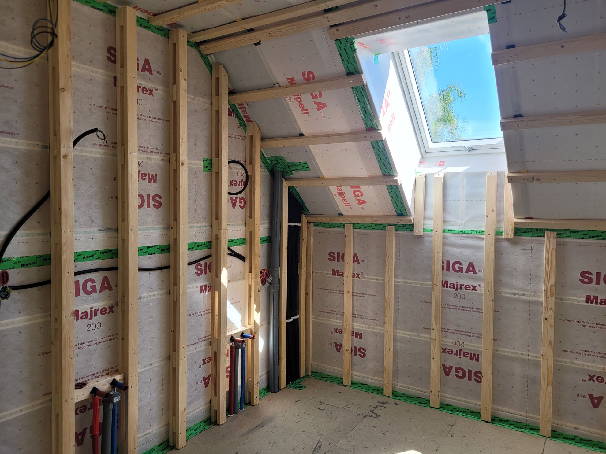 Ścianki działowe wykonujemy po etapie montażu paroizolacji oraz rusztów sufitowych. Dlaczego? Mamy w takim wypadku przygotowane przejścia instalacyjne z rusztu sufitowego i rusztów ściennych do ścianek działowych, powstaje mniejsza ilość koniecznych do klejenia łączeń paroizolacji. Stawiając ścianki działowe musimy trzymać się prostych zasad: montować słupki z uwzględnieniem prawidłowych cięć płyt gipsowych (tzw. „L-ki” nad otworami drzwiowymi), oraz ustawiać słupki krzywizną w jedną stronę. Dobrą praktyką jest umieszczanie wypukłej strony słupka od strony „ważniejszego” pomieszczenia, gdzie bardziej zależy nam na estetyce i nie mamy możliwości „nadrobienia” czymś nierówności drewna konstrukcyjnego. I tak np. w ścianie pomiędzy salonem a łazienką ustawiamy słupki częścią wypukłą - którą możemy zestrugać – do salonu, a wklęsła część pozostaje po stronie łazienki. Drewno konstrukcyjne nie jest perfekcyjnie proste, to naturalny materiał, i o ile jesteśmy sobie w stanie bez problemu poradzić z jego krzywiznami na ścianach zewnętrznych, które „prostujemy” rusztami, tak w ścianach działowych nie mamy już takiej możliwości, i nie będą tak perfekcyjnie proste jak ściany zewnętrzne.