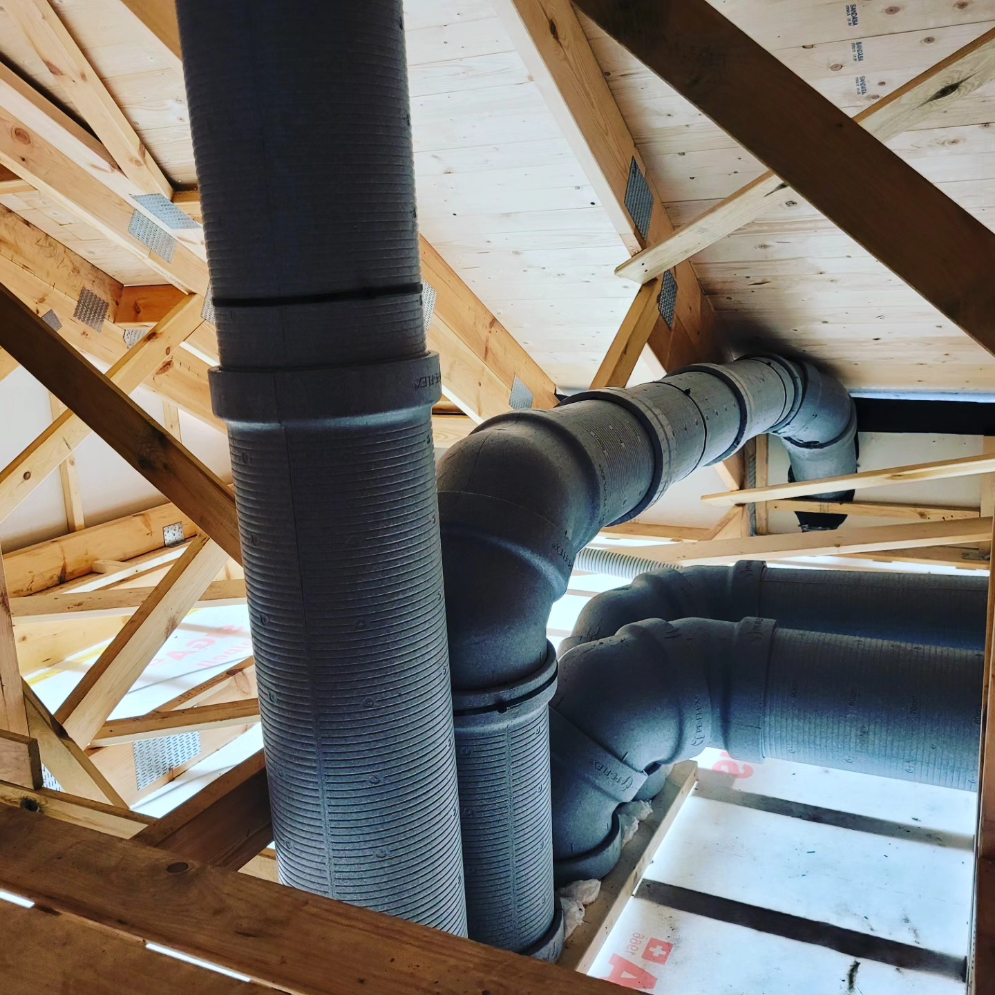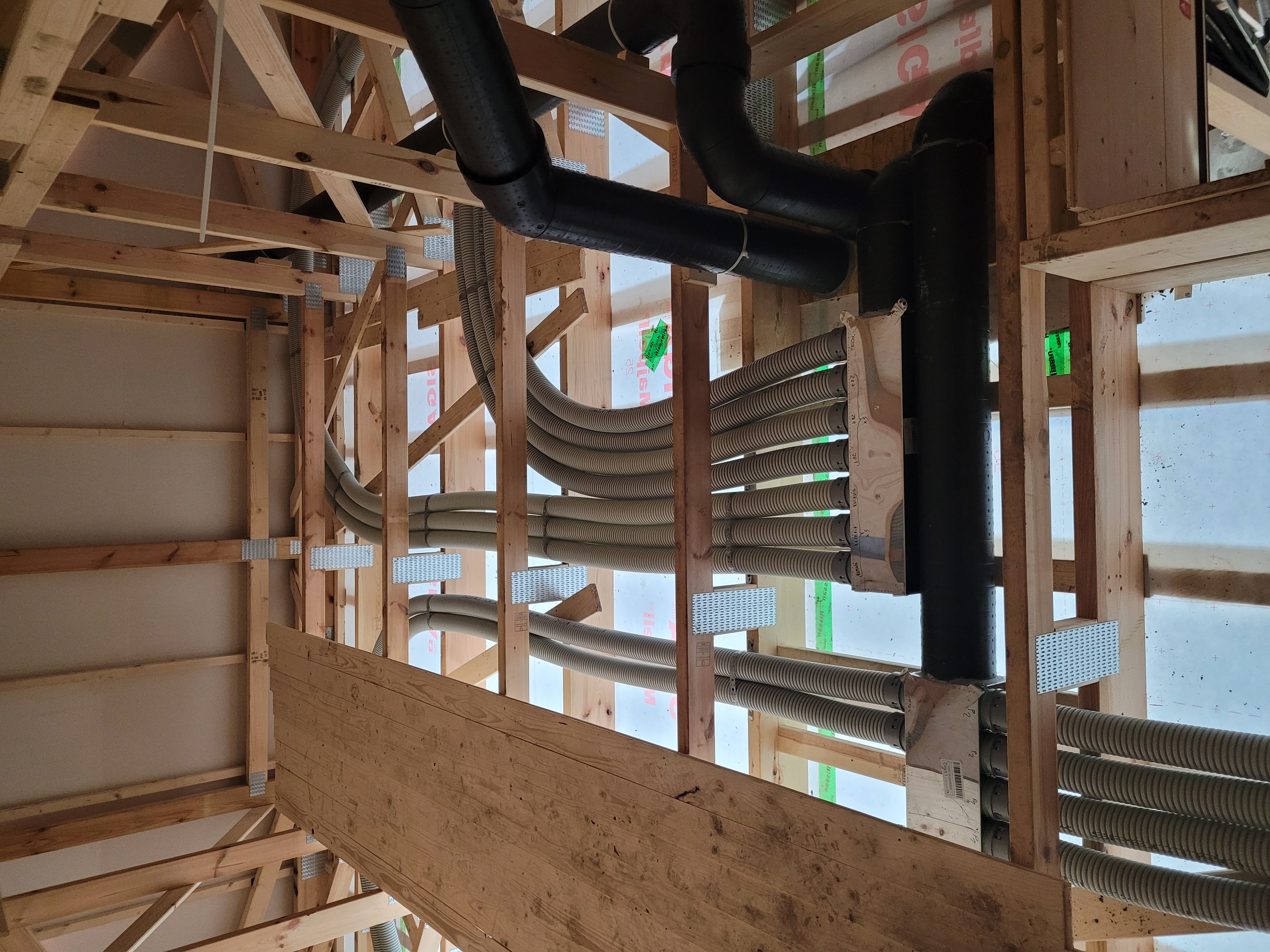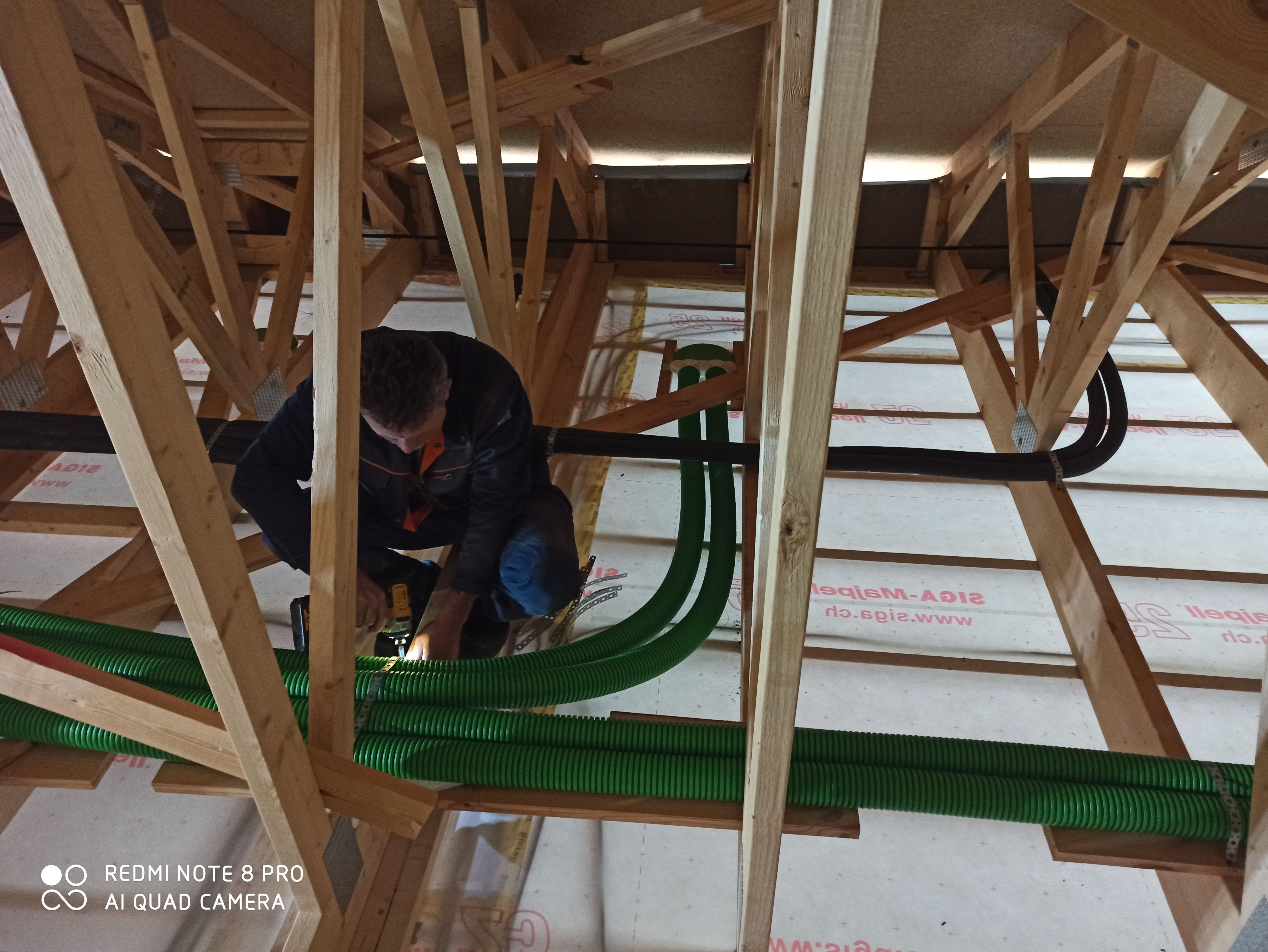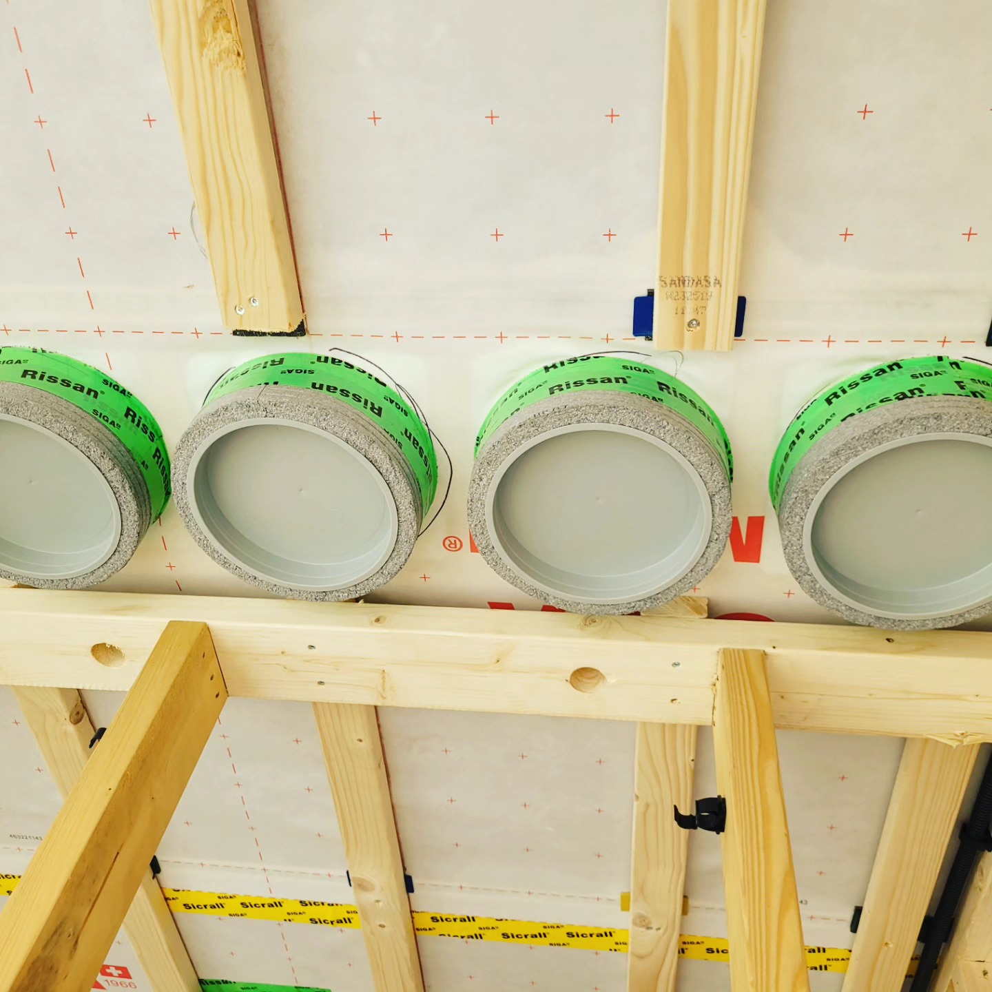Skoro już mamy szczelnie wykonane wszystkie przejścia elementów instalacyjnych na zewnątrz, możemy zająć się wykonywaniem elewacji oraz prac związanych z montażem suchej zabudowy. Wkraczamy w końcowe etapy budowy, jesteśmy najczęściej w 6-8 tygodniu prac.