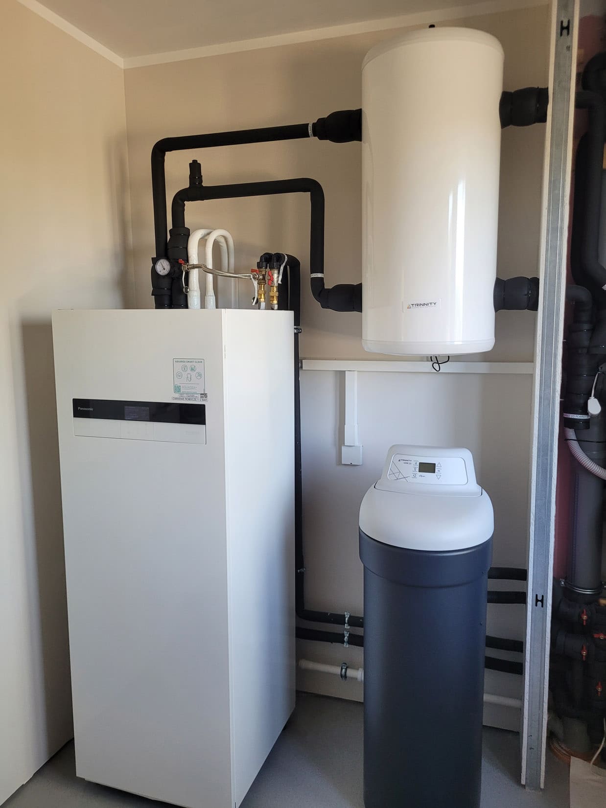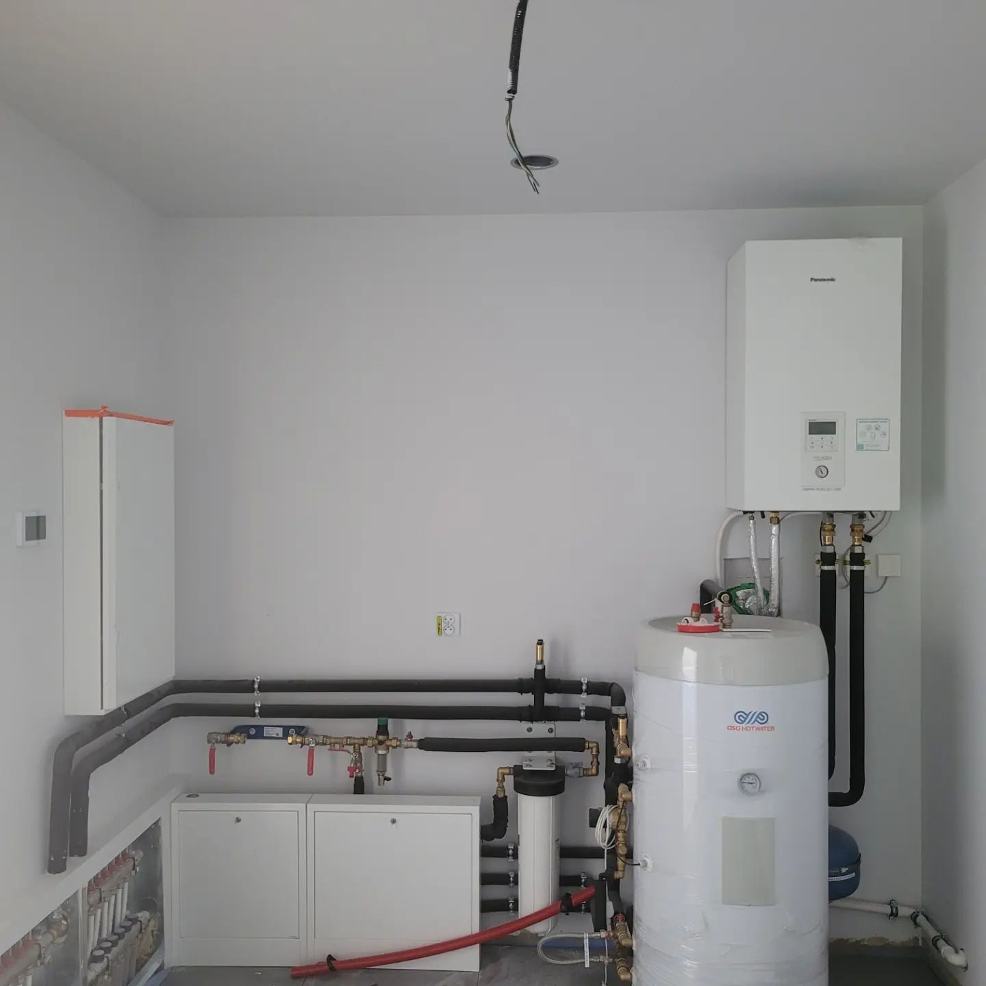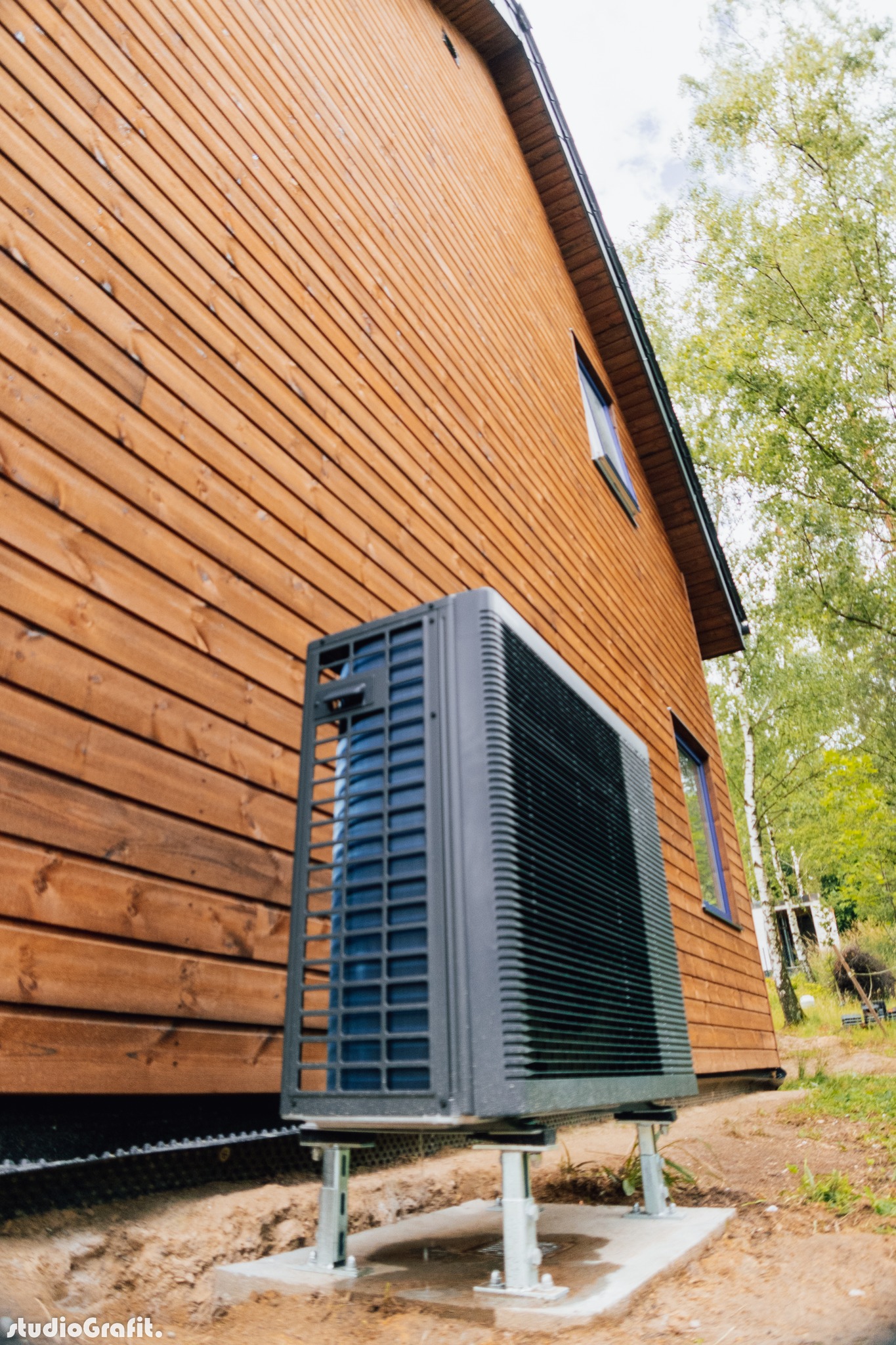 Dużo zależy od samej bryły, wielkości budynku, przeszkleń i ich usytuowania względem stron świata, nawyków mieszkańców, stąd duże widełki. Generalnie im większy i prostszy budynek, tym niższy koszt ogrzewania w przeliczeniu na m2 powierzchni. Samo urządzenie działa na podobnej zasadzie jak lodówka, czy klimatyzator. Pompy ciepła najbardziej efektywnie pracują na niskiej tzw. delcie – różnicy temperatur pomiędzy środowiskiem zewnętrznym a temperaturą zasilania ogrzewania, stąd grzewcza płyta fundamentowa o wyjątkowo niskiej wymaganej temperaturze zasilania + energooszczędny budynek doskonale współpracują z pompami ciepła, zużycie energii jest wyjątkowo niskie. Montaż pompy ciepła jest dwuetapowy – przy pierwszej wizycie ekipa montażowa instaluje przewody łączące jednostkę zewnętrzną z wewnętrzną – przed wykonaniem elewacji i suchej zabudowy w budynku – tak, aby prawidłowo uszczelnić przejścia instalatorskie przez wiatro- i paroizolację, sam montaż pompy ciepła przeprowadzany jest później, jako jeden z końcowych etapów prac.