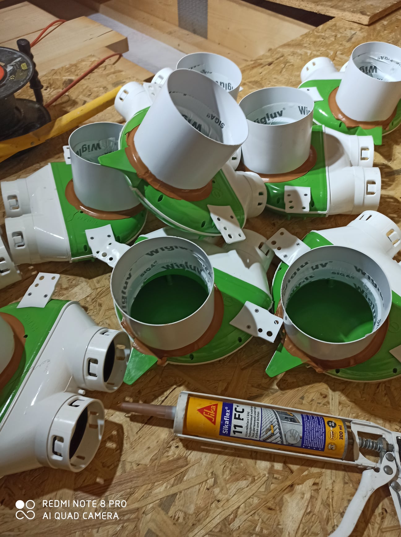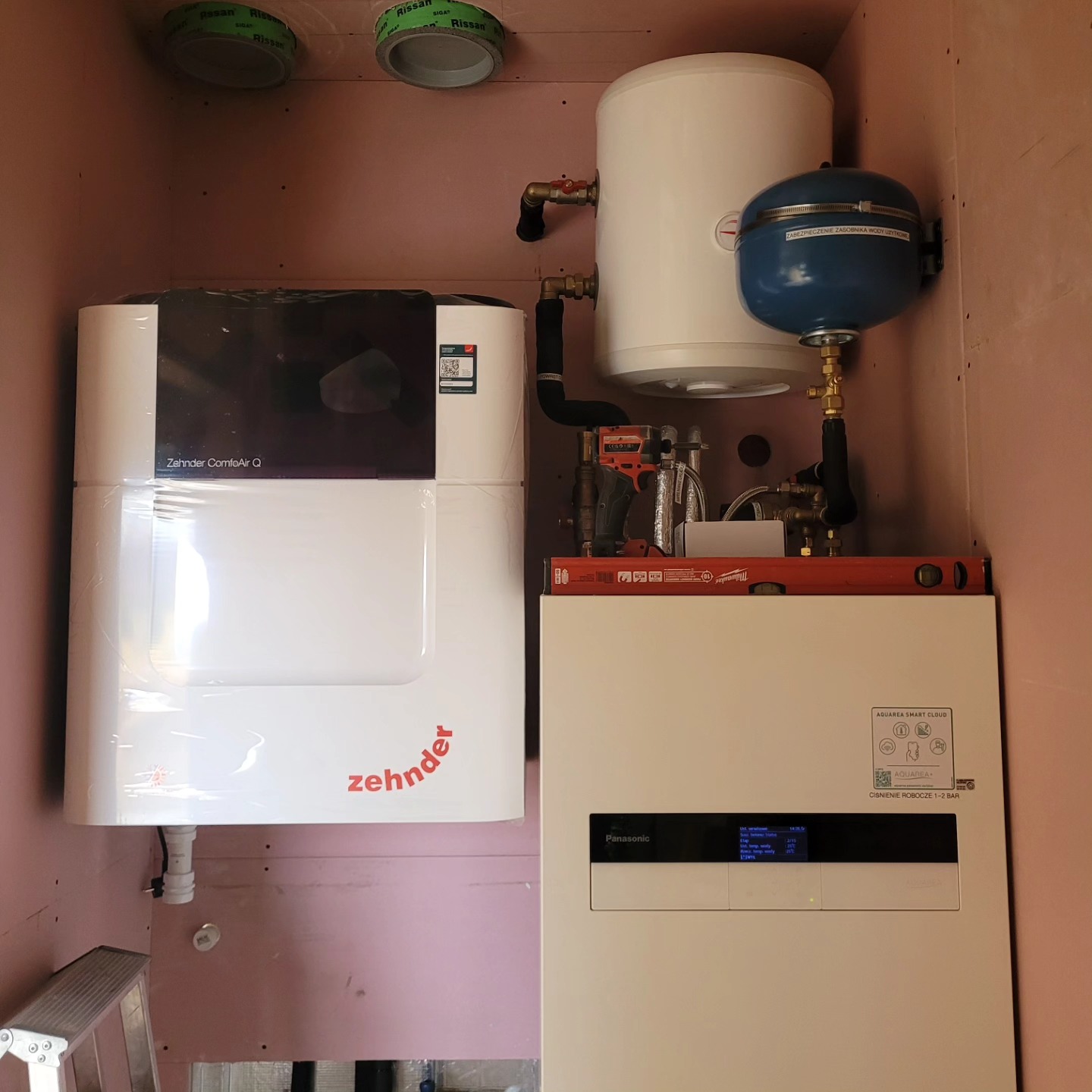 Prace instalatorskie w toku. Zajmiemy się teraz zagadnieniem źródła ogrzewania budynku oraz rekuperacją. W energooszczędnym budynku praktycznie każde źródło ogrzewania generowało będzie marginalny koszt, niższy niż koszt wyprodukowania ciepłej wody użytkowej. Skupiamy się rzecz jasna na rozwiązaniach komfortowych i bezobsługowych, więc paliwa stałe i kominy odpadają, nie są brane pod uwagę. Najczęściej stosowanym przeze mnie rozwiązaniem jest pompa ciepła typu powietrze-woda, i na tym rozwiązaniu się skupimy.