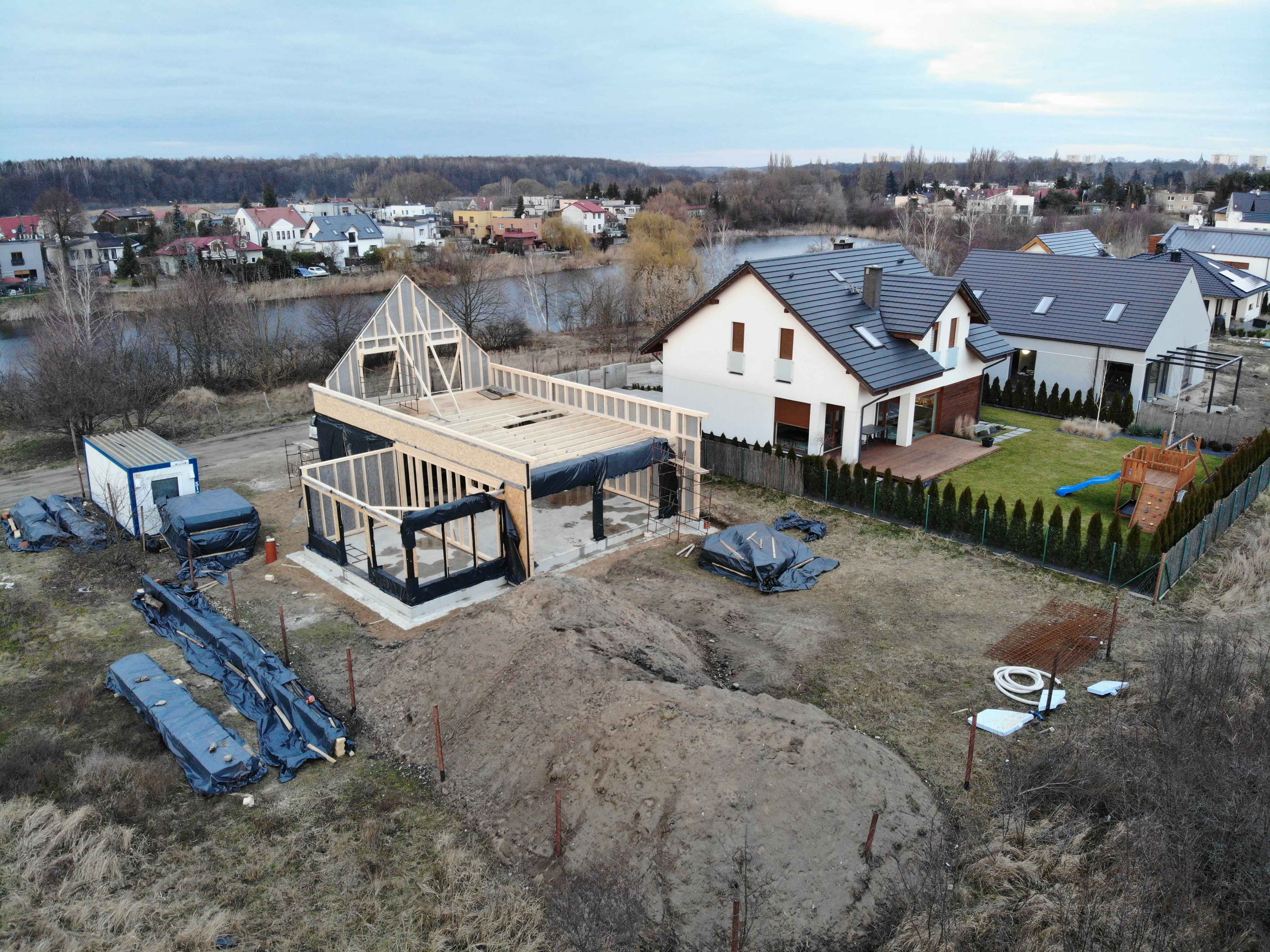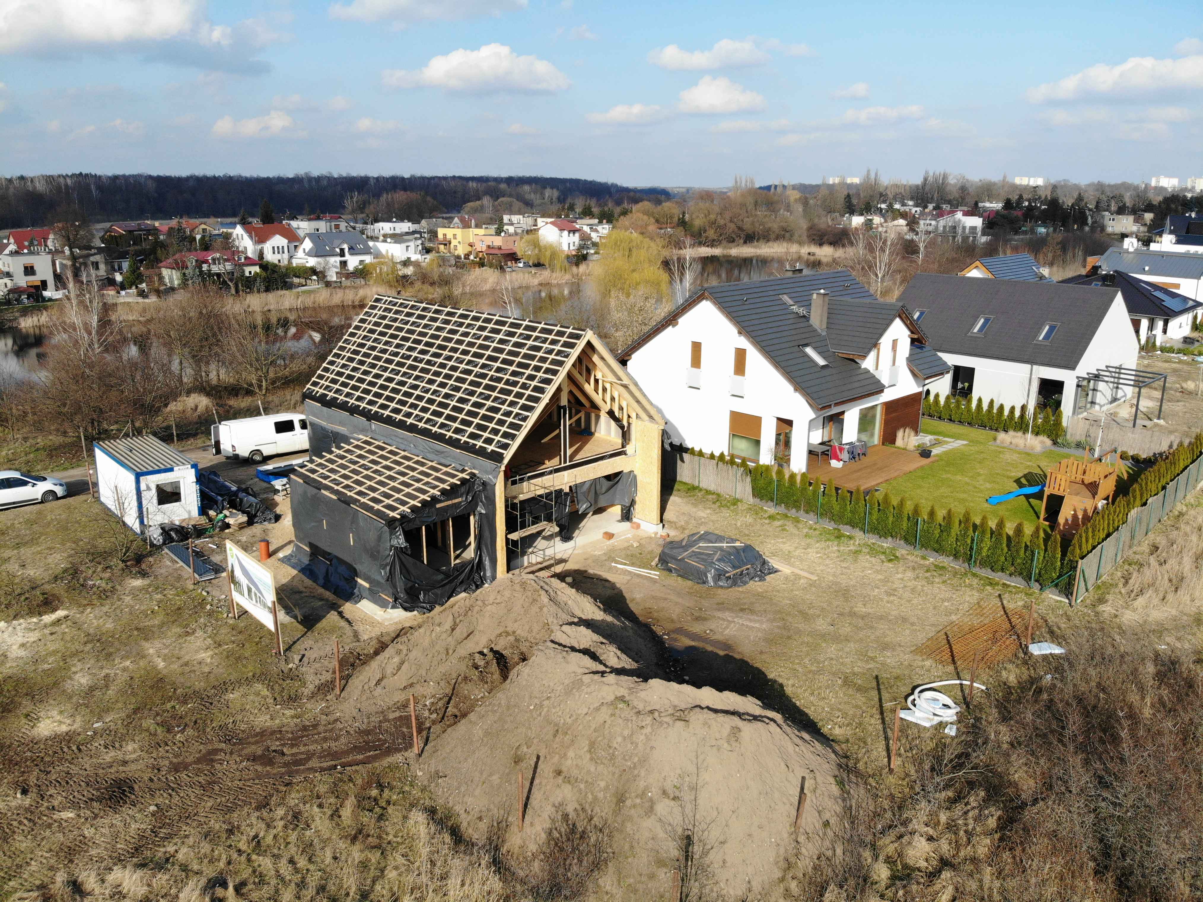 Kolejnym krokiem jest zabezpieczenie budynku przed warunkami atmosferycznymi i stopniowe zamykanie bryły. Pojawiają się membrany dachowe, łaty oraz elementy przygotowujące pod docelowe pokrycie. Zamknięcie budynku pozwala na kontynuację prac niezależnie od pogody, rozpoczęcie kolejnych etapów wykończeniowych, ochronę konstrukcji drewnianej.
