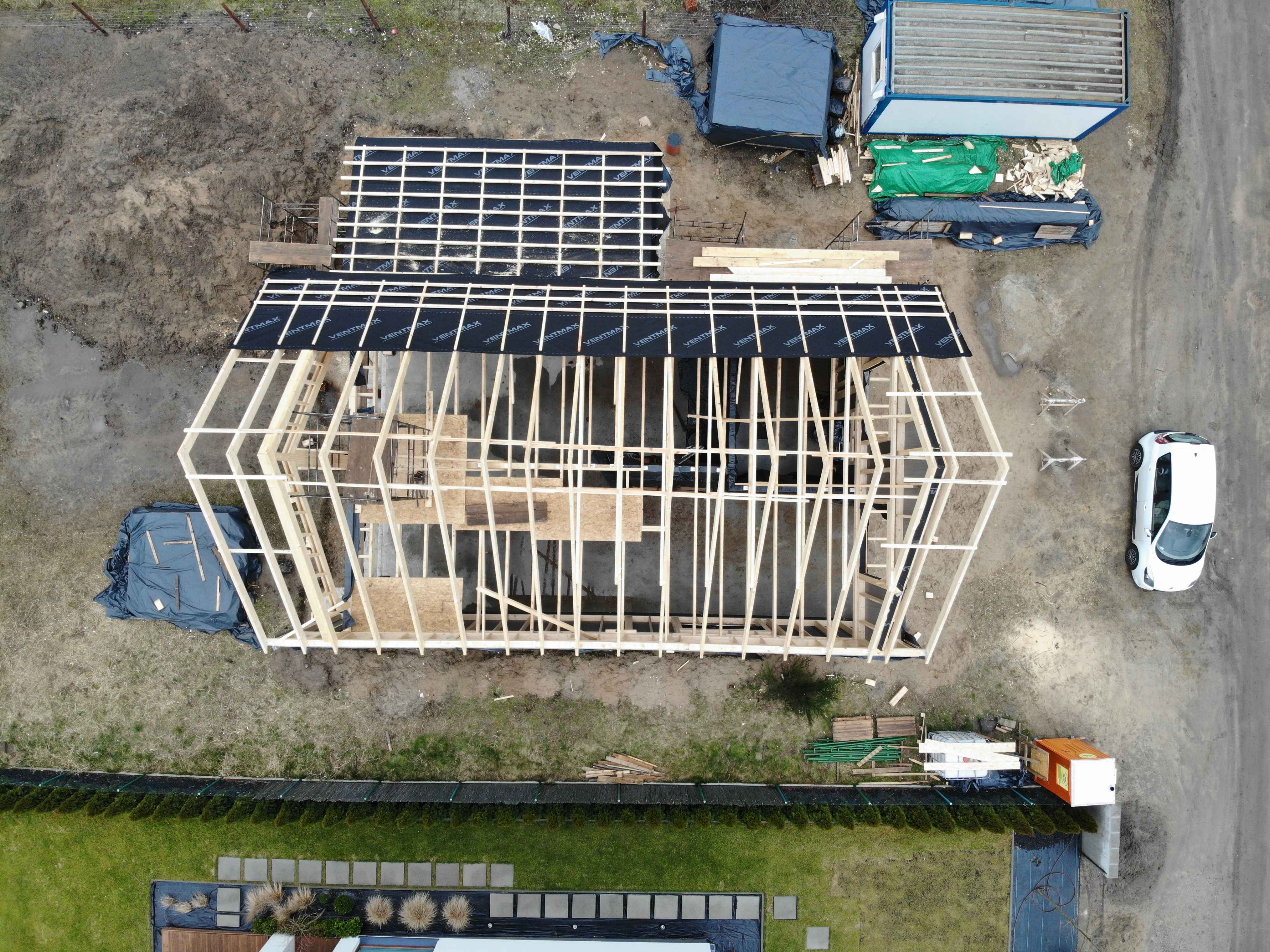Po wykonaniu ścian i stropów rozpoczyna się montaż konstrukcji dachu. Na tym etapie wyraźnie widać geometrię budynku oraz proporcje bryły, choć dom nie jest jeszcze zamknięty. Realizowane są m.in.: więźba dachowa, elementy nośne konstrukcji, przygotowanie pod dalsze warstwy dachu. To moment przejściowy, w którym budynek nabiera ostatecznej formy przestrzennej.