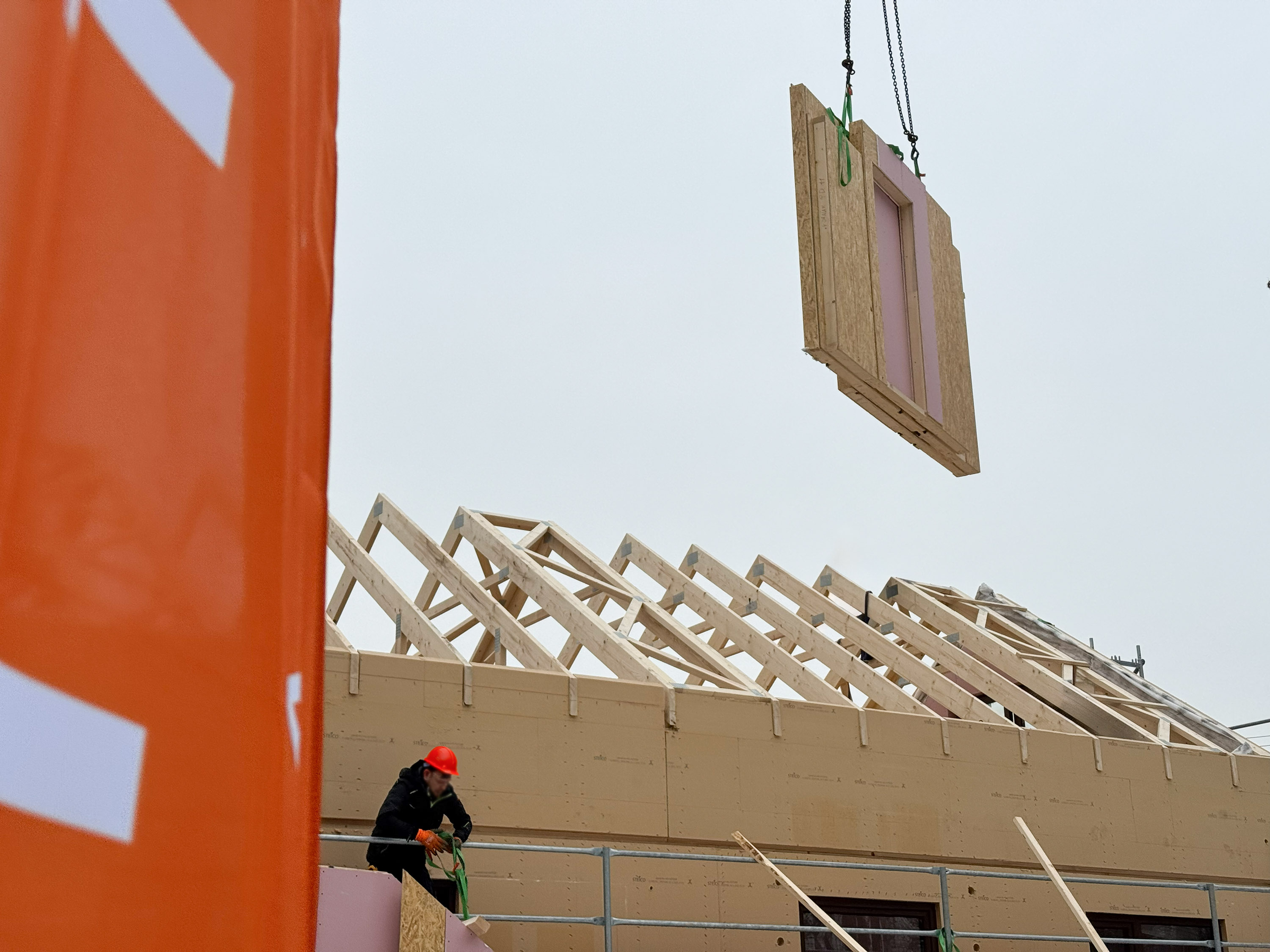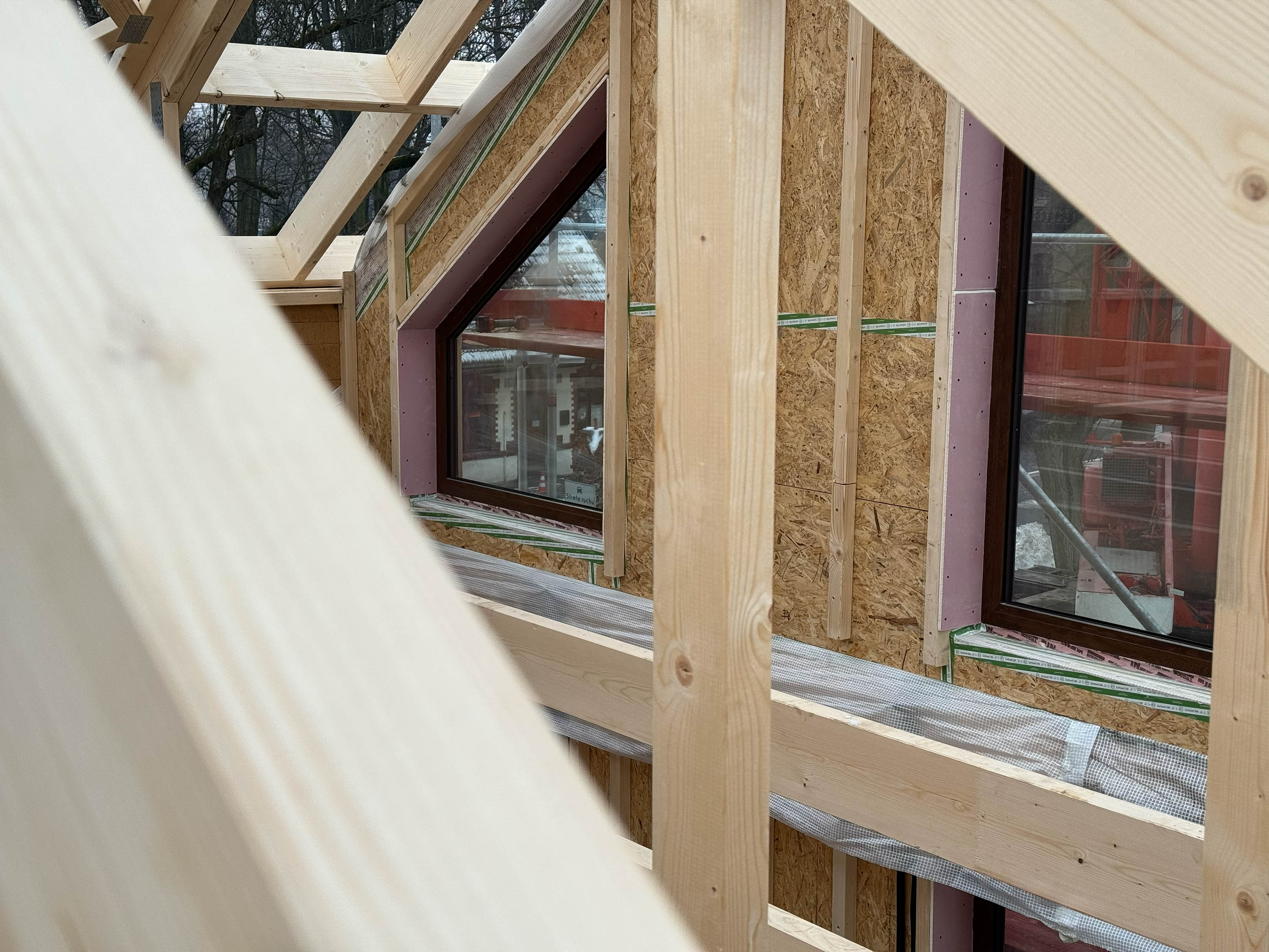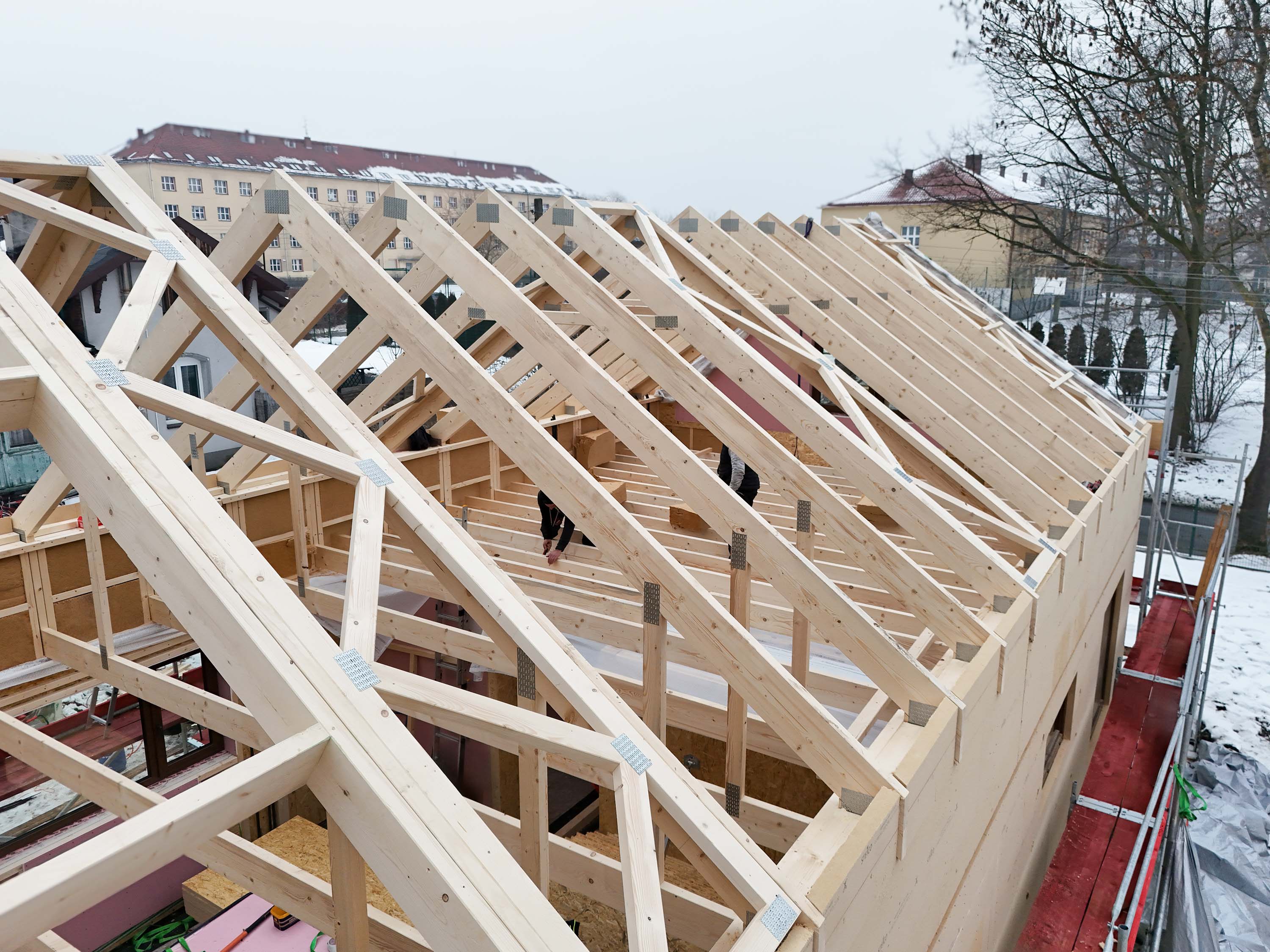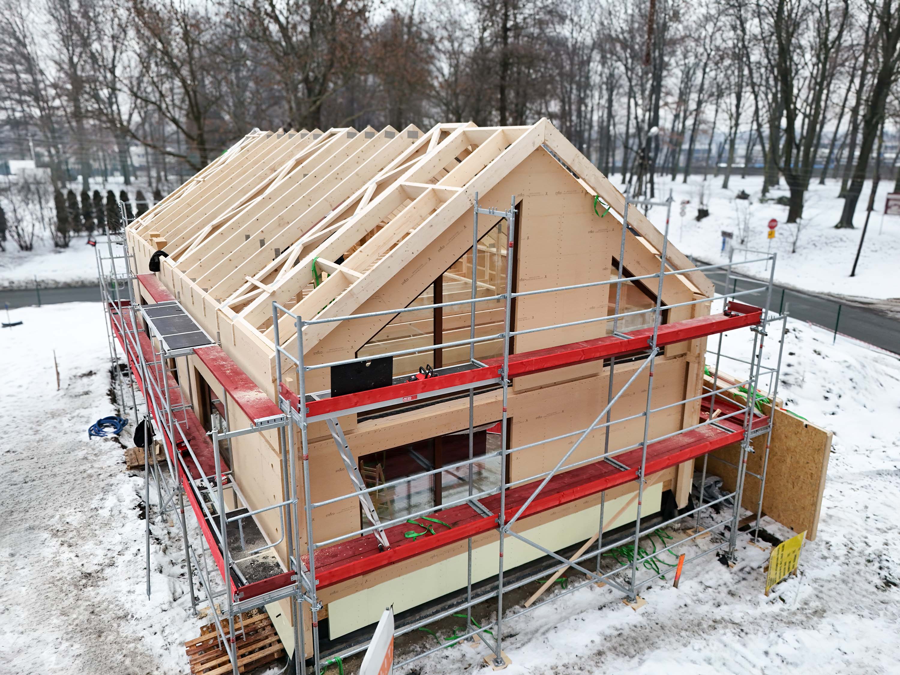 Zbliżenia konstrukcji dachu i ścian pokazują jedną z największych zalet tej technologii — precyzję. Lekka, ale solidna drewniana konstrukcja, czytelny układ krokwi i dokładnie przygotowane otwory okienne sprawiają, że bryła rośnie szybko, ale bez chaosu typowego dla tradycyjnych budów. Antresola i wysoki salon są już wyraźnie czytelne na etapie stanu surowego, co dobrze zapowiada późniejszą przestrzeń i światło we wnętrzu.