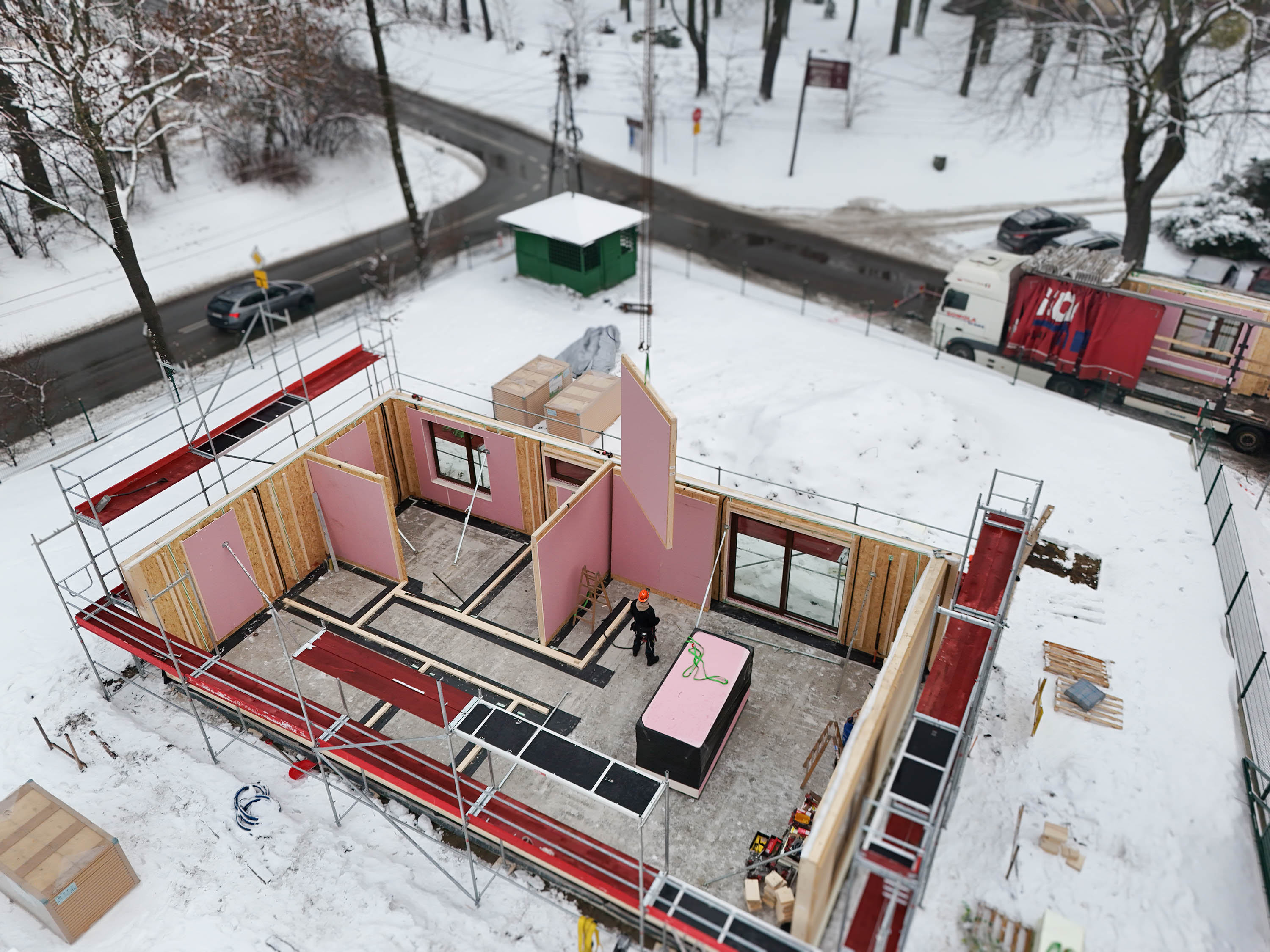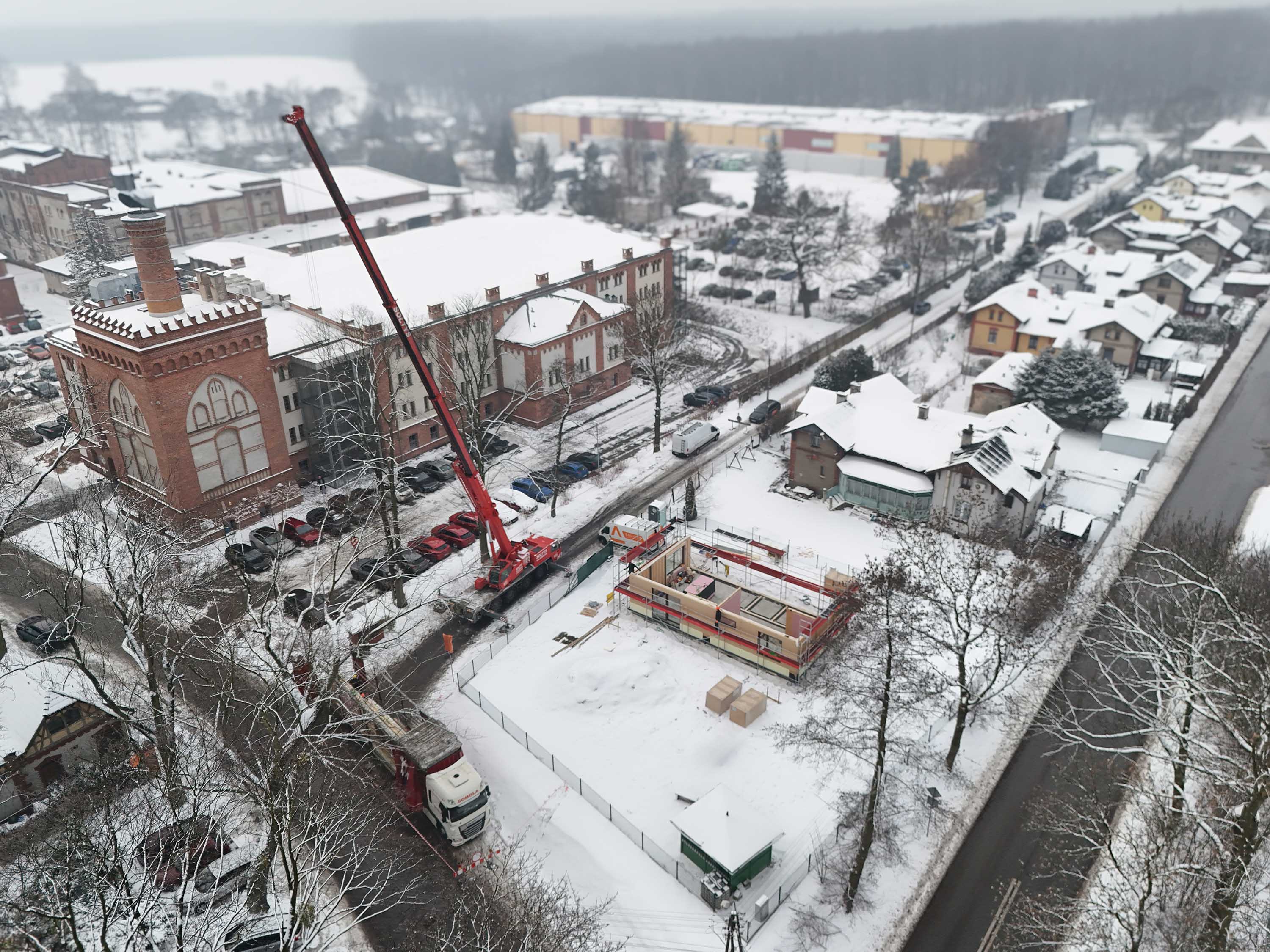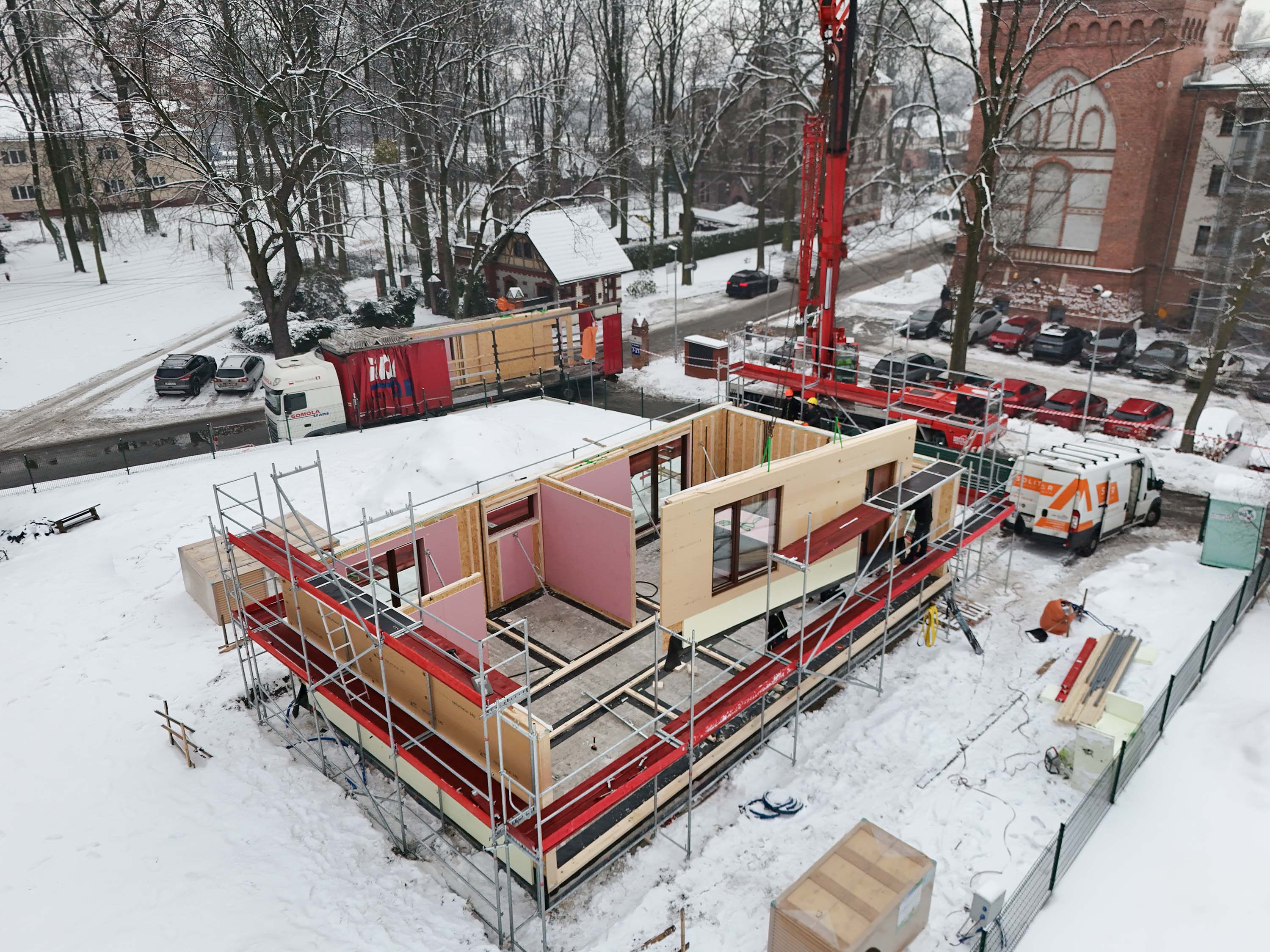 Środek zimy, śnieg na działce i precyzyjnie zaplanowana logistyka — te zdjęcia dobrze pokazują, jak w praktyce wygląda prefabrykowana realizacja SOLE 85 LOFT. Z lotu ptaka widać uporządkowany plac budowy i kolejne elementy układane w logiczną całość. Nie ma tu improwizacji: każdy panel, każda ściana i więźba dachowa trafiają na swoje miejsce w określonej kolejności. To moment, w którym projekt z rysunku technicznego zaczyna nabierać realnych proporcji.
