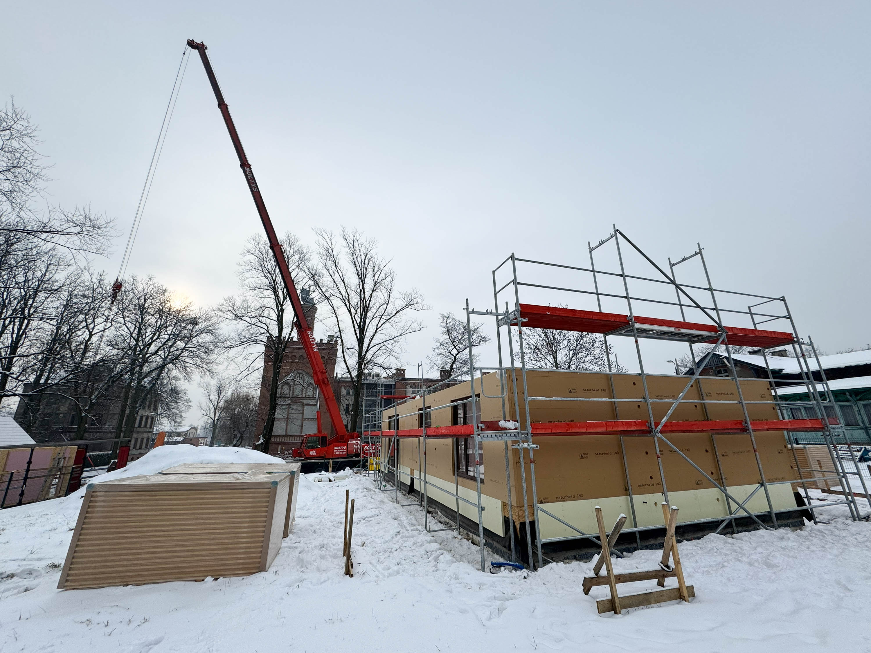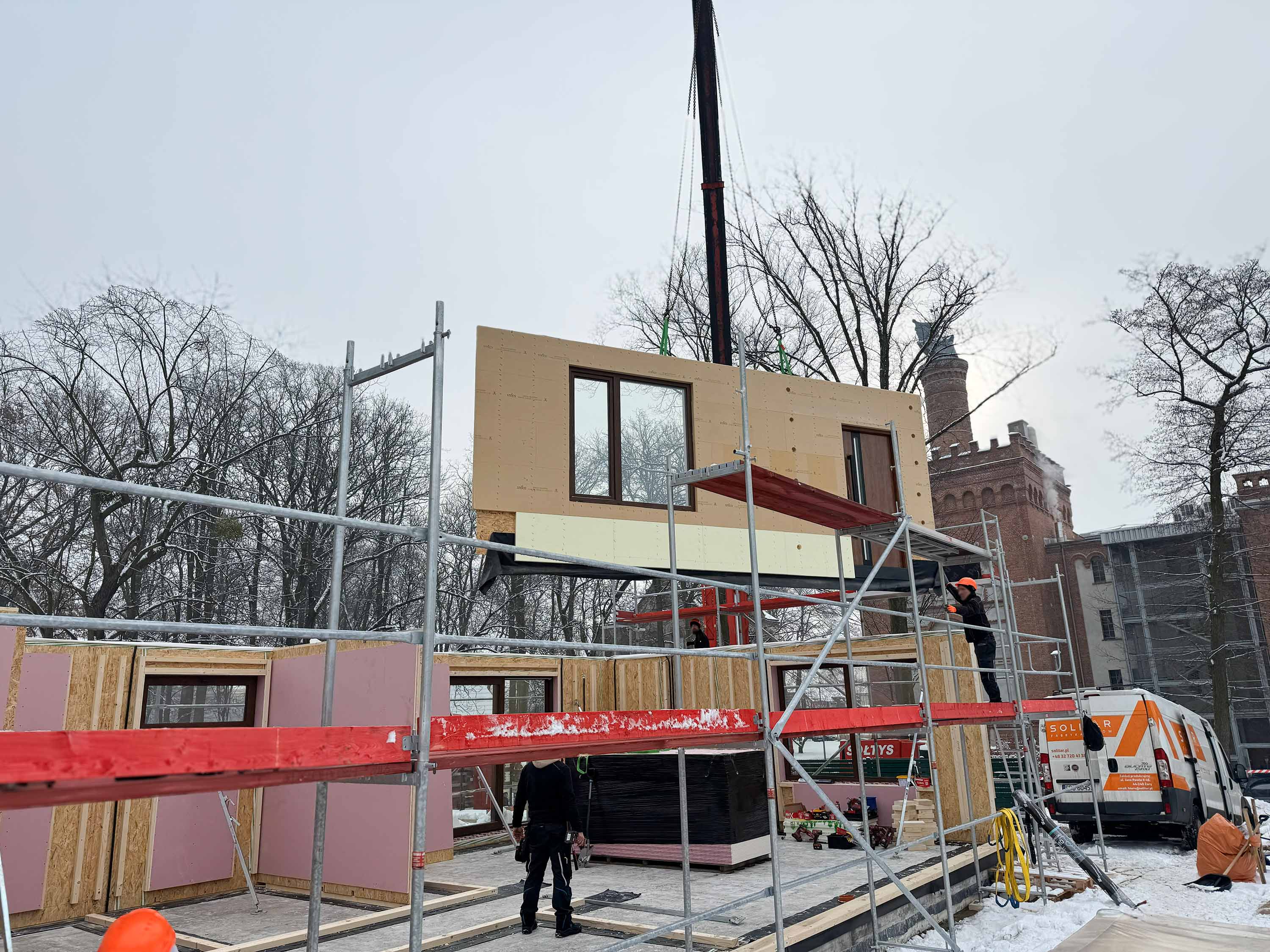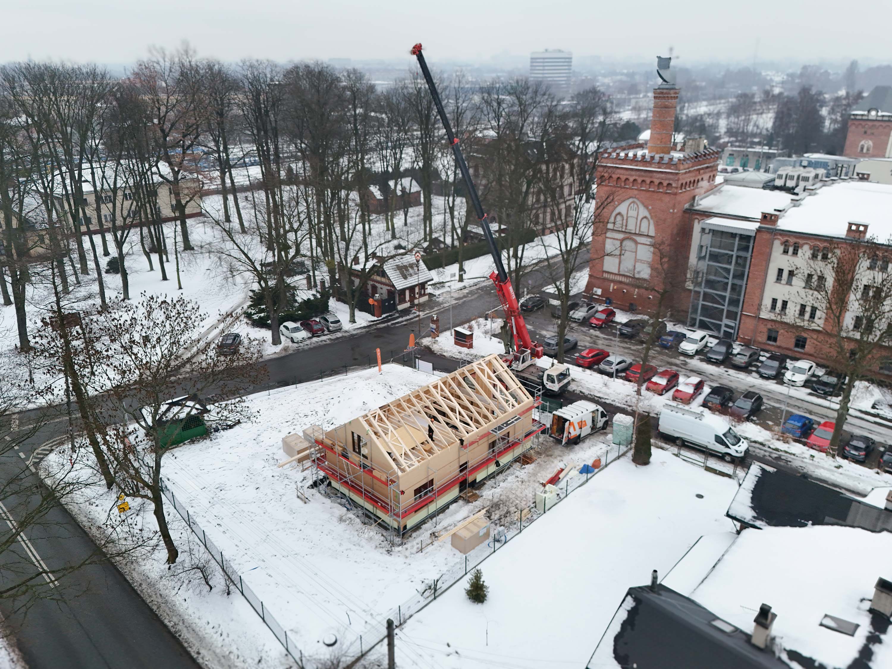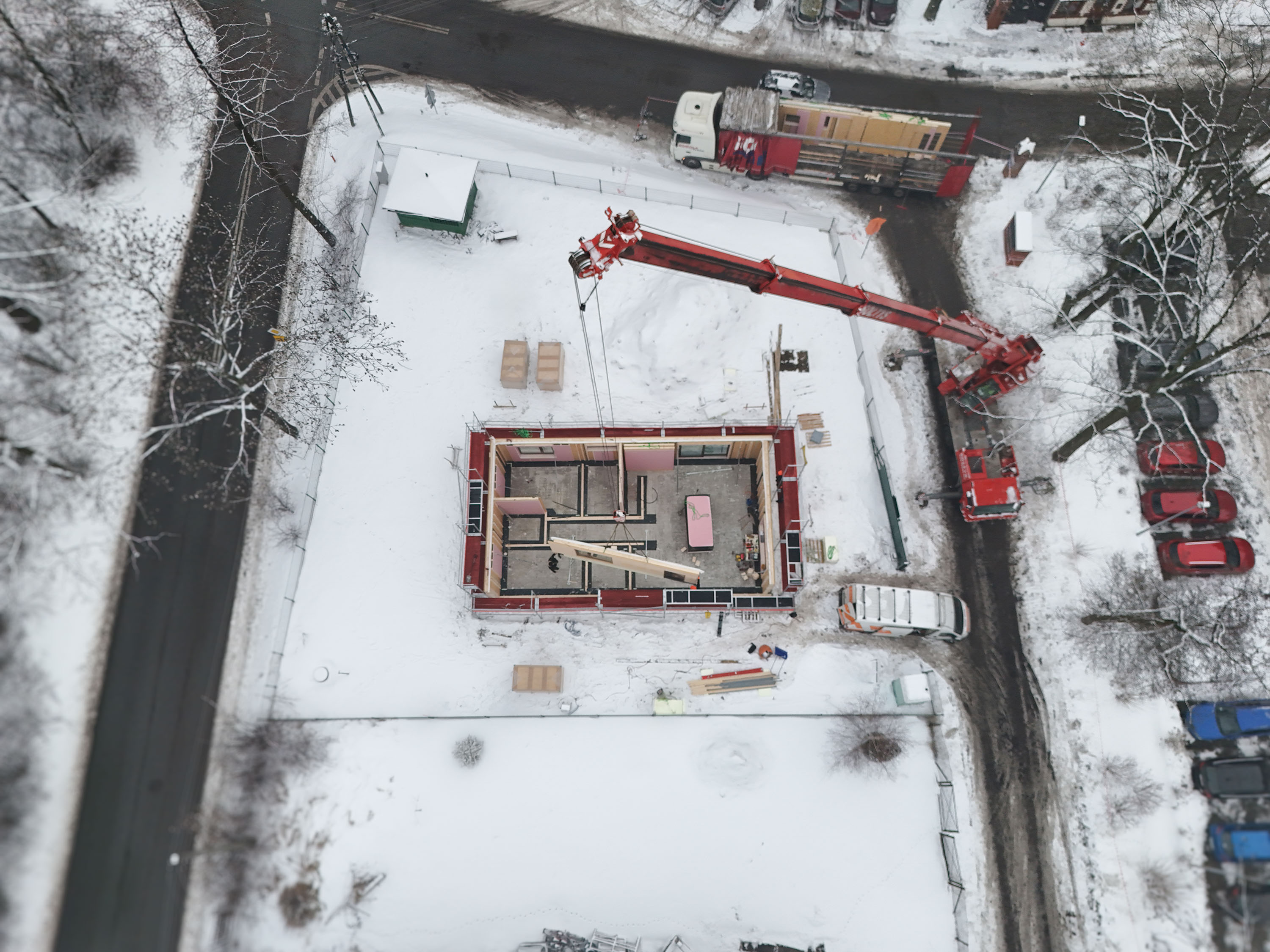 Środek zimy, śnieg na działce i precyzyjnie zaplanowana logistyka — te zdjęcia dobrze pokazują, jak w praktyce wygląda prefabrykowana realizacja SOLE 85 LOFT. Z lotu ptaka widać uporządkowany plac budowy i kolejne elementy układane w logiczną całość. Nie ma tu improwizacji: każdy panel, każda ściana i więźba dachowa trafiają na swoje miejsce w określonej kolejności. To moment, w którym projekt z rysunku technicznego zaczyna nabierać realnych proporcji.