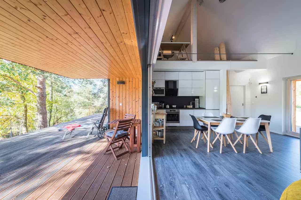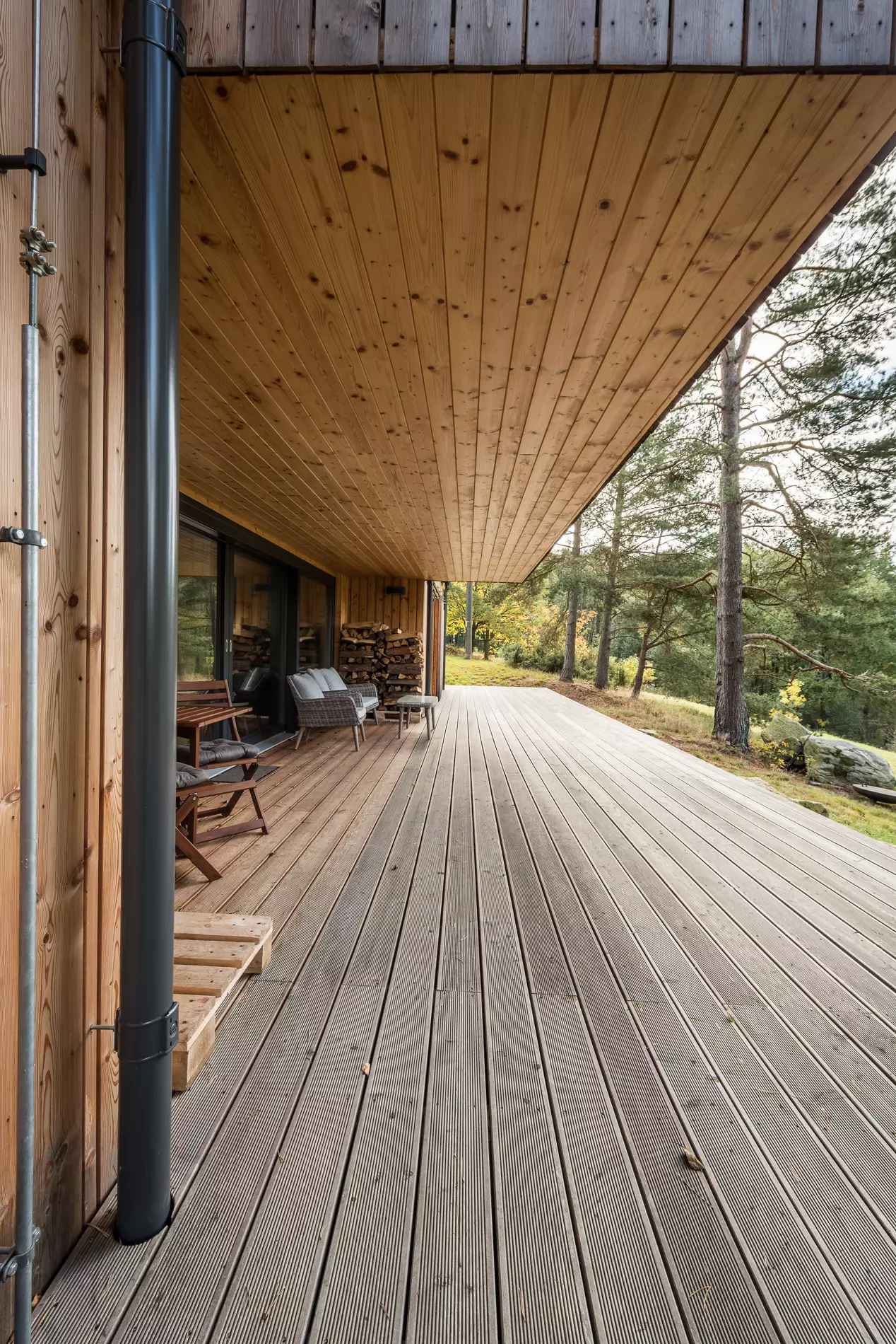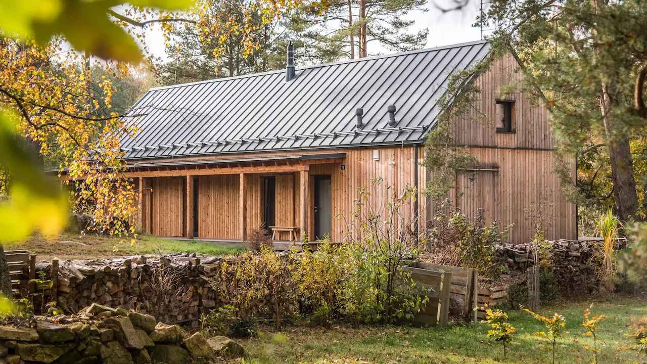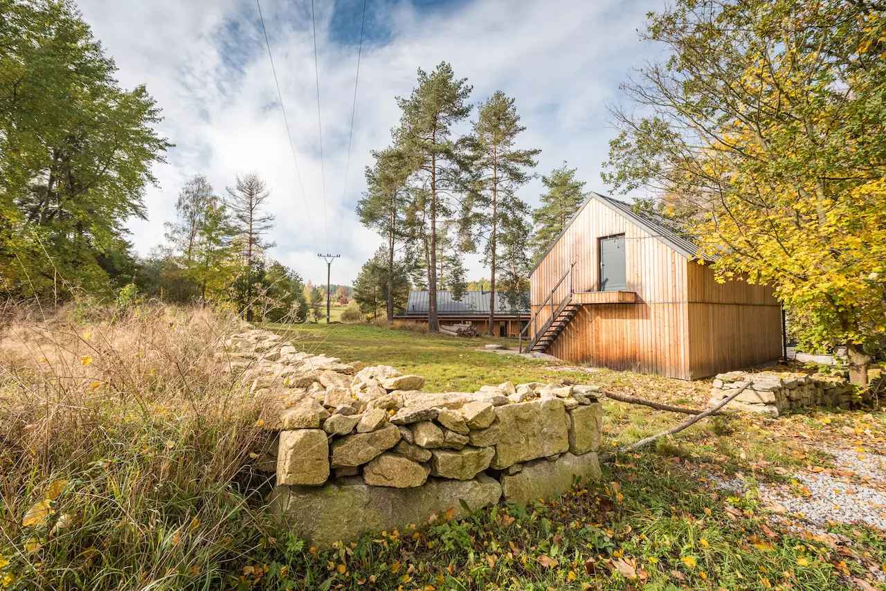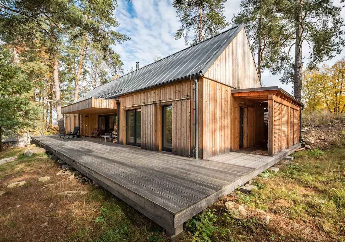 Zza sosen w Czeskiej Kanadzie wyłania się urokliwy drewniany dom, który harmonijnie wpisuje się w naturalny krajobraz lasów i strumieni. Leo i Martin spełnili swoje marzenie o idealnym weekendowym domu, w którym połączono funkcjonalność i estetykę skandynawskiego designu. Precyzyjna budowa i przemyślany projekt pozwoliły stworzyć przestrzeń o powierzchni użytkowej 195 m² z antresolą i tarasem, gdzie otwarta geometria wnętrza łączy się z otoczeniem. Ten dom, będący nowoczesną stodołą, łączy tradycyjne materiały drewniane z nowoczesnymi rozwiązaniami, tworząc komfortowe miejsce do odpoczynku przez cały rok.