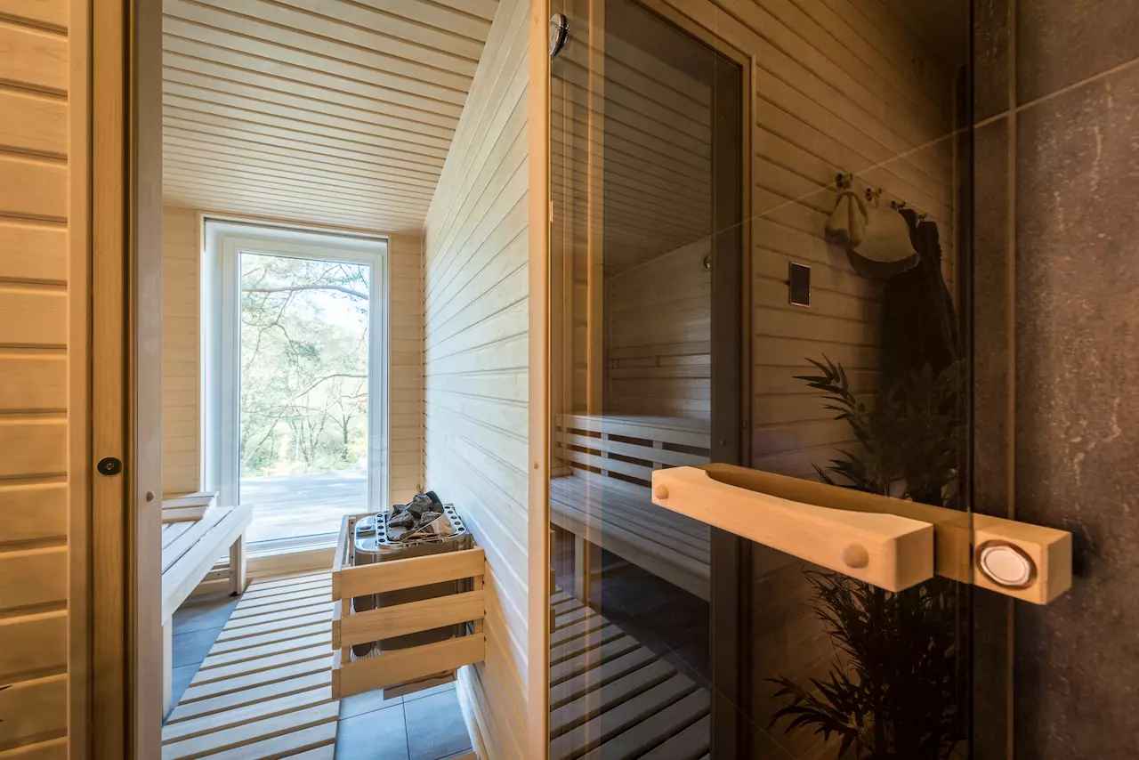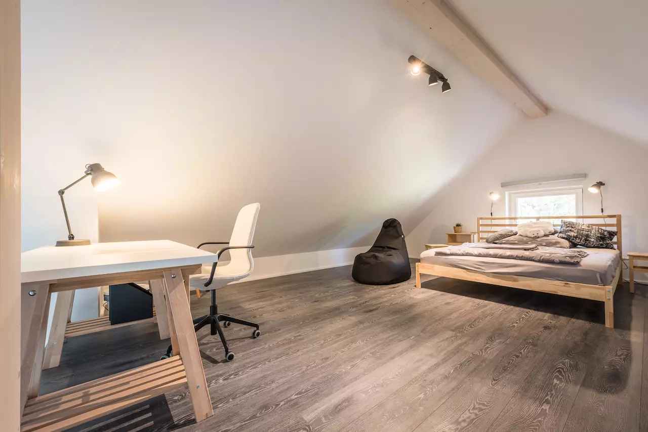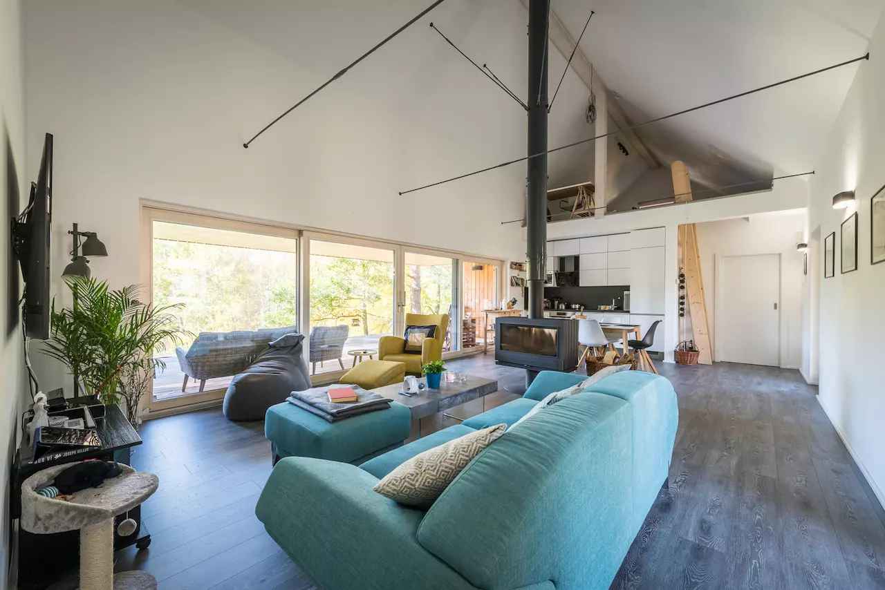 Dom wyposażono w ogrzewanie podłogowe, kominek oraz naturalną wentylację, co sprawia, że wnętrze jest komfortowe zarówno latem, jak i zimą. Każdy element domu – od otwartej przestrzeni, przez sypialnie, po saunę – został zaprojektowany z myślą o funkcjonalności i relaksie całej rodziny. Dodatkowy budynek gospodarczy z garażem i mieszkaniem gościnnym zapewnia prywatność i elastyczne możliwości użytkowania. Ta nowoczesna stodoła w pełni realizuje wizję harmonijnego weekendowego azylu w sercu natury, łącząc skandynawską prostotę z praktycznym komfortem.
