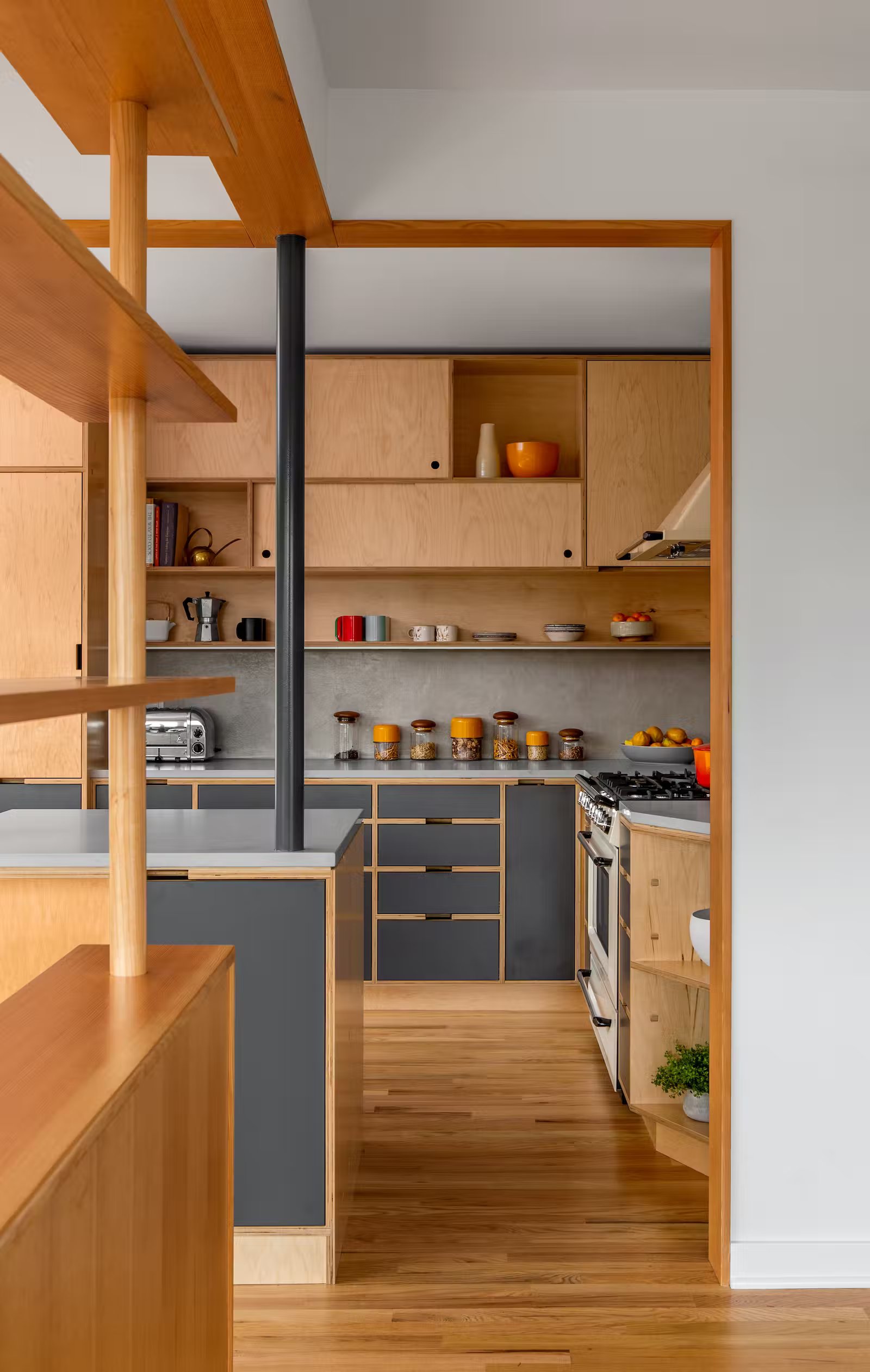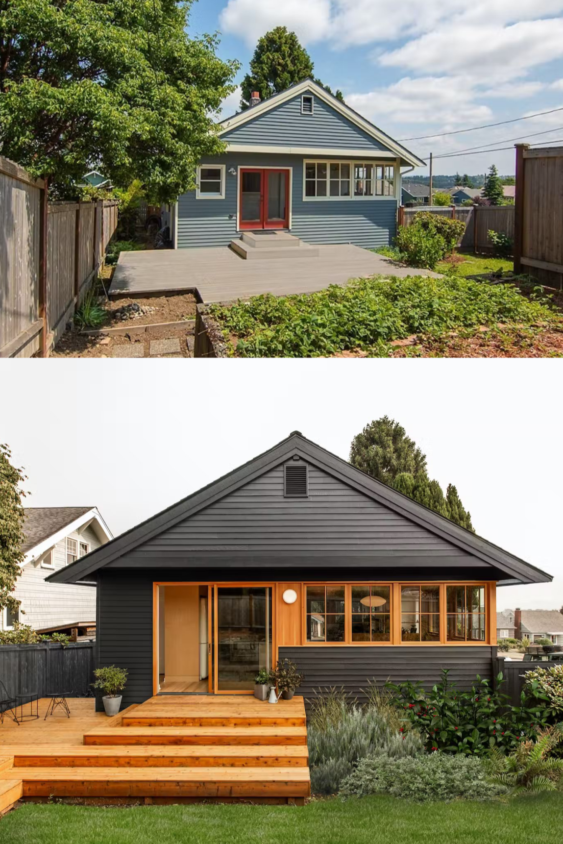 Bungalow o powierzchni 217 m² znajduje się na narożnej działce z widokiem na Mount Rainier. Pierwszym etapem modernizacji była przebudowa wejść – wąskie i strome schody zastąpiono szerszymi, pełniącymi także funkcję siedzisk. Dzięki temu dom zyskał bardziej naturalne połączenie z otoczeniem. Dodatkowa piwnica może pełnić rolę ADU, biura lub mieszkania dla gości, co zwiększa elastyczność wykorzystania przestrzeni.