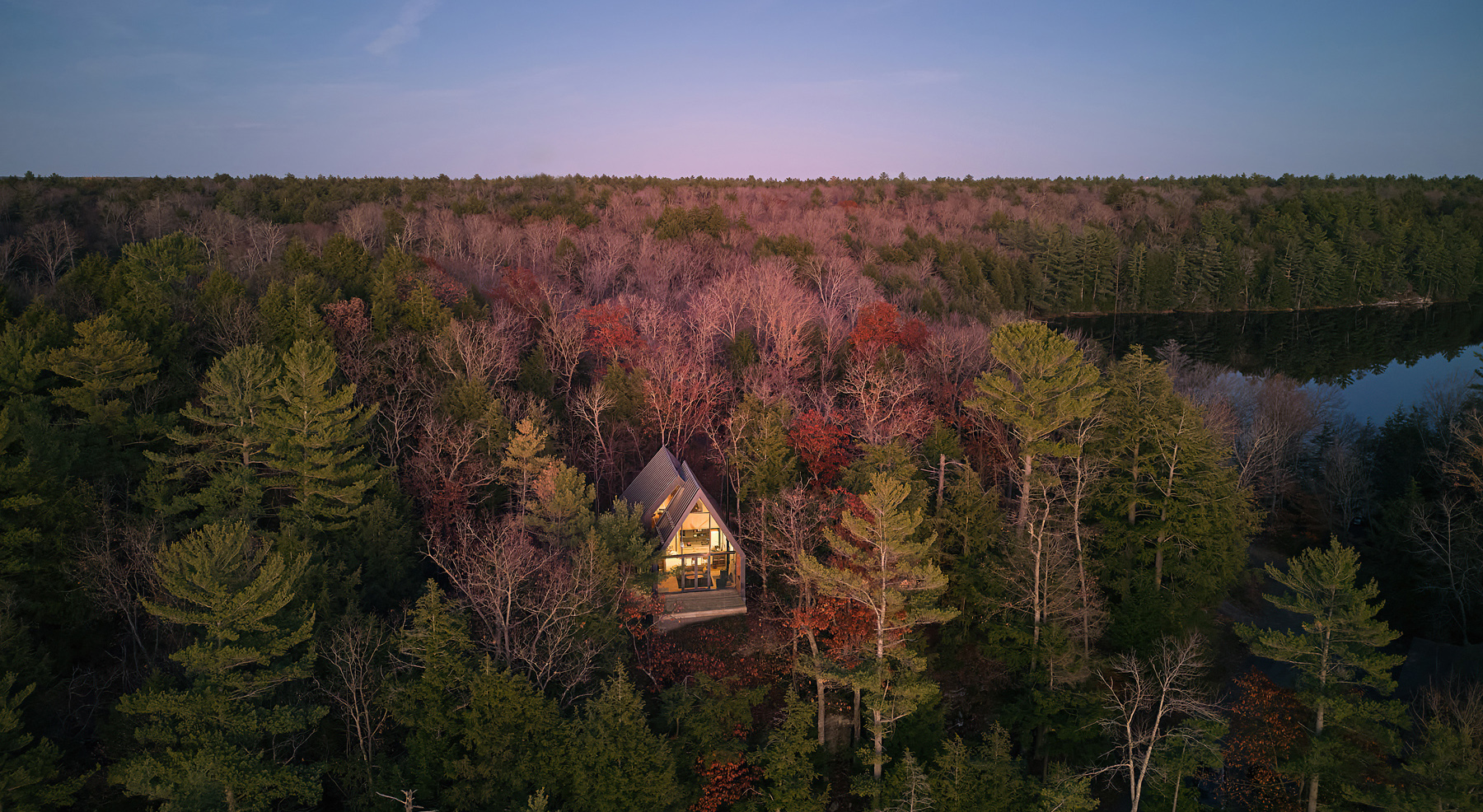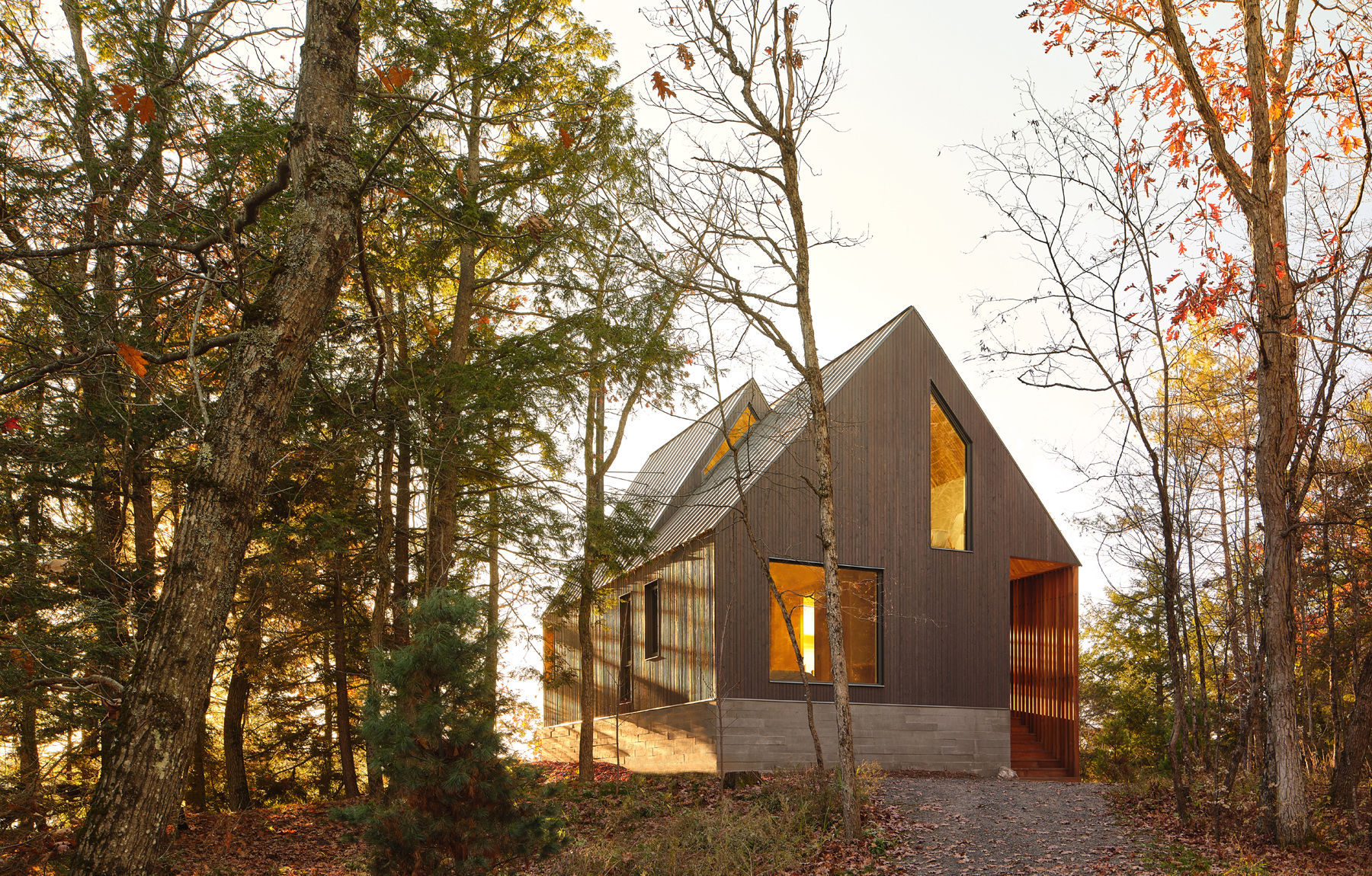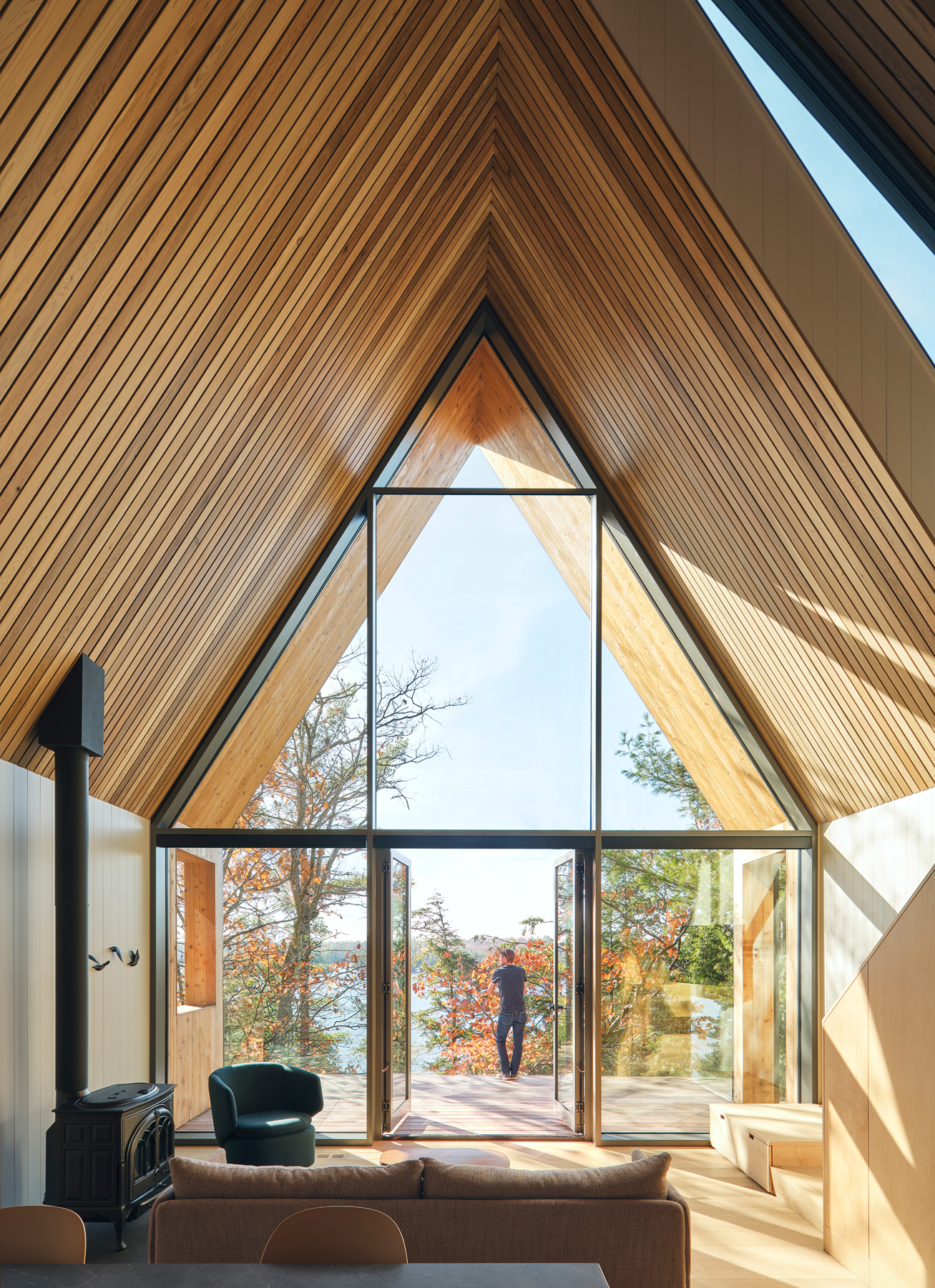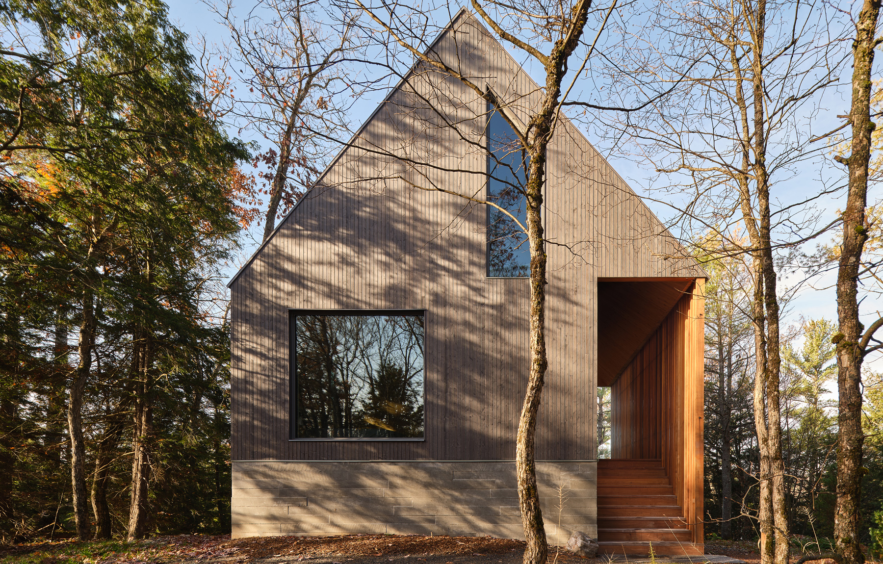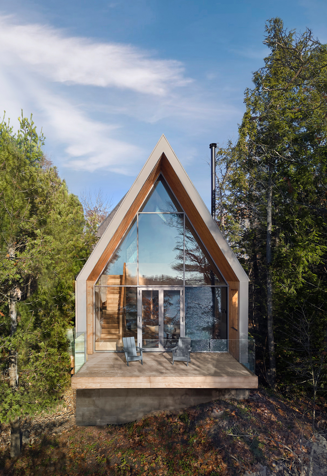Nowoczesna interpretacja tradycyjnego kształtu A-frame przywołuje klasyczną kabinę w lesie, wyróżniającą się przesuniętymi wolumenami dachu. Dach dwuspadowy tworzy możliwości dla okien, które oferują widoki na wierzchołki drzew z jednej strony i jezioro z drugiej, wpuszczając naturalne światło do wnętrza kabiny. Konstrukcja dachu generuje różne elewacje – wąską, przeszkloną fasadę skierowaną na jezioro oraz szerszą, bardziej opaczną elewację skierowaną na las. Wejście do kabiny zlokalizowane jest po stronie zachodniej i prowadzi przez chodnik z ekranem z listew cedrowych, które naśladują pnie drzew.