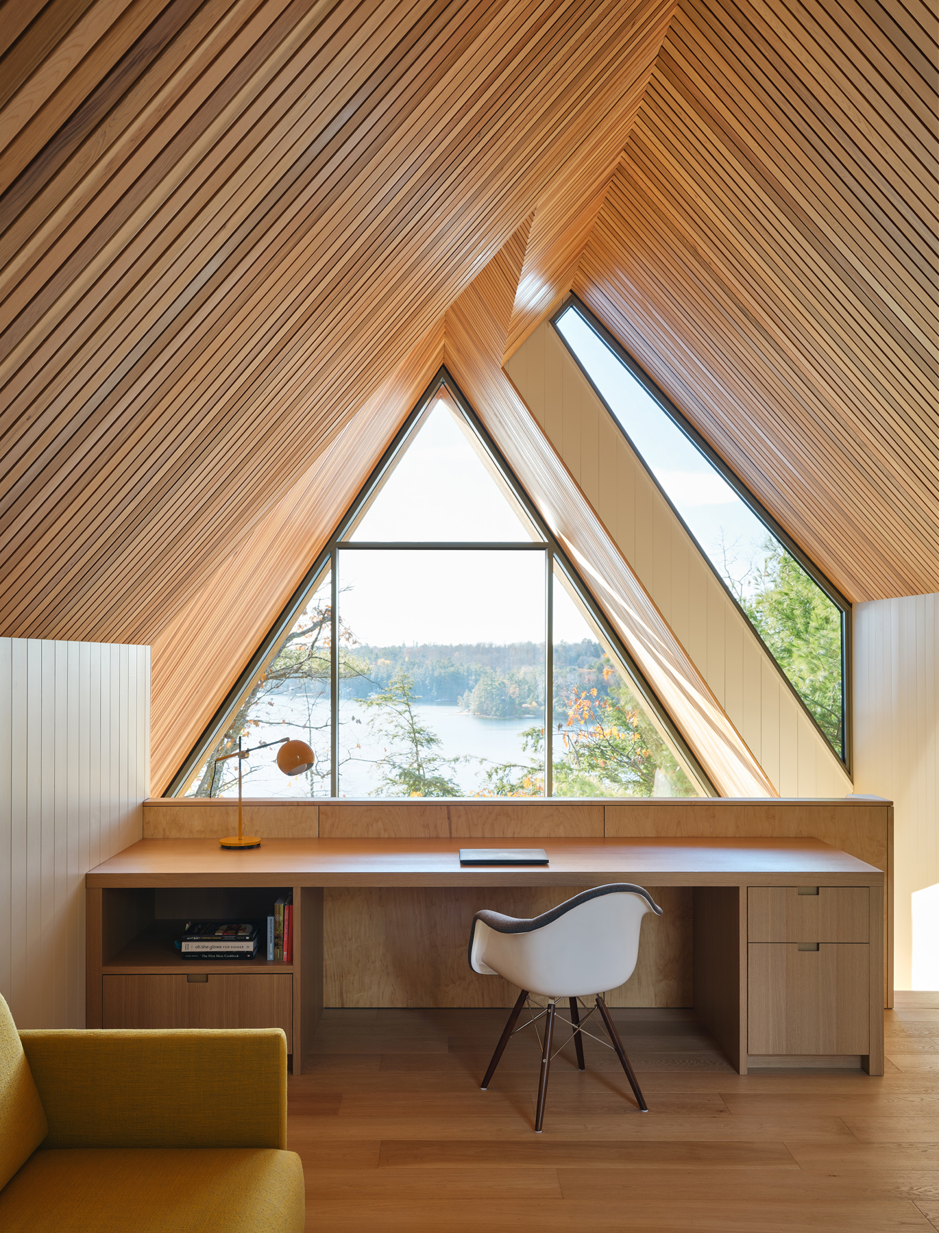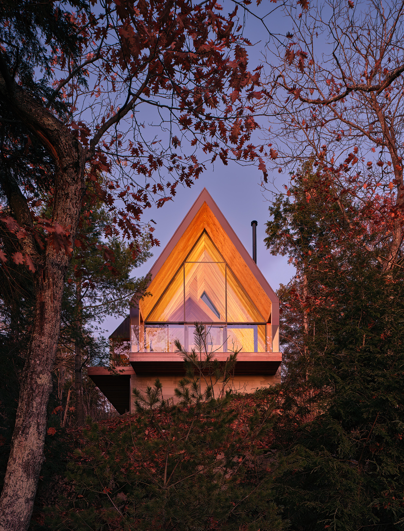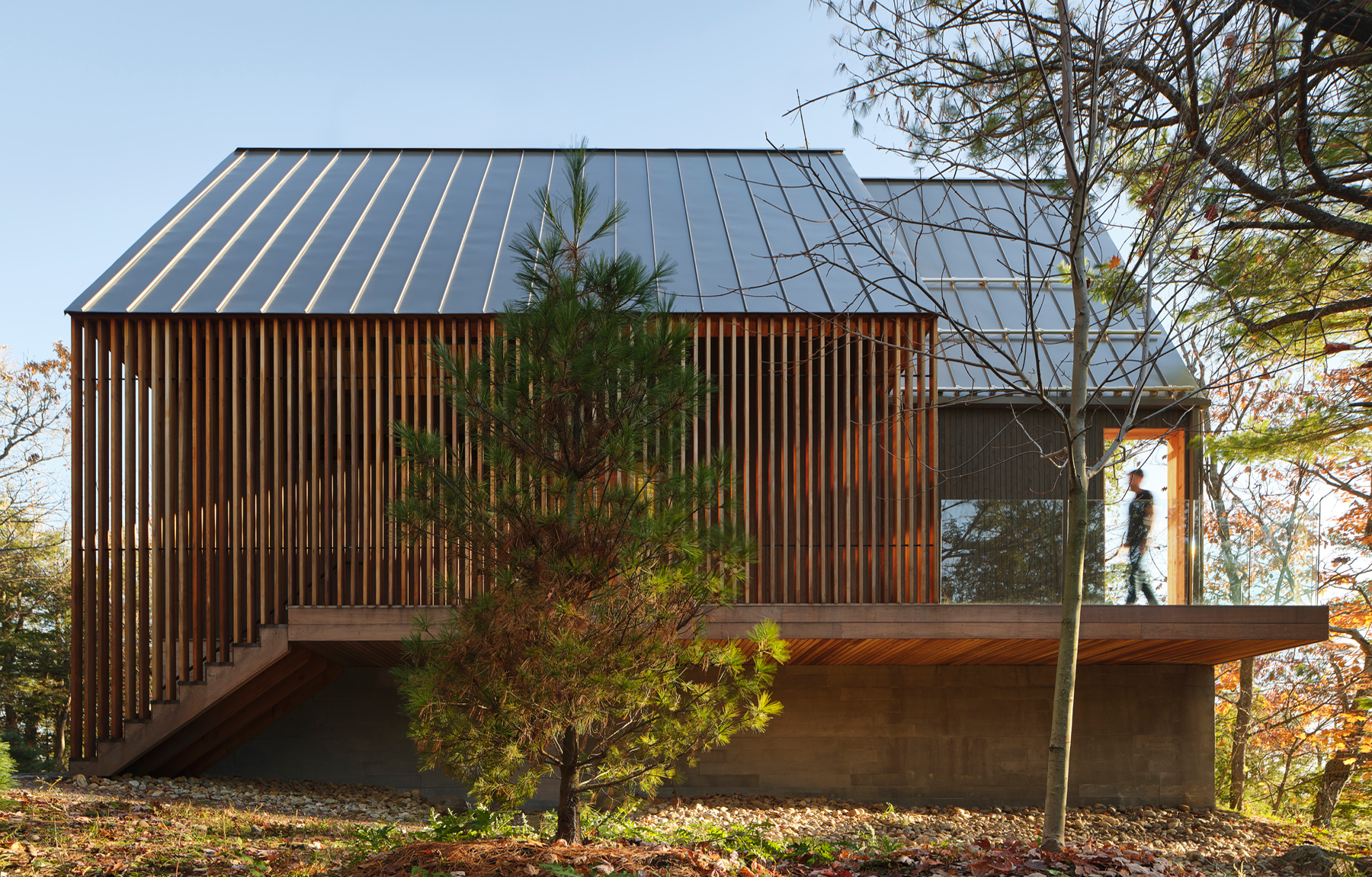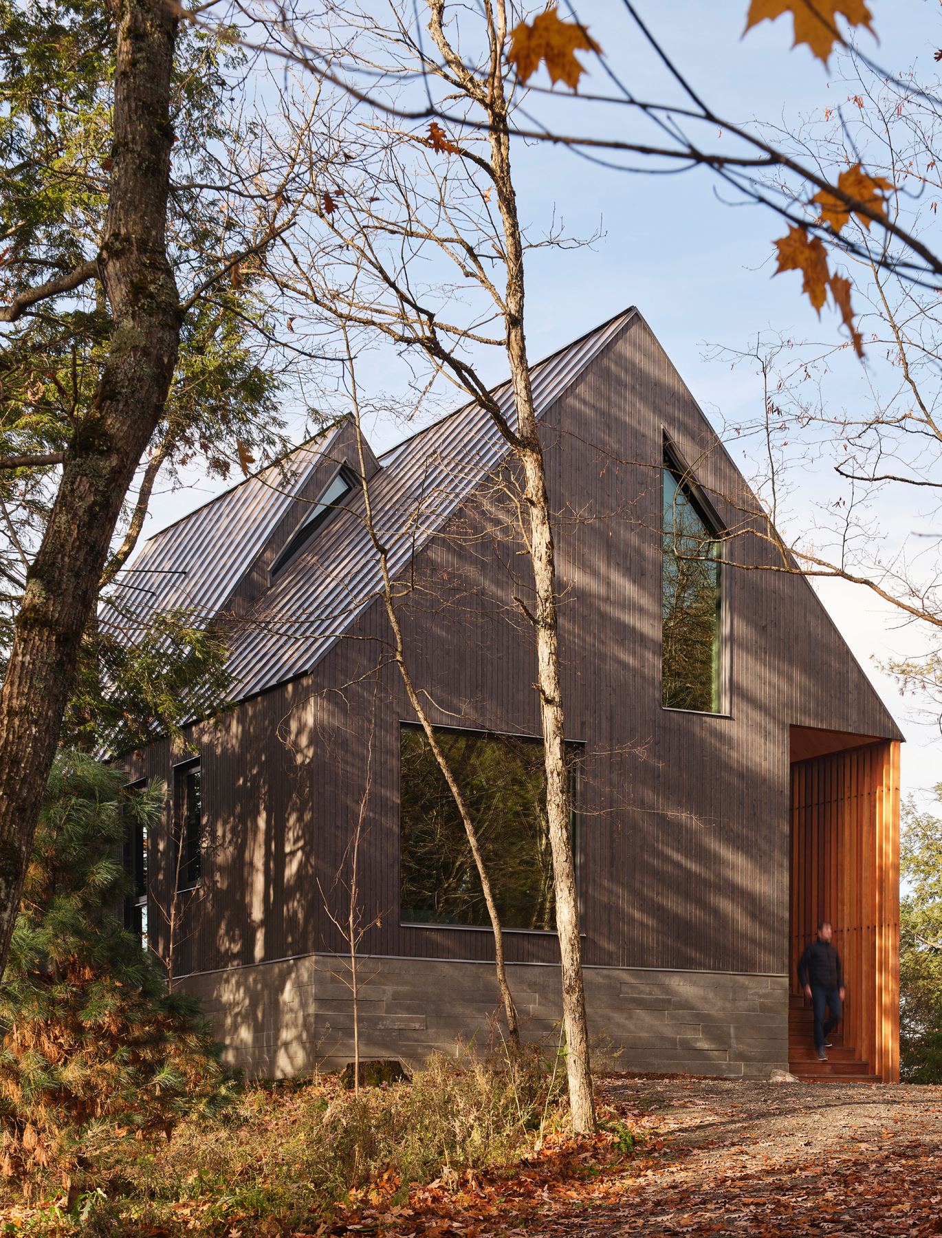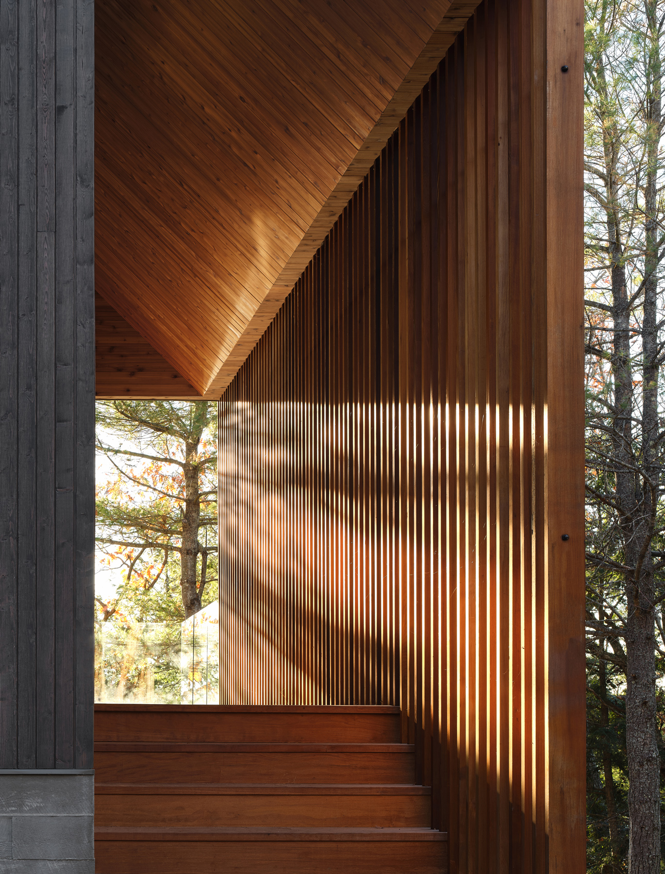 Nowoczesna interpretacja tradycyjnego kształtu A-frame przywołuje klasyczną kabinę w lesie, wyróżniającą się przesuniętymi wolumenami dachu. Dach dwuspadowy tworzy możliwości dla okien, które oferują widoki na wierzchołki drzew z jednej strony i jezioro z drugiej, wpuszczając naturalne światło do wnętrza kabiny. Konstrukcja dachu generuje różne elewacje – wąską, przeszkloną fasadę skierowaną na jezioro oraz szerszą, bardziej opaczną elewację skierowaną na las. Wejście do kabiny zlokalizowane jest po stronie zachodniej i prowadzi przez chodnik z ekranem z listew cedrowych, które naśladują pnie drzew.