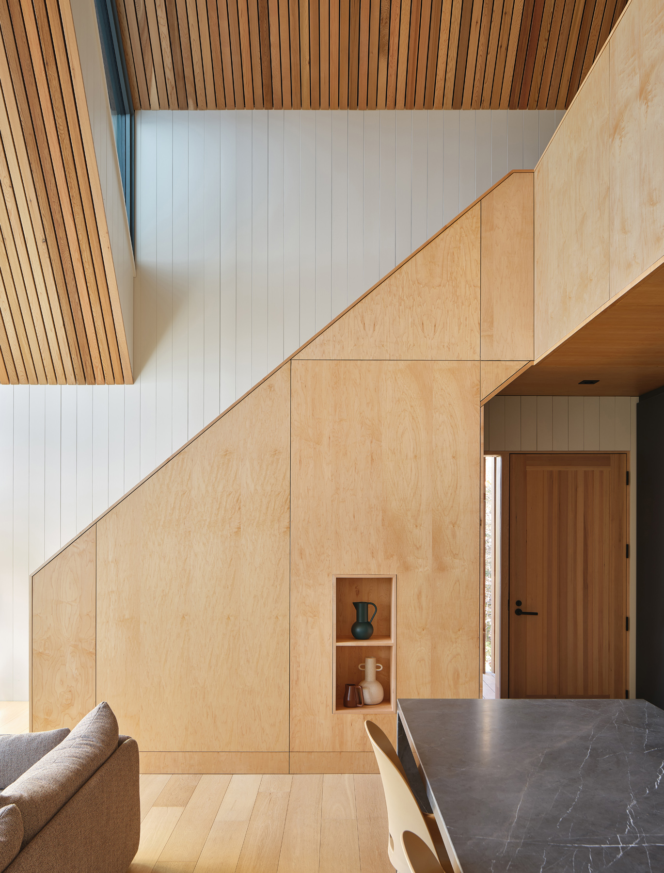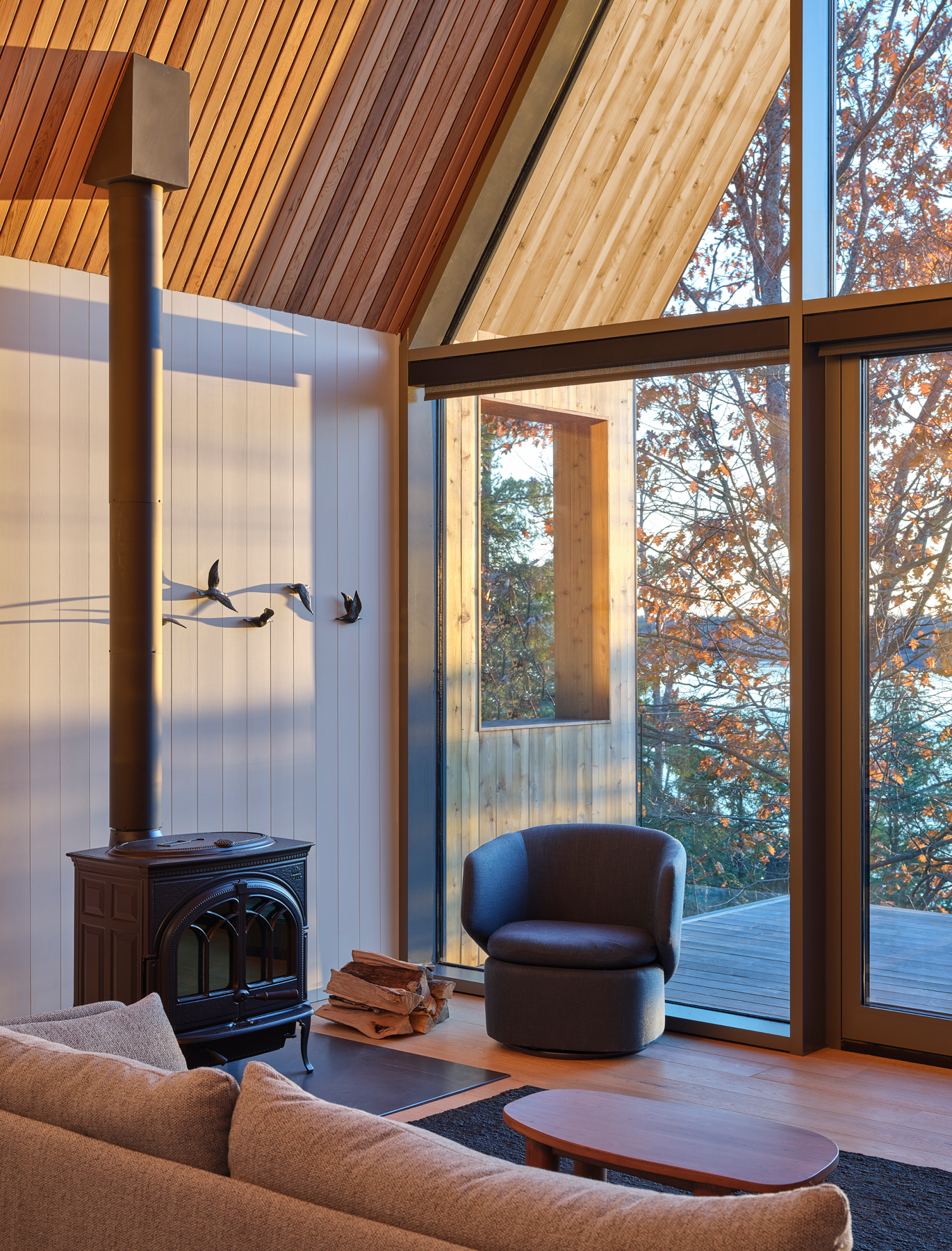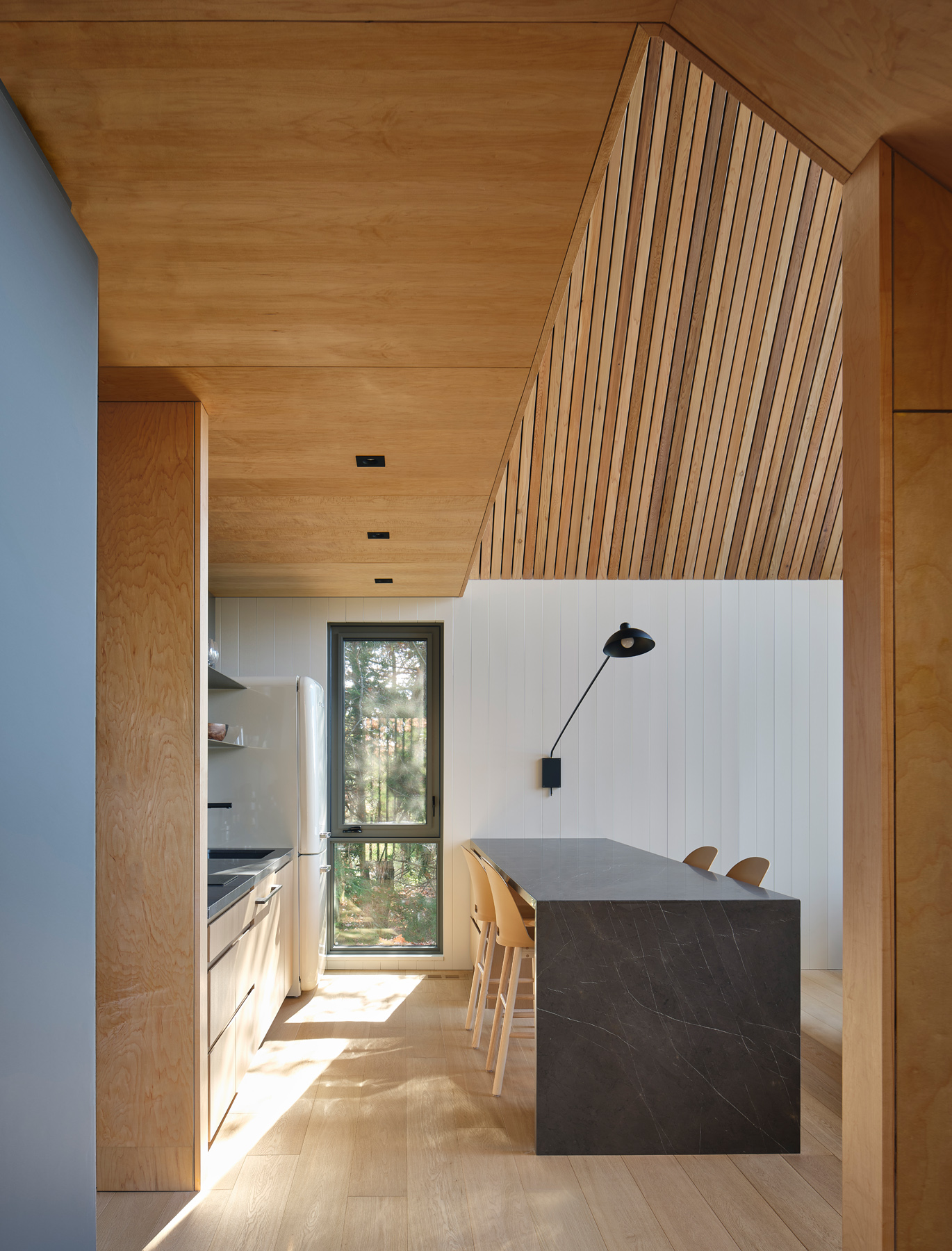 Naturalne materiały uzupełniają rustykalny krajobraz otaczający Bunkie. Szare okładziny drewniane kontrastują z naturalnymi cedrowymi okapami i ekranem przy wejściu. Wnętrze zawiera podłogi z dębu, sklejkę klonową i okładziny z cedru, uzupełnione ciemnymi ramami okiennymi, szarymi kamiennymi blatami i kolorowymi meblami.