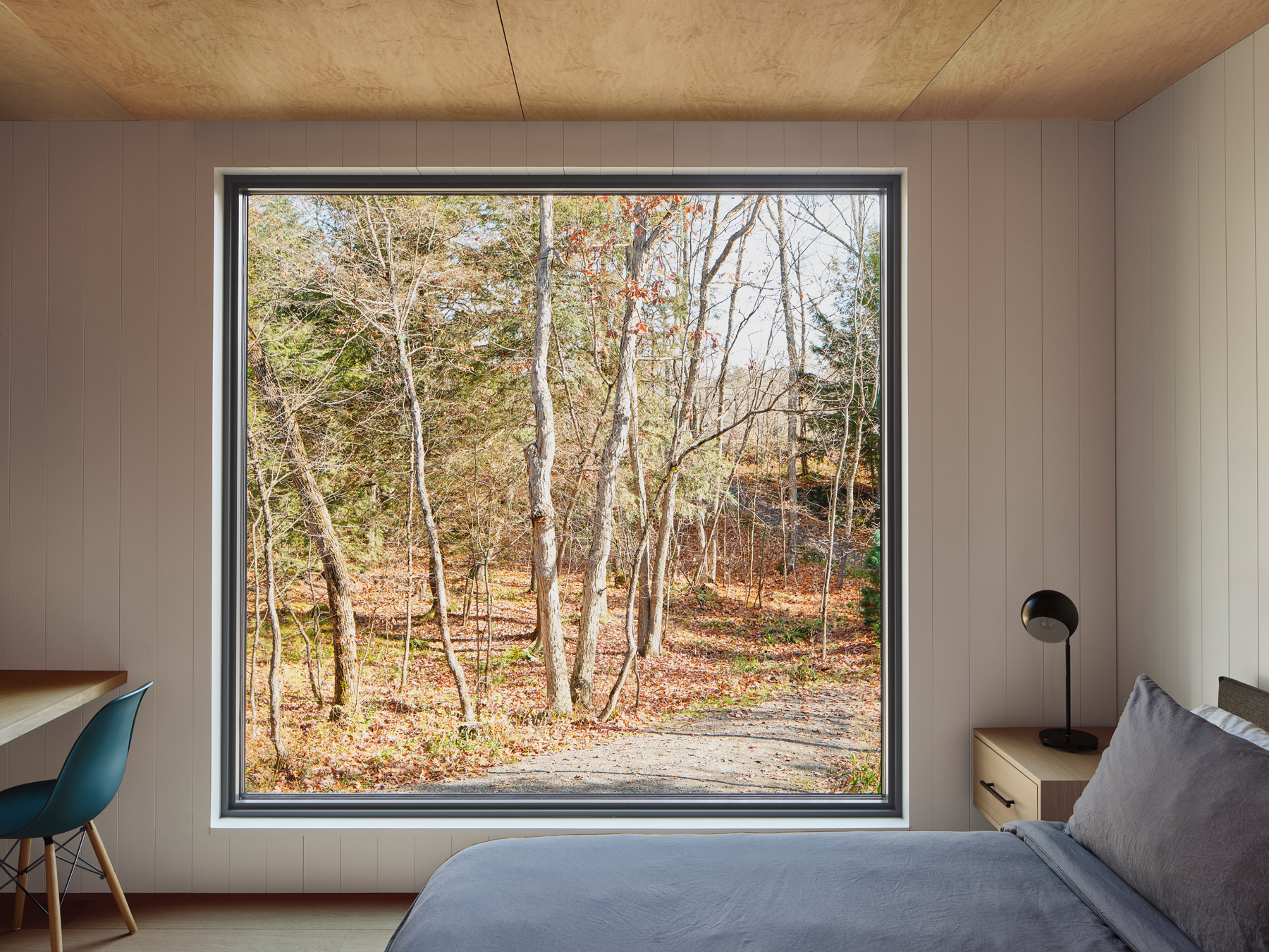 Wnętrze Bunkie, mimo kompaktowych rozmiarów, jest funkcjonalne. Małe wnęki zawierają półki na przechowywanie lub wbudowane ławki. Każda przestrzeń wewnętrzna oferuje widoki na otaczający las lub jezioro. Górna antresola posiada biurko z widokiem na przestrzeń dzienną i jezioro, a także dodatkowe miejsce do spania. Sypialnia z tyłu posiada duże okno z widokiem na las.