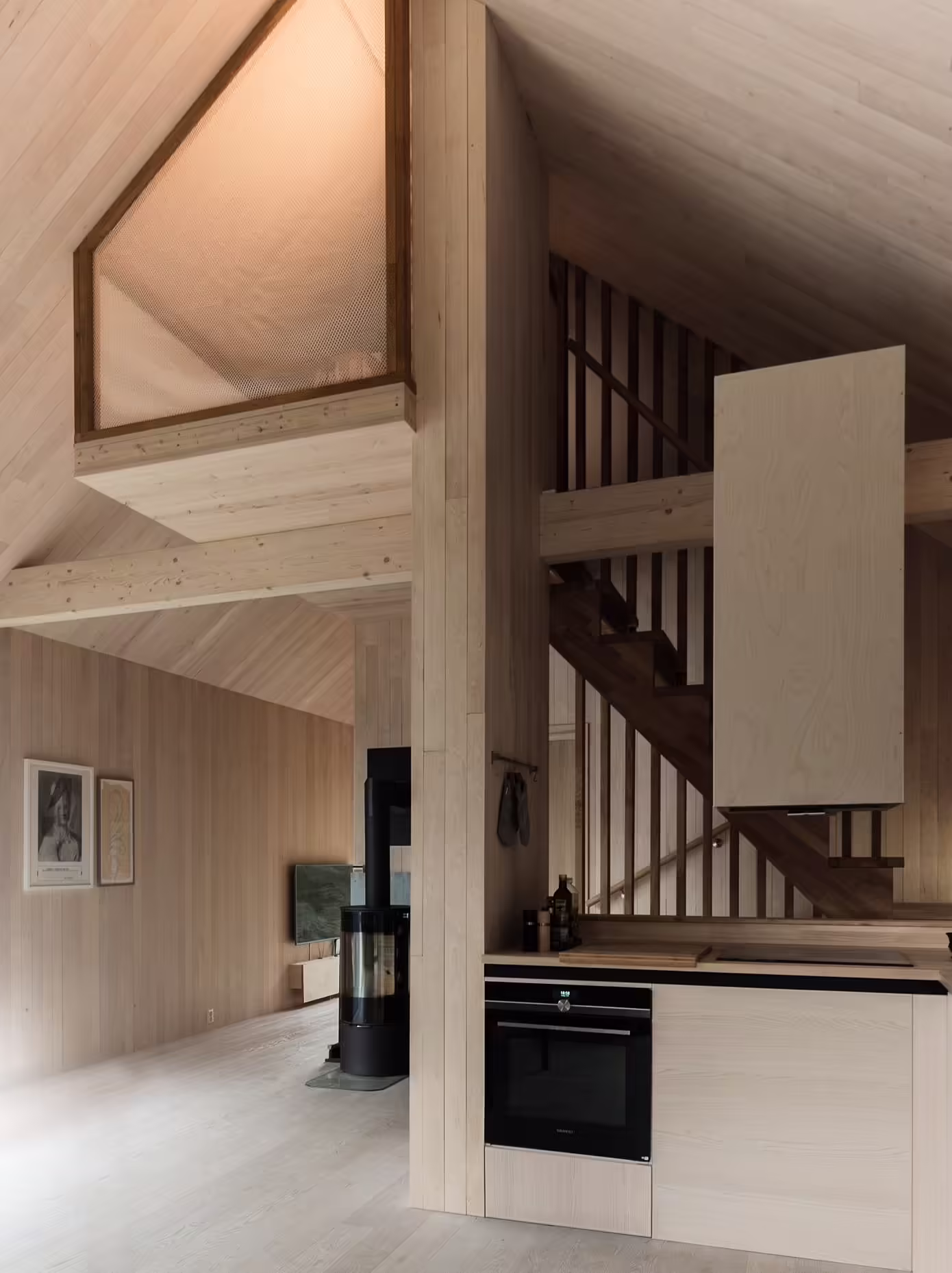 W jesiennym pejzażu ochrowe elewacje niemal znikają wśród brzóz i osik, wtapiając się w barwy norweskiego lasu. Długie kamienne mury, charakterystyczne dla tego krajobrazu, znajdują swoje przedłużenie w południowej, ochronnej ścianie budynku, która osłania go przed deszczem i wiatrem. To rozwiązanie jest typowe dla lokalnej tradycji budowlanej – masywna ściana staje się naturalną tarczą przed surowym klimatem fiordu. Z kolei skośna belka po przeciwnej stronie nie tylko pełni funkcję konstrukcyjną i podkreśla kierunek dominujących wiatrów, lecz także kryje w sobie system odprowadzania deszczówki.