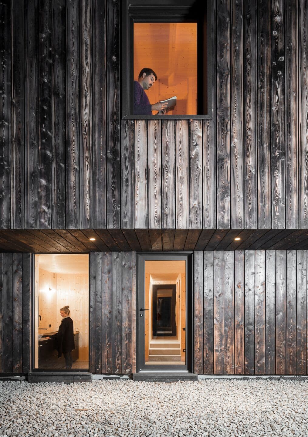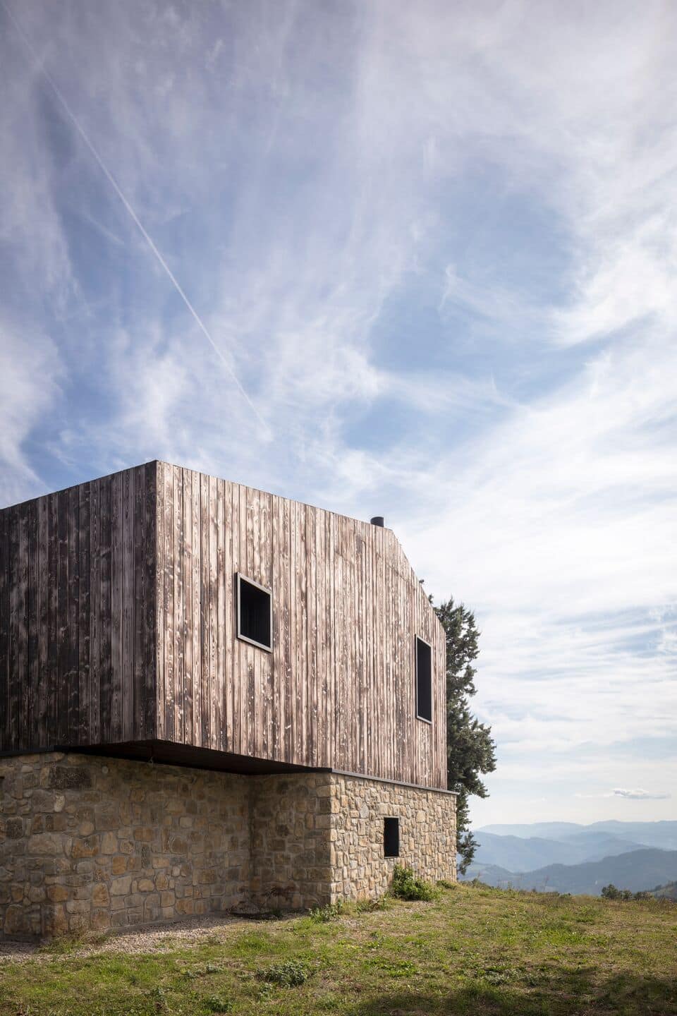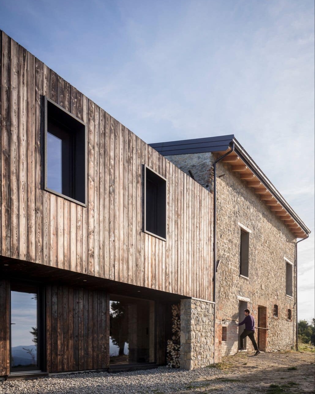 Nowa, dwupoziomowa bryła budynku została częściowo osadzona w ziemi, co wzmacnia jego relację z naturalnym otoczeniem. Kamienie z rozbiórki starego muru posłużyły do odtworzenia parterowej ściany, stanowiąc trwałe łącze między historią a współczesnością. Konstrukcja z paneli X-LAM na piętrze unosi się nad dolną częścią, zapewniając cień przestrzeni dziennej i chroniąc wnętrza przed przegrzewaniem. Elewacja z drewna palonego – wykonanego w starożytnej technice znanej w Apeninach i innych częściach świata – dodaje budynkowi autentyczności i ponadczasowego charakteru. To także nawiązanie do globalnego języka architektury naturalnej. Nowa część głównego budynku została funkcjonalnie połączona z odrestaurowaną stodołą, która obecnie pełni funkcję magazynu rolniczego, ale w przyszłości może stać się kolejną przestrzenią mieszkalną w stylu nowoczesnej stodoły.
