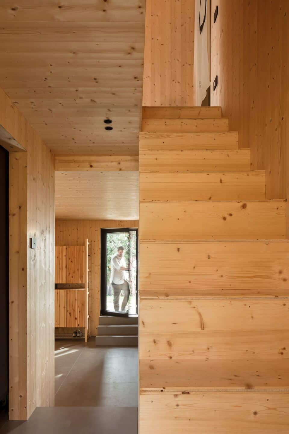 Wnętrze domu zaprojektowano zgodnie z zasadą maksymalnego wykorzystania naturalnego światła i energii. Pomieszczenia pomocnicze ulokowano po stronie północnej, natomiast przestrzenie mieszkalne od południa – z dużymi przeszkleniami zapewniającymi spektakularne widoki na dolinę. Wnętrza łączą beton, drewno jodłowe i mozaiki, co tworzy zrównoważony dialog materiałów – surowych i ciepłych zarazem. Budynek został ocieplony grubą warstwą wełny mineralnej, a jego system grzewczy i chłodzenia opiera się na powietrznej pompie ciepła zasilanej energią z paneli fotowoltaicznych, umieszczonych dyskretnie na dachu dawnej obory. Woda deszczowa jest magazynowana i wykorzystywana do nawadniania, a specjalna przydomowa oczyszczalnia oparta na systemie stawów zapewnia ekologiczne gospodarowanie ściekami. Całość stanowi przykład współczesnego domu górskiego, który nie tylko respektuje swoje otoczenie, ale również wzbogaca je swoją obecnością – dowód na to, że nowoczesna stodoła może być symbolem duchowej i ekologicznej harmonii.
