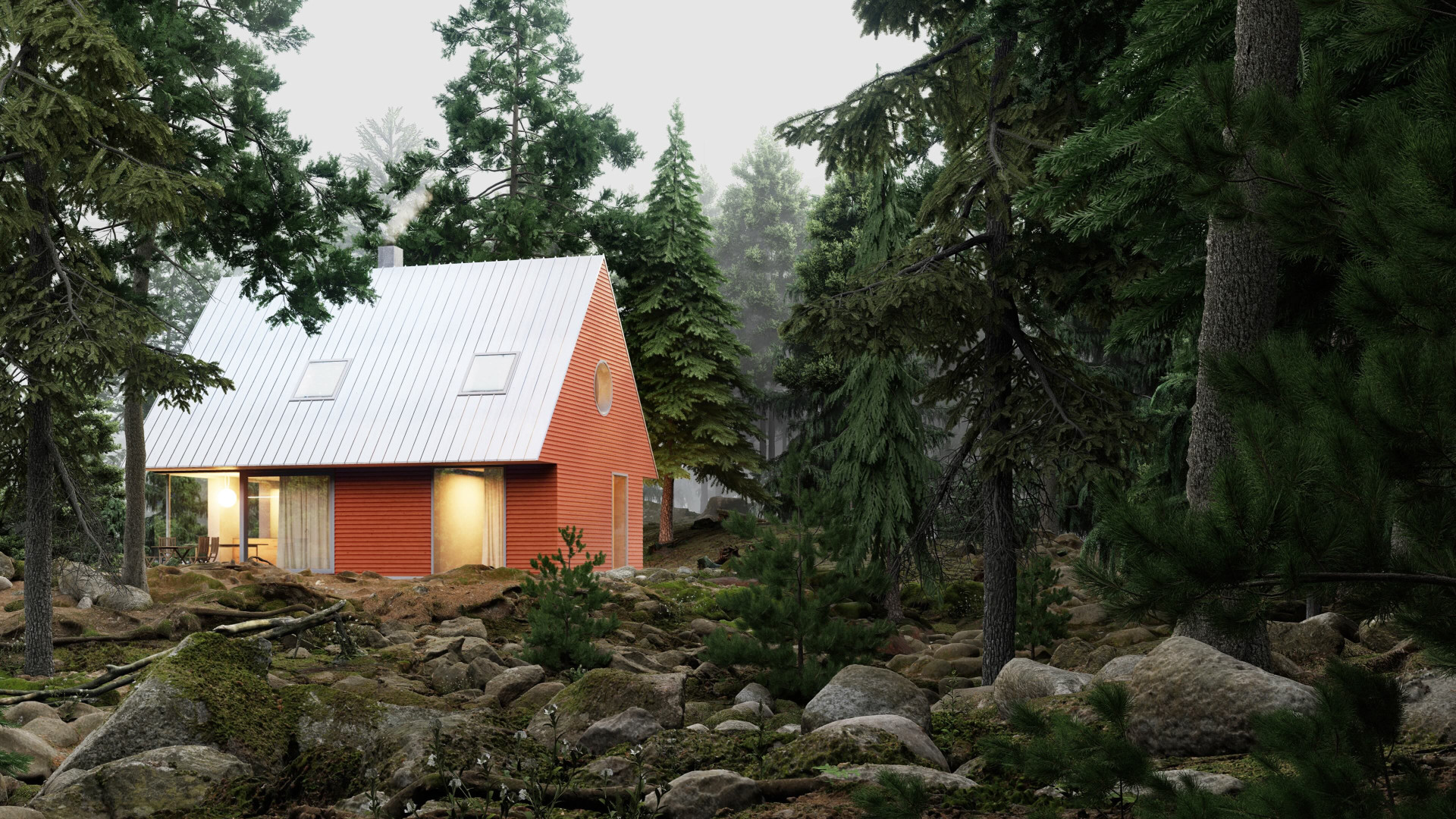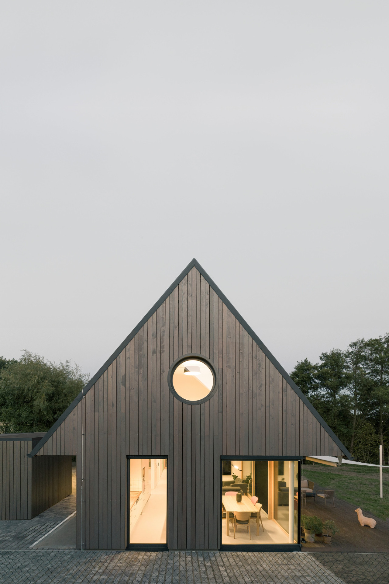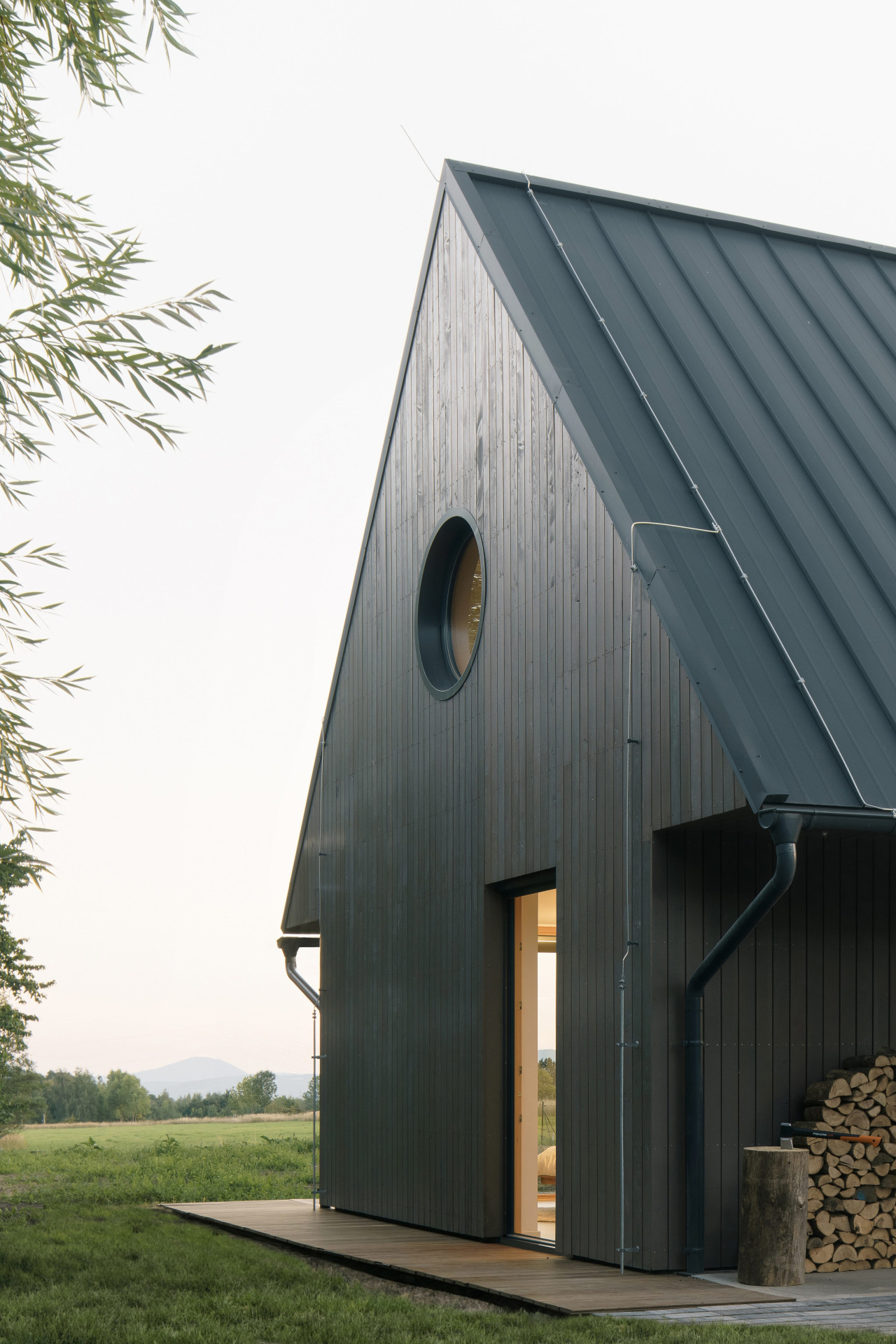 Pierwszy dom w systemie Cake Houses powstał w miejscowości Okrouhlá u Nového Boru. To budynek o klasycznej sylwetce z dwuspadowym dachem, zaprojektowany jako drewniana konstrukcja z elewacją z lazurowanego modrzewia. Parter mieści strefę dzienną z bezpośrednim wyjściem do ogrodu, sypialnię i łazienkę, natomiast na antresoli zaplanowano kolejne pokoje oraz drugą łazienkę.