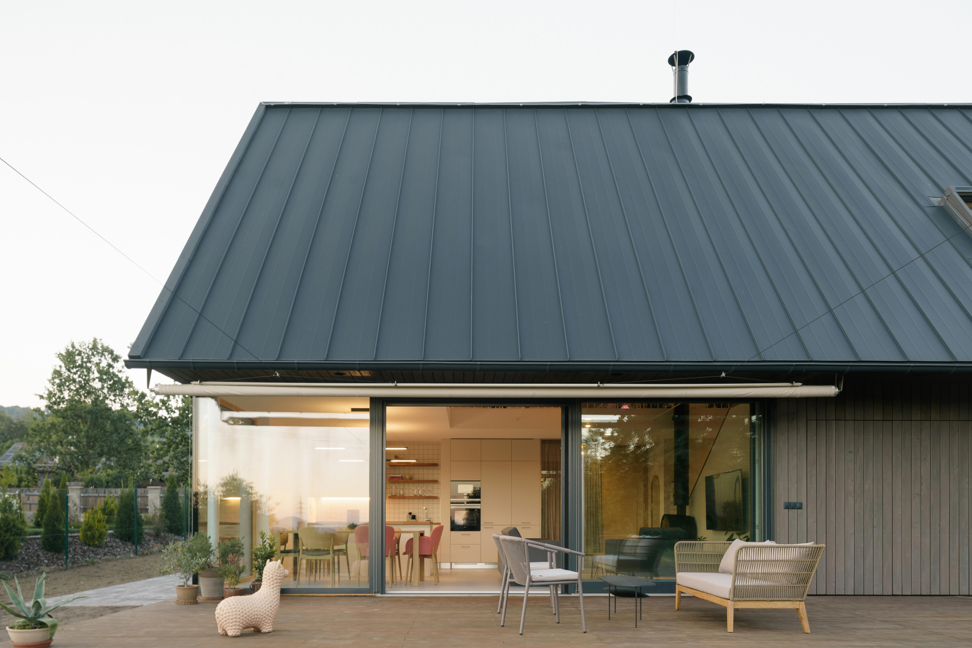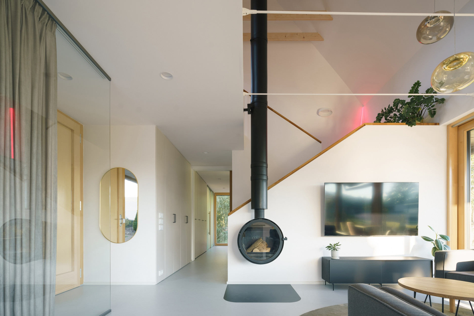 Duże przeszklenia naturalnie łączą wnętrze z otoczeniem, a układ przestrzenny pozbawiony jest ciemnych korytarzy, co podkreśla otwarty, współczesny charakter domu. To realizacja, która pokazuje potencjał systemu – elastycznego, ale opartego na spójnej architektonicznej idei.