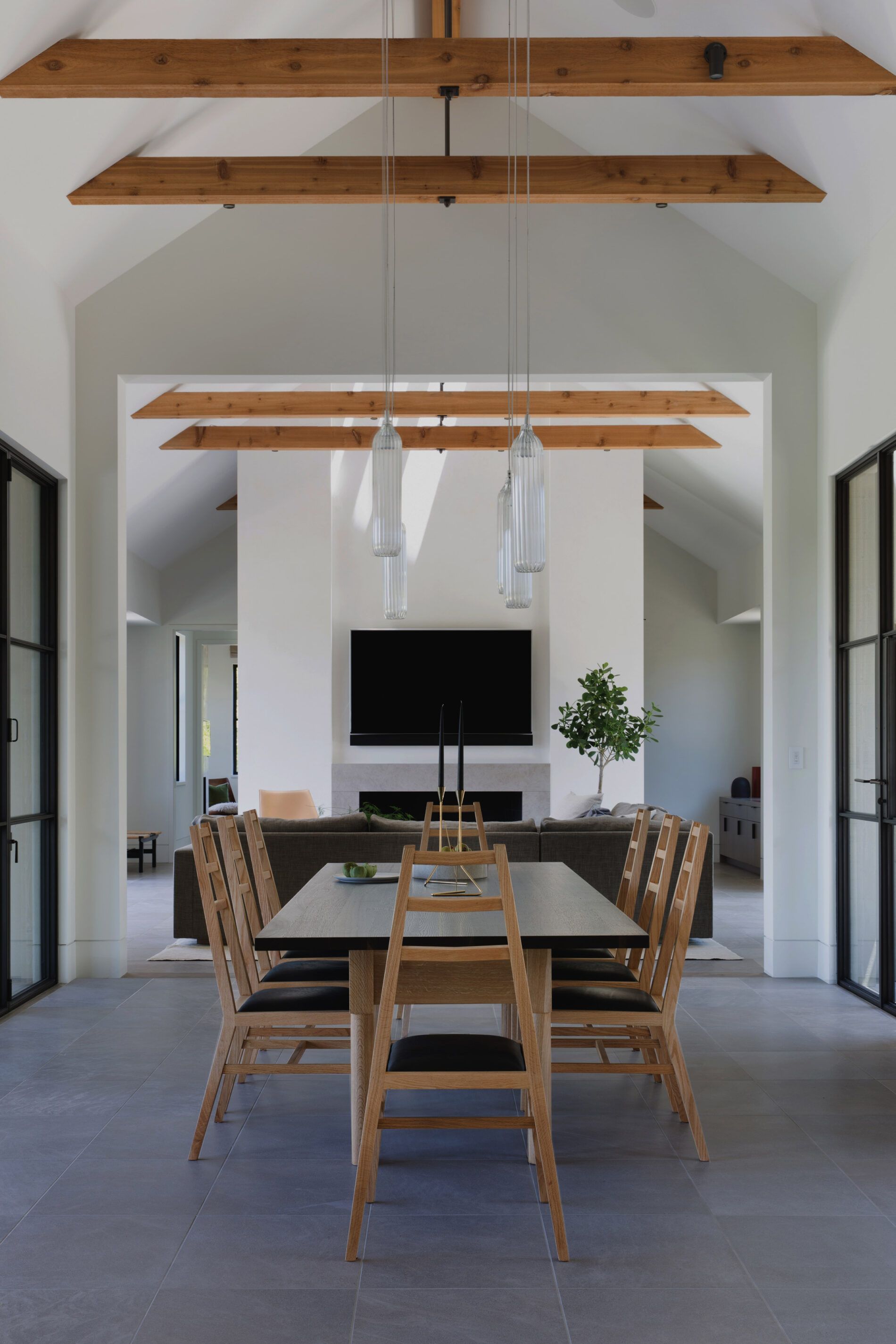 Na przestronnej działce powstał dom główny, domek gościnny, studio pilates z garażem oraz budynek przy basenie. Architekci inspirowali się lokalną winnicą Constant-Diamond Mountain i postawili na bryły z dwuspadowym dachem, które formą nawiązują do nowoczesnej stodoły. Zorganizowane wokół dziedzińców i tarasów, budynki wpisują się w krajobraz i tworzą spójną, funkcjonalną przestrzeń.