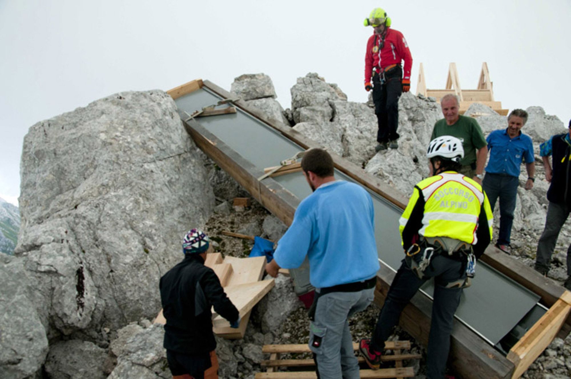 Chata o powierzchni zaledwie 16 m² została wykonana w całości z prefabrykowanych paneli X-Lam i posadowiona na sześciu betonowych kolumnach, unoszących konstrukcję ponad skalistym podłożem. Projekt uwzględnia ekstremalne warunki klimatyczne – zimą trzy elewacje są całkowicie zasypane śniegiem, a dostęp do wnętrza możliwy jest wyłącznie od nasłonecznionej strony południowej. Elementy budynku zostały precyzyjnie wycięte na obrabiarkach CNC, ponumerowane i przetransportowane śmigłowcem na miejsce montażu. W realizację zaangażowani byli budowlańcy firmy Diemmelegno, ratownicy górscy oraz przyjaciele Luci Vuericha. Dzięki tej współpracy powstało bezpieczne, trwałe i energooszczędne schronienie górskie, służące turystom zarówno zimą, jak i latem, w pełnej ciszy i bliskości alpejskiej natury.